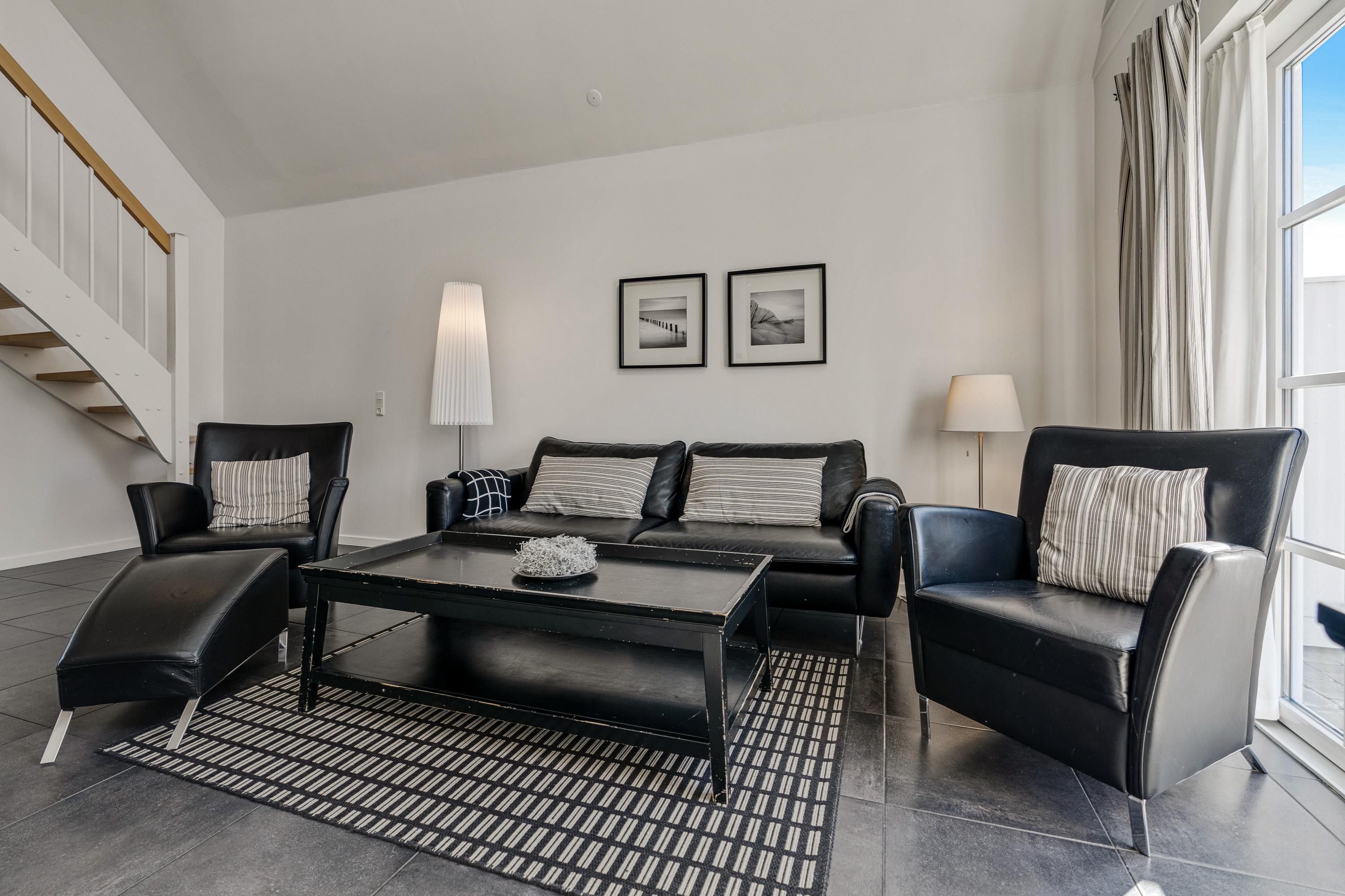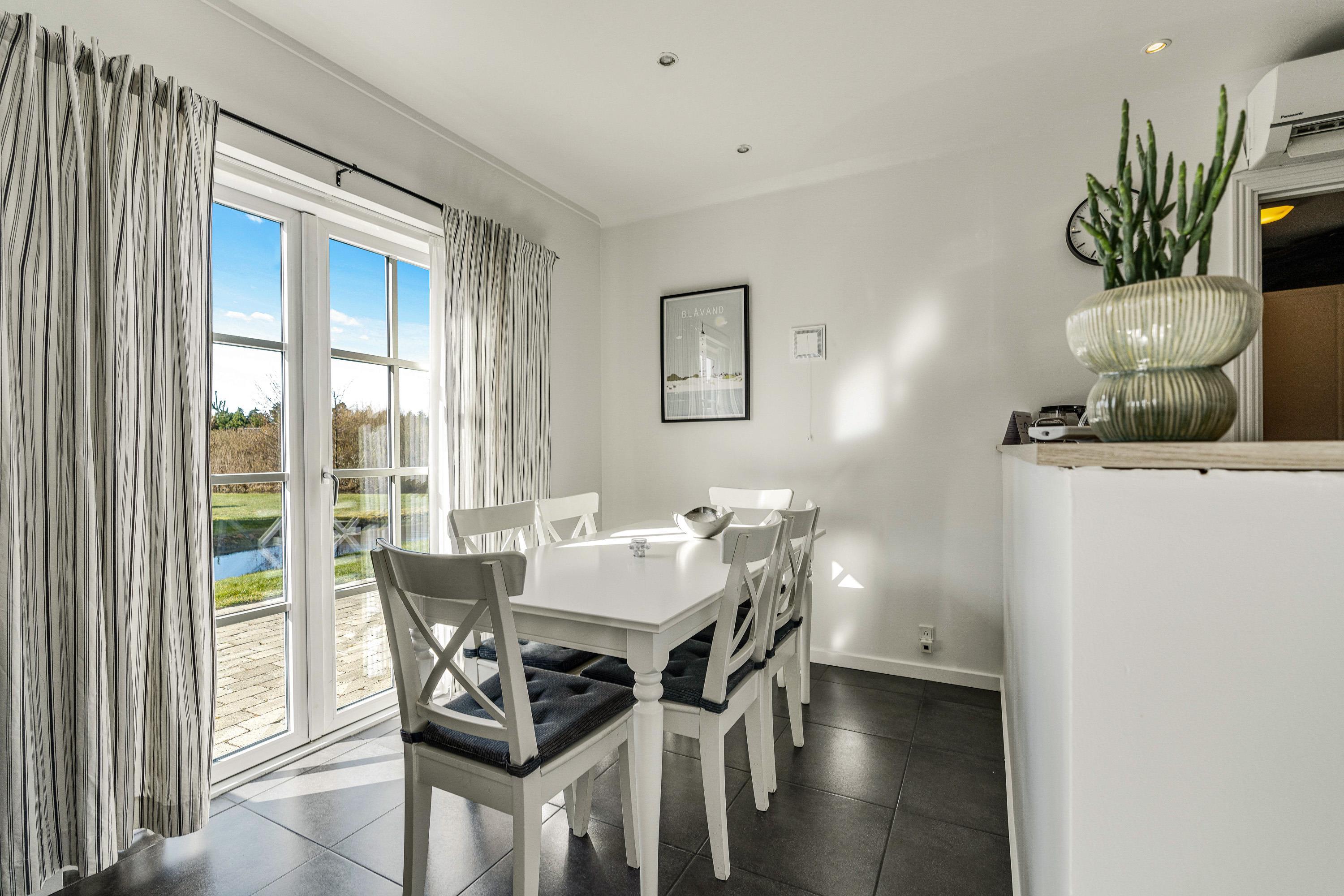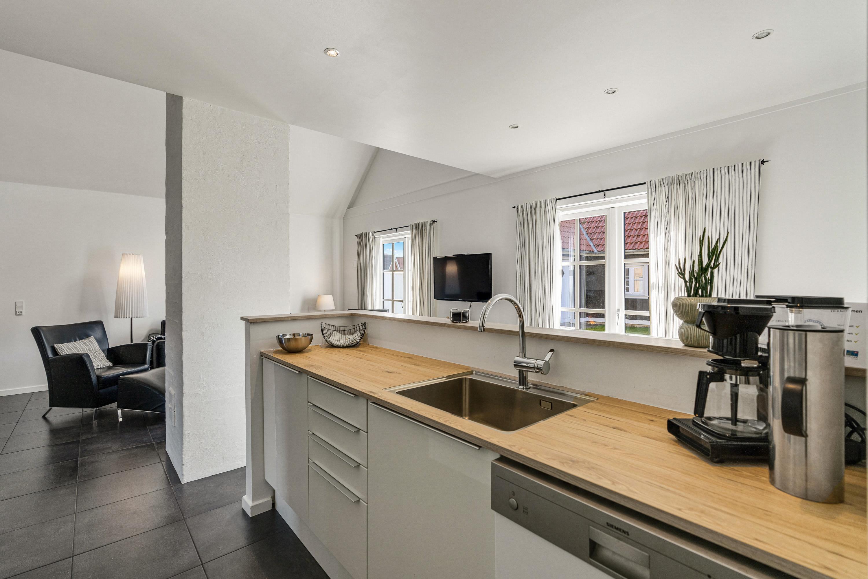 Så snart I træder indenfor, vil I føle jer godt tilpas i de moderne og stilfulde omgivelser. De hvide og sorte farver symboliserer ro, og intet er overladt til tilfældighederne. Det lyse og moderne køkken er udstyret med alt, hvad I har brug for, når I skal tilberede lækre feriemåltider, og opvaskemaskinen gør oprydningen overskuelig efterfølgende.