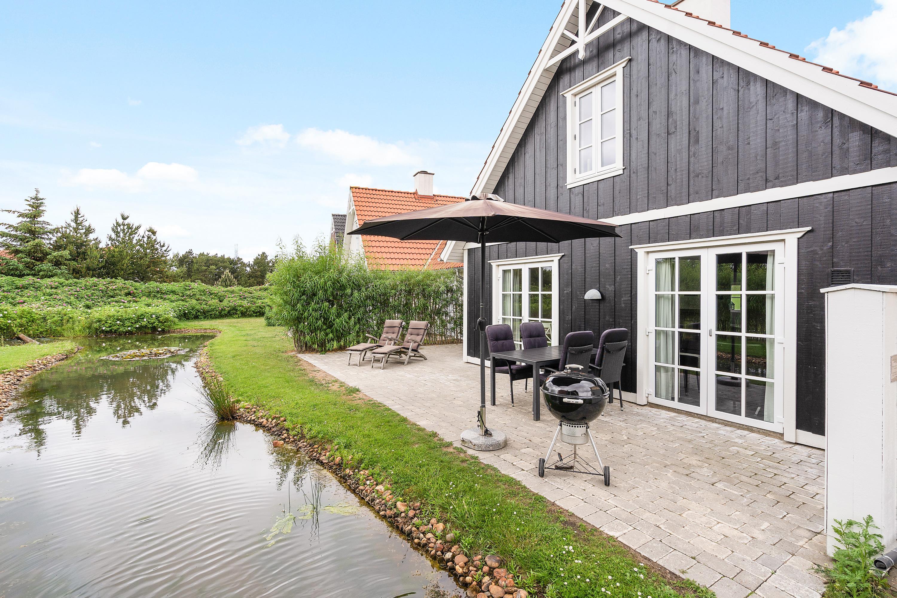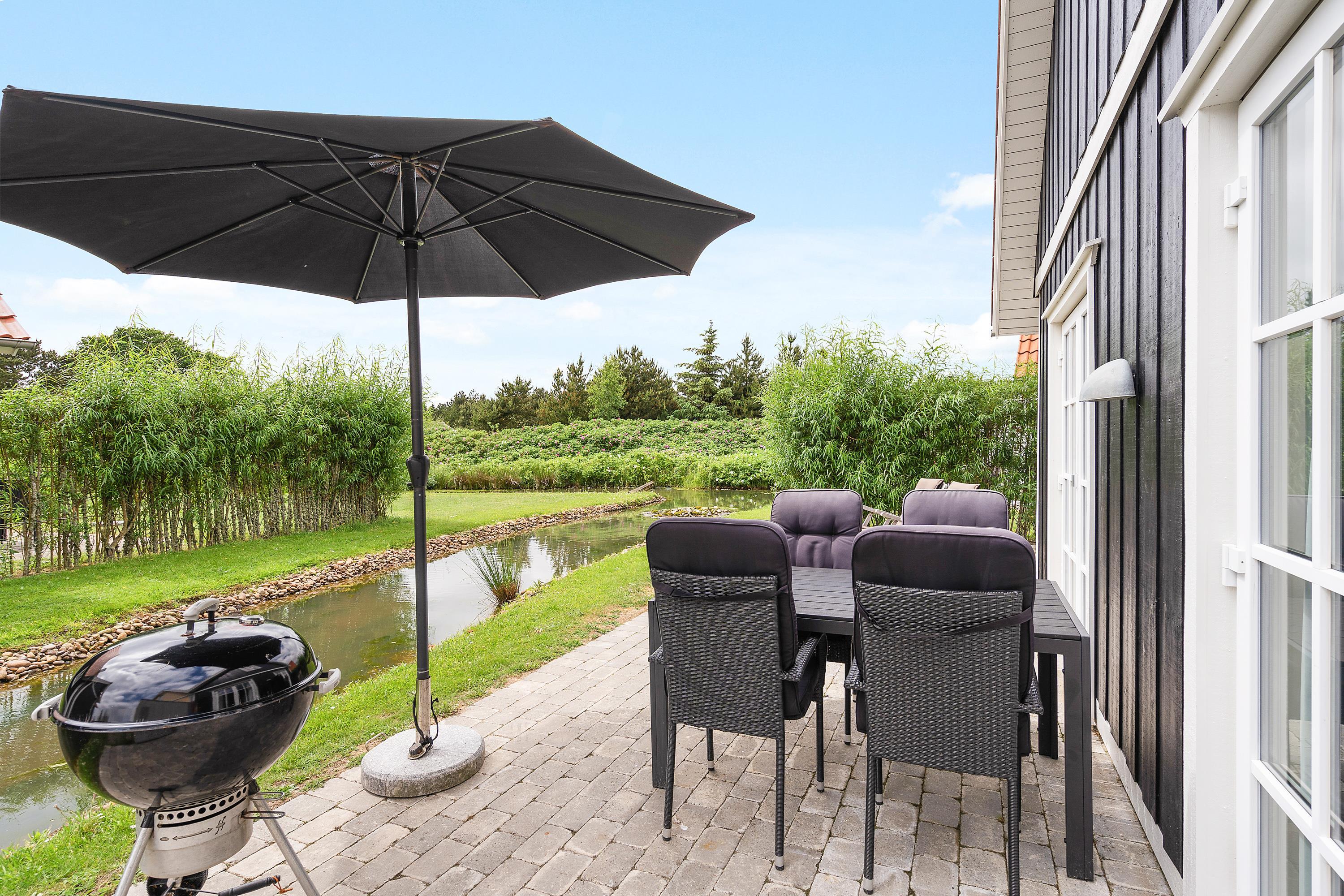 Fra stuen kommer I ud på den hyggelige terrasse. Herfra har I udsigt til den lille å, der snor sig gennem det grønne landskab – og måske får I besøg af ænderne, der kommer svømmende forbi. På de lune sommeraftener kan I flytte madlavningen udenfor på husets grill og nyde en god middag rundt om havebordet, mens aftensolen langsomt forsvinder ned i horisonten. Bemærk dog venligst, at havemøblerne er fjernet fra huset i vintermånederne.