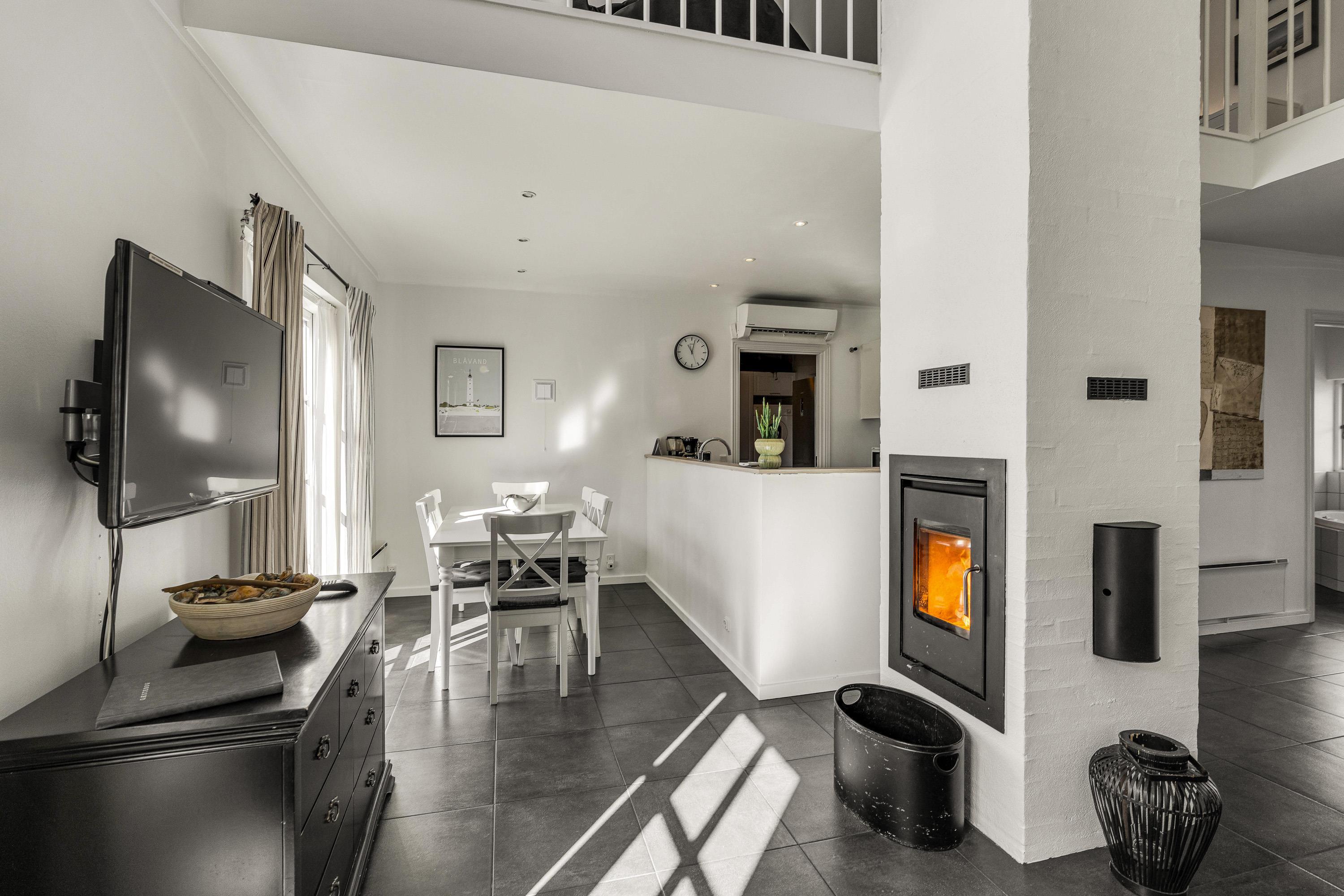 I den åbne stue- og spiseafdeling står brændeovnen, som især på de kølige feriedage sørger for varme og den helt rigtige ferieatmosfære. Mens flammerne knitrer i baggrunden, kan I læne jer tilbage i sofaen med en god bog eller tage et hyggeligt spil kort rundt om spisebordet.