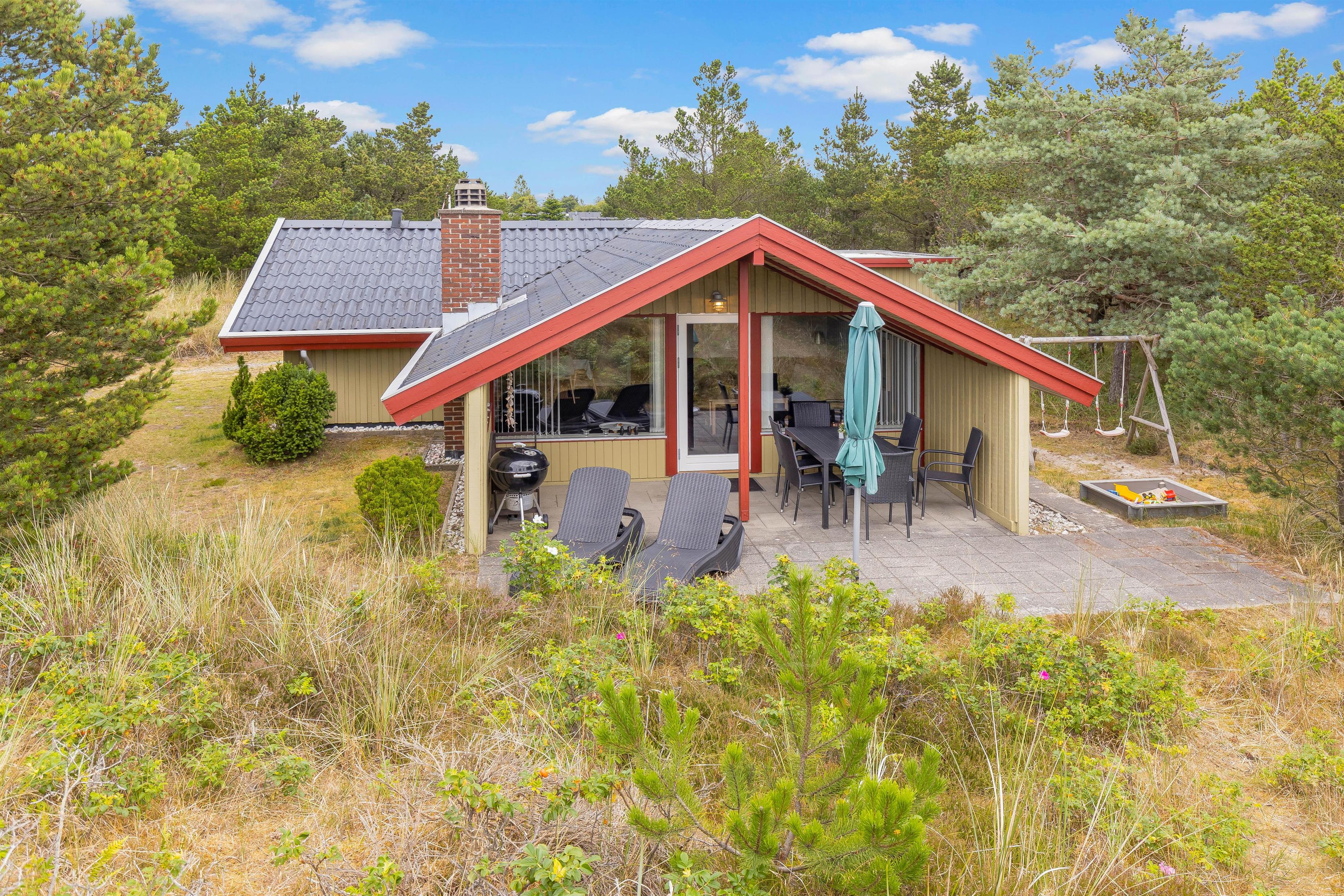 Den ene af sommerhusets terrasser er delvist overdækket, og I har derfor også mulighed for at nyde en stund i skyggen, hvis I får brug for en pause fra solen. Mens der bliver slappet af på terrasserne, kan børnene lege i haven, hvor de kan bygge sandslotte i sandkassen og gynge på gyngestativet.