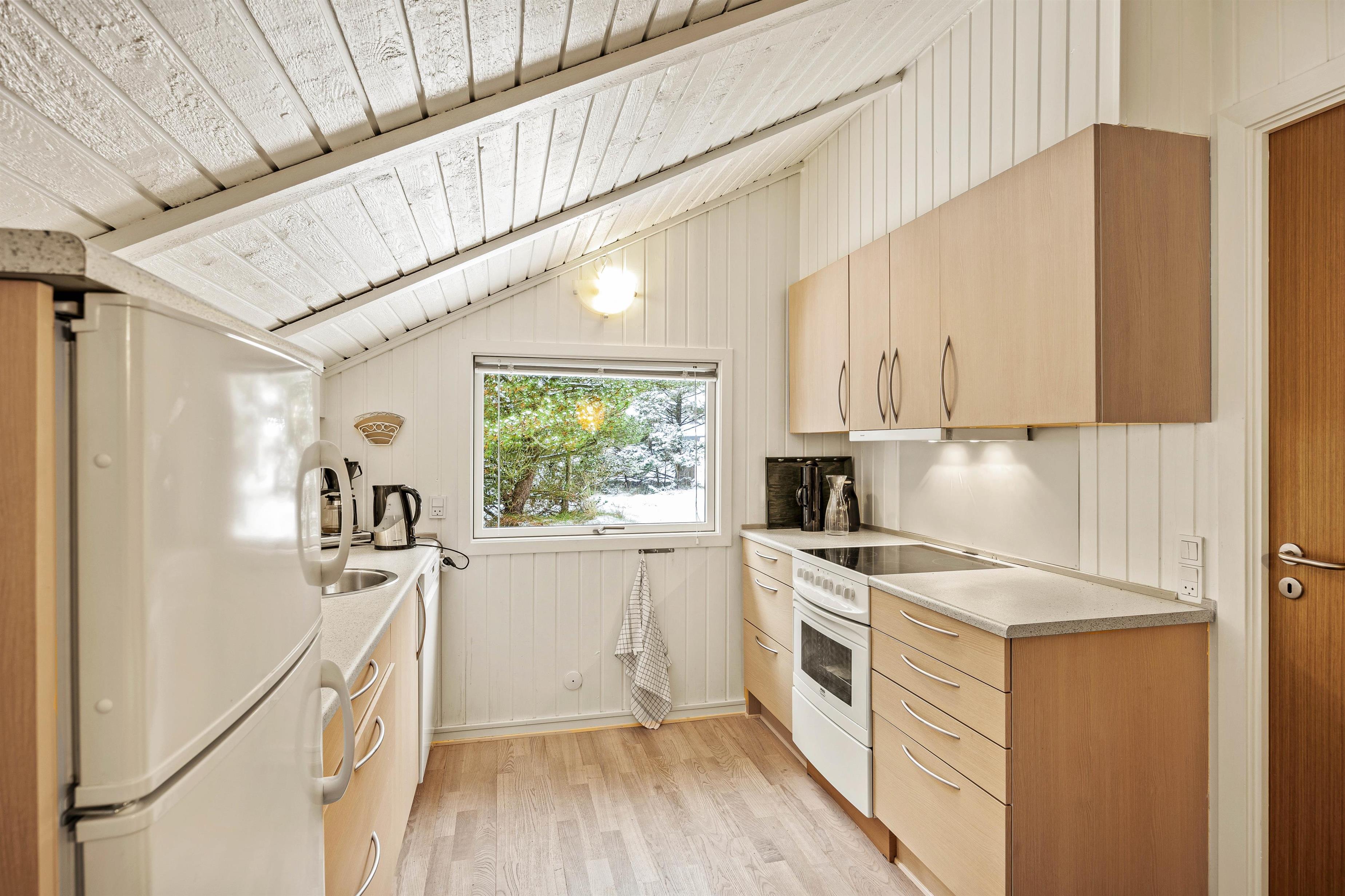 Hjertet i det 66 kvadratmeter store sommerhus udgøres af alrummet, hvor køkkenet ligger i åben forbindelse med stue og spiseplads. Her kan I nyde hyggelige feriestunder med film, madlavning og spil, mens brændeovnen fuldender feriestemningen med sine knitrende flammer i baggrunden.