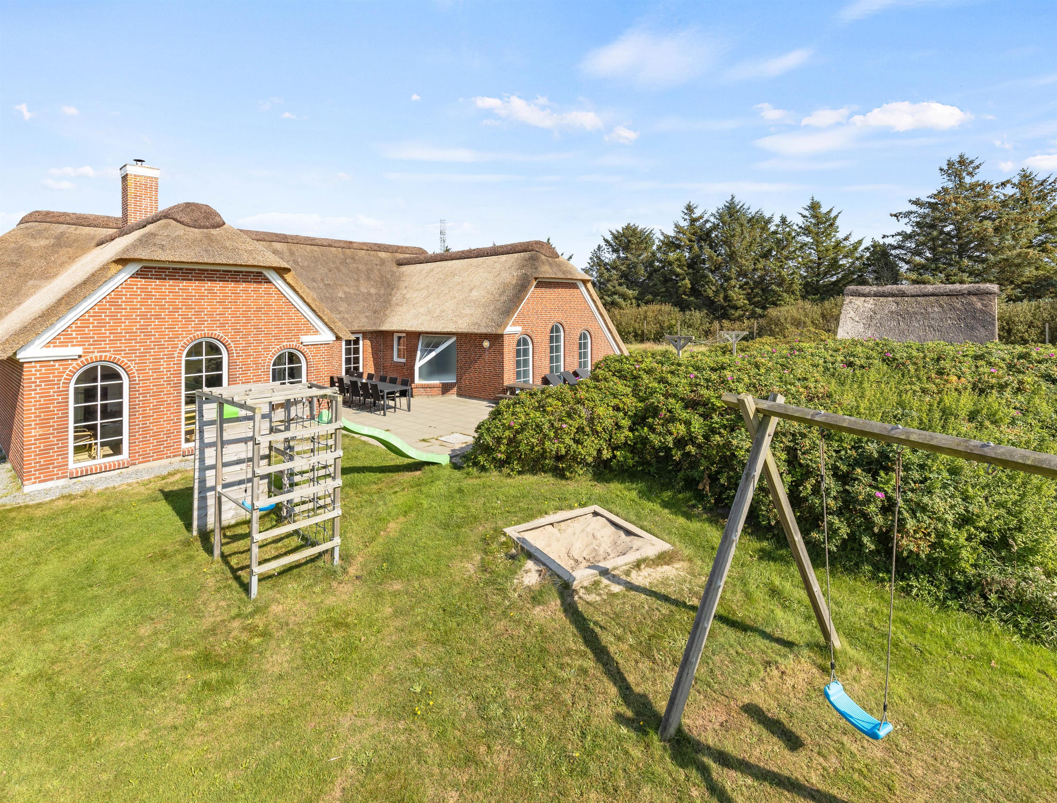 Tilhørende sommerhuset en dejlig, stor terrasse, som er beliggende mellem sommerhusets fløje. Dermed kan I sidde i læ, når grillmiddagen skal nydes på en lun sommeraften. Til børnene er der både sandkasse og gyngestativ på den store plænegrund, hvor der er god plads til sjov og leg.