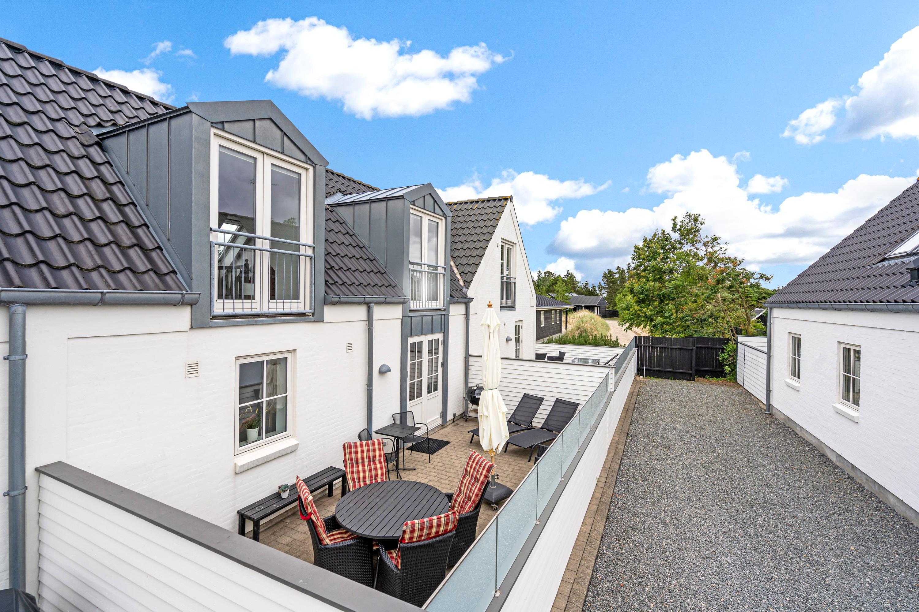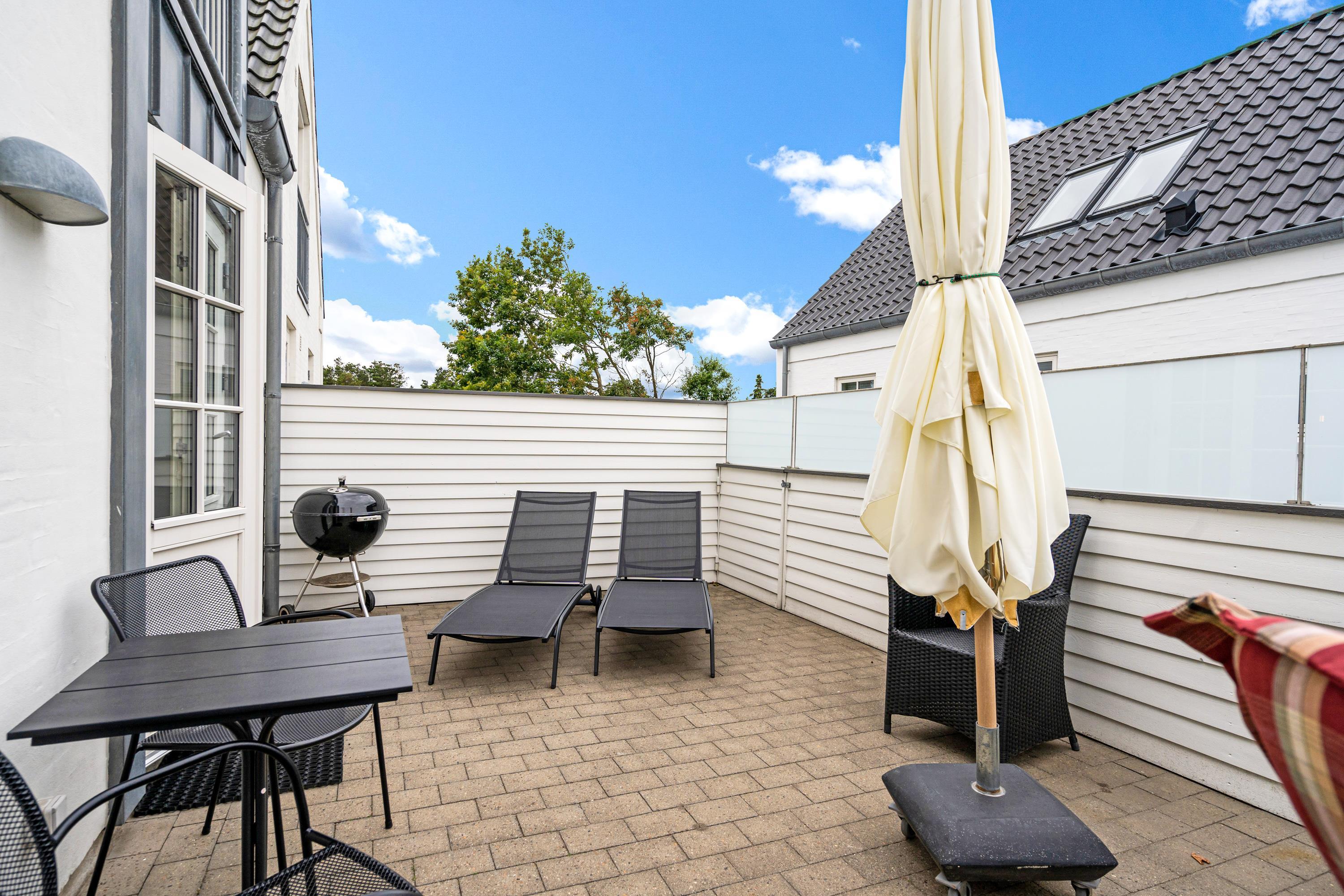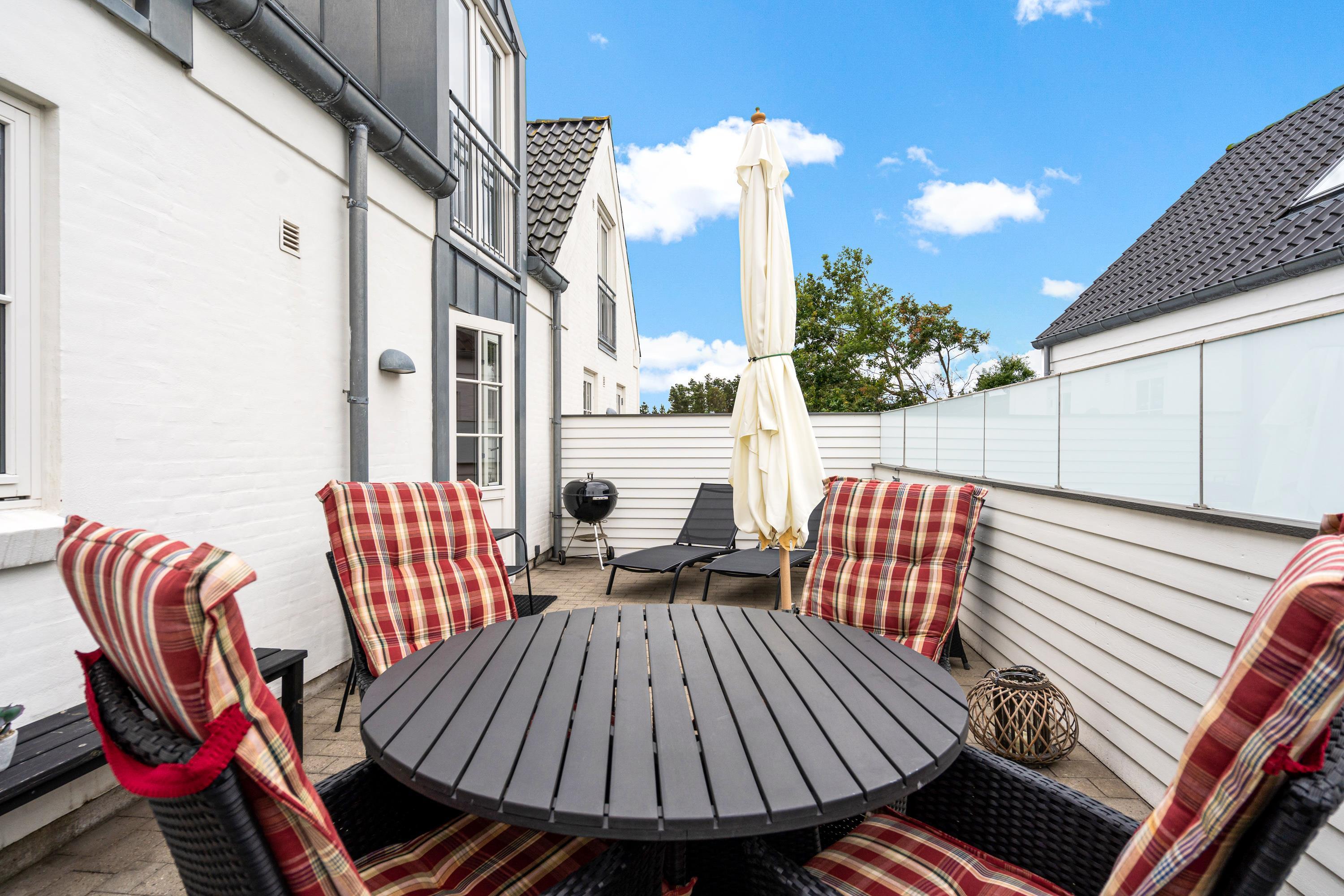 Her står gode havemøbler og grill parat til nogle afslappende timer, og I behøver ikke være bekymret for, om familiens hund lunter af sted på eventyr, da terrassen er lukket.