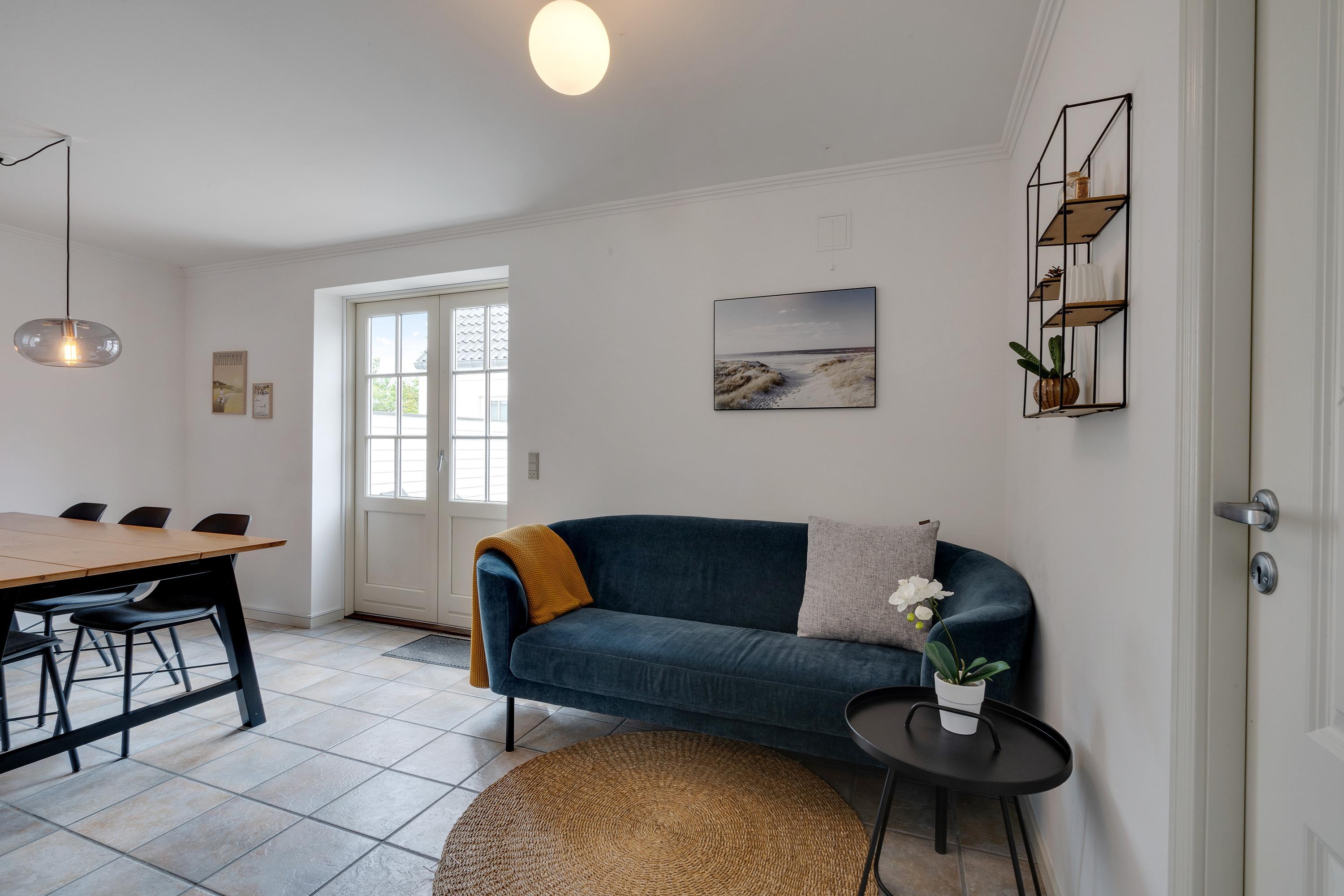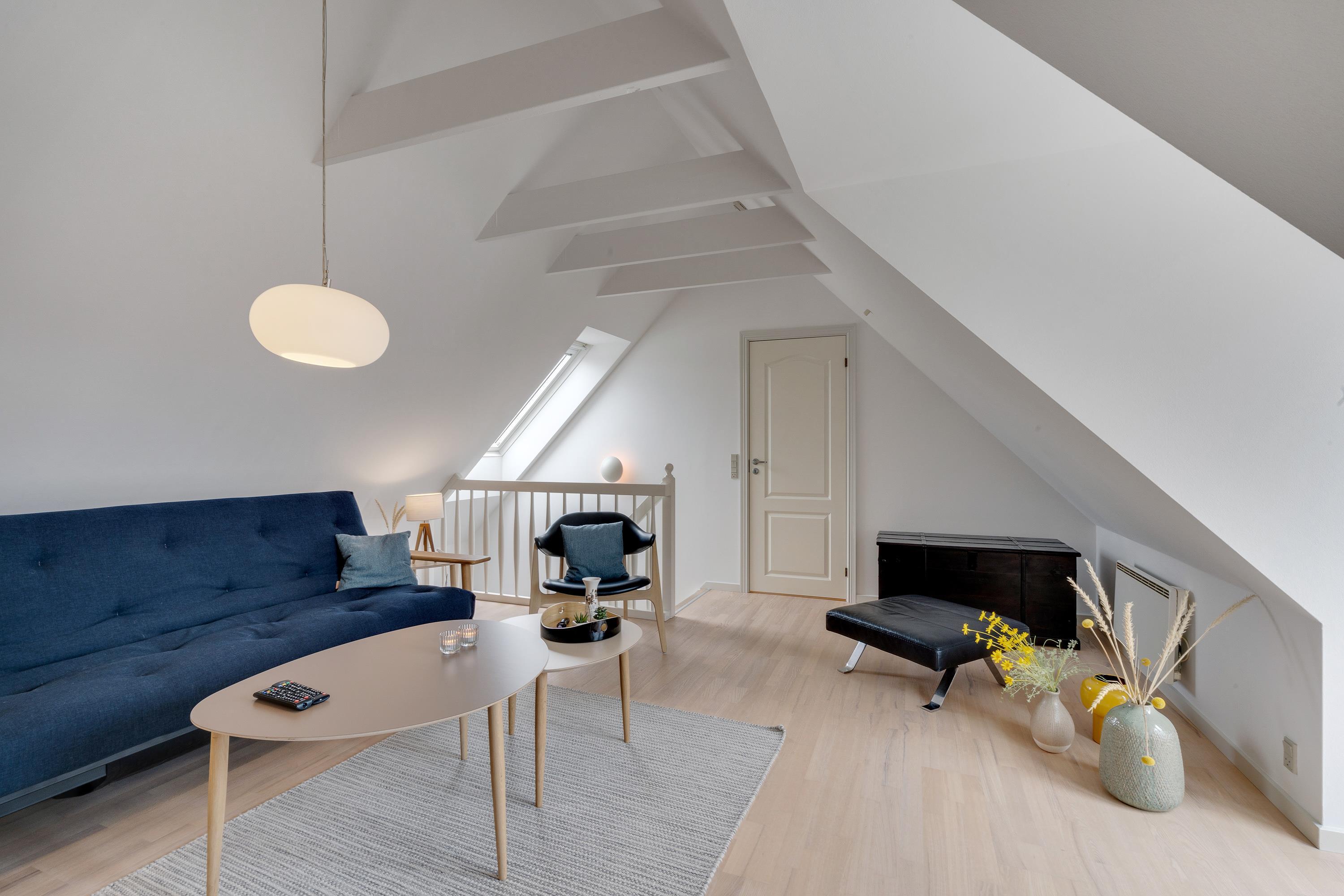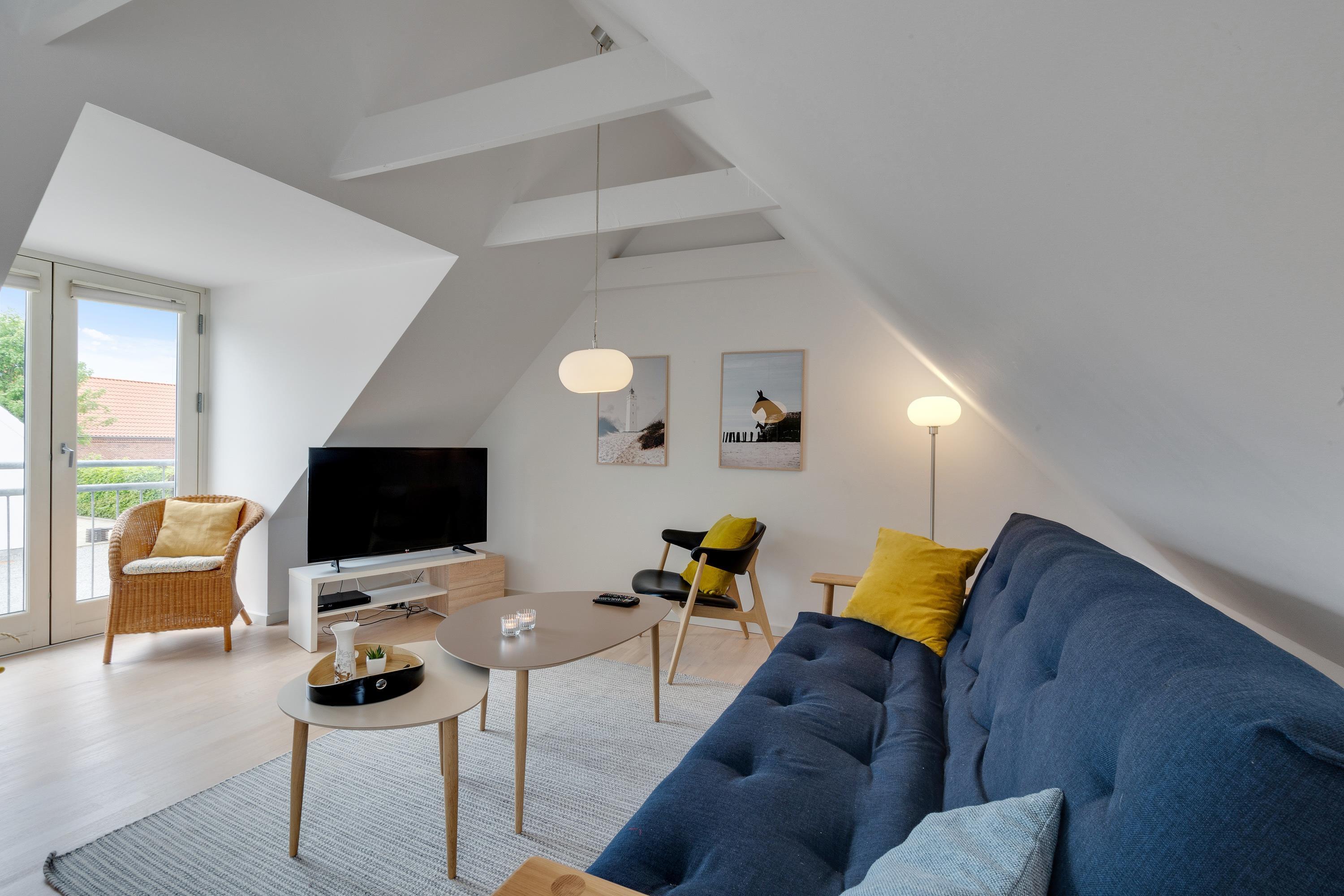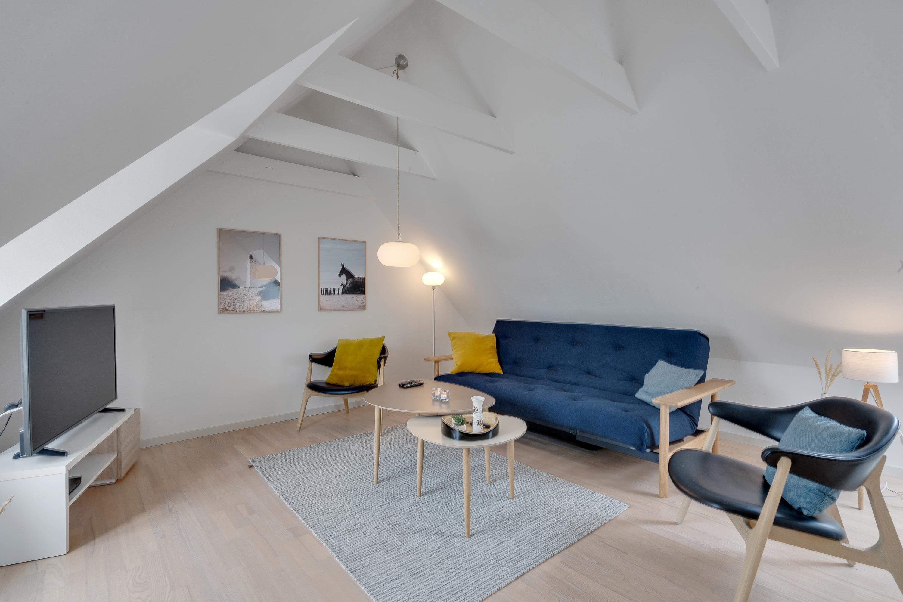 Via trappen i entréen kommer man på på førstesalen, hvorman træder ind i stuen med fladskærms-tv og sovesofa. Herfra er der adgang til ferielejlighedens andet soveværelse.