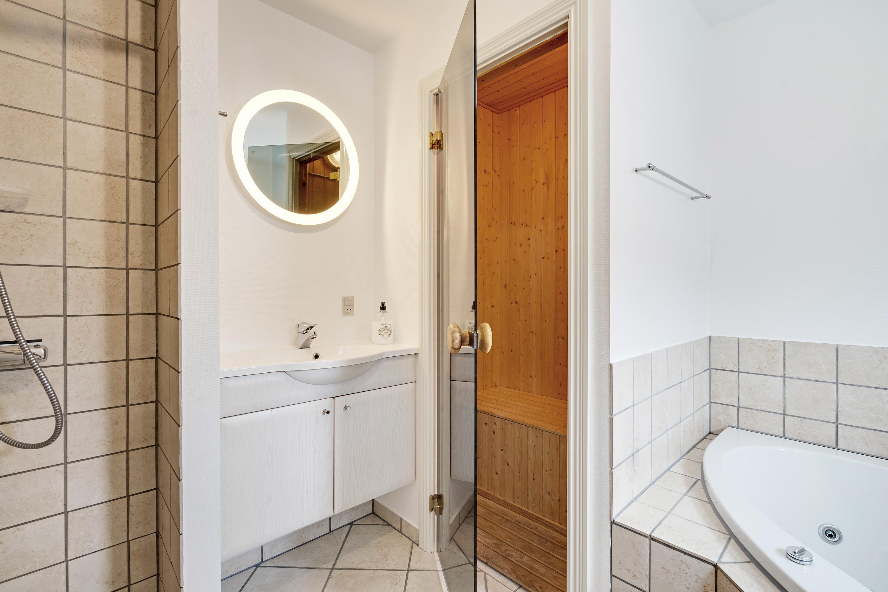 Badeværelset er ikke blot udstyret med gulvvarmen, men også en lille sauna og et spabad, så du kan kombinere strandferie ved Vesterhavet med wellness-ferie i lejlighedens egen lille wellness-oase.