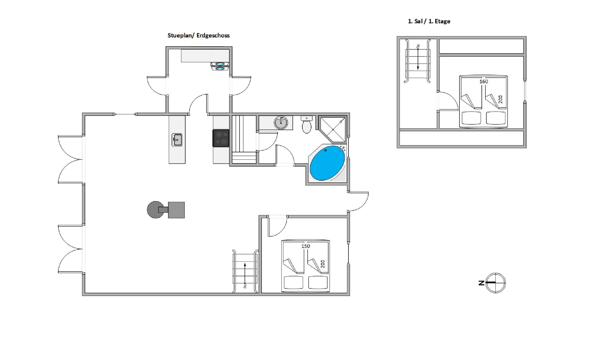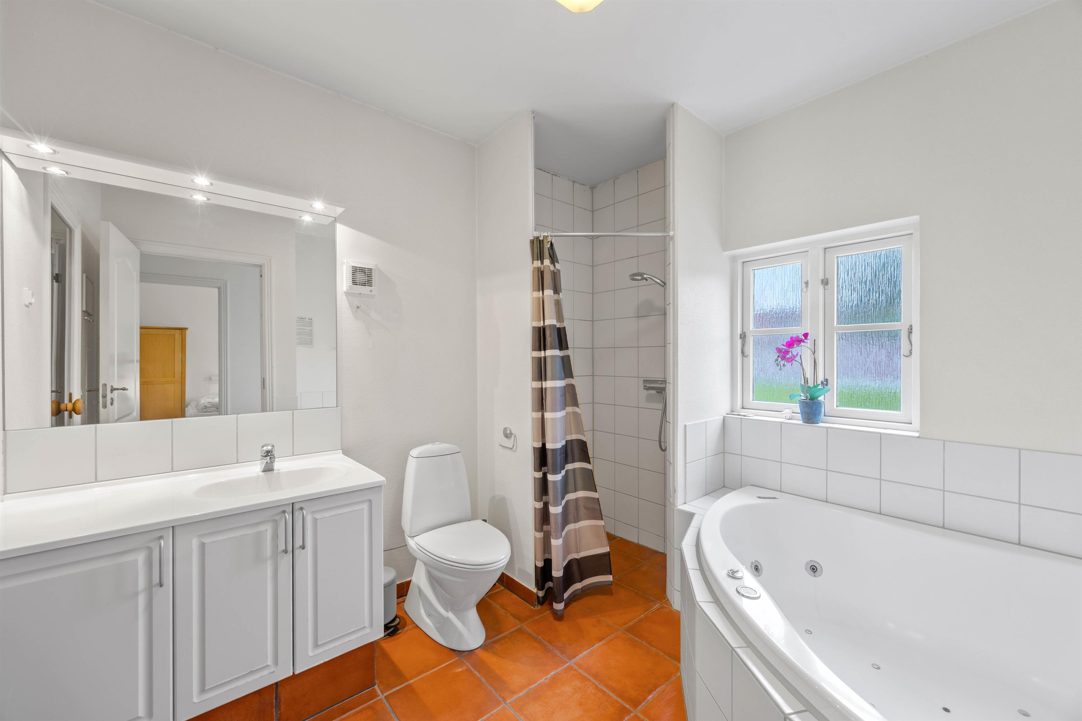 Også det rummelige badeværelse byder på hygge på de kolde som varme dage, hvor saunaen og spabadet står klar til at tage hånd om jer. På en stormende og regnfuld dag, eller bare efter en lang gåtur i det gode vejr, kan I her rigtig læne jer tilbage og nyde feriefreden og varmen.