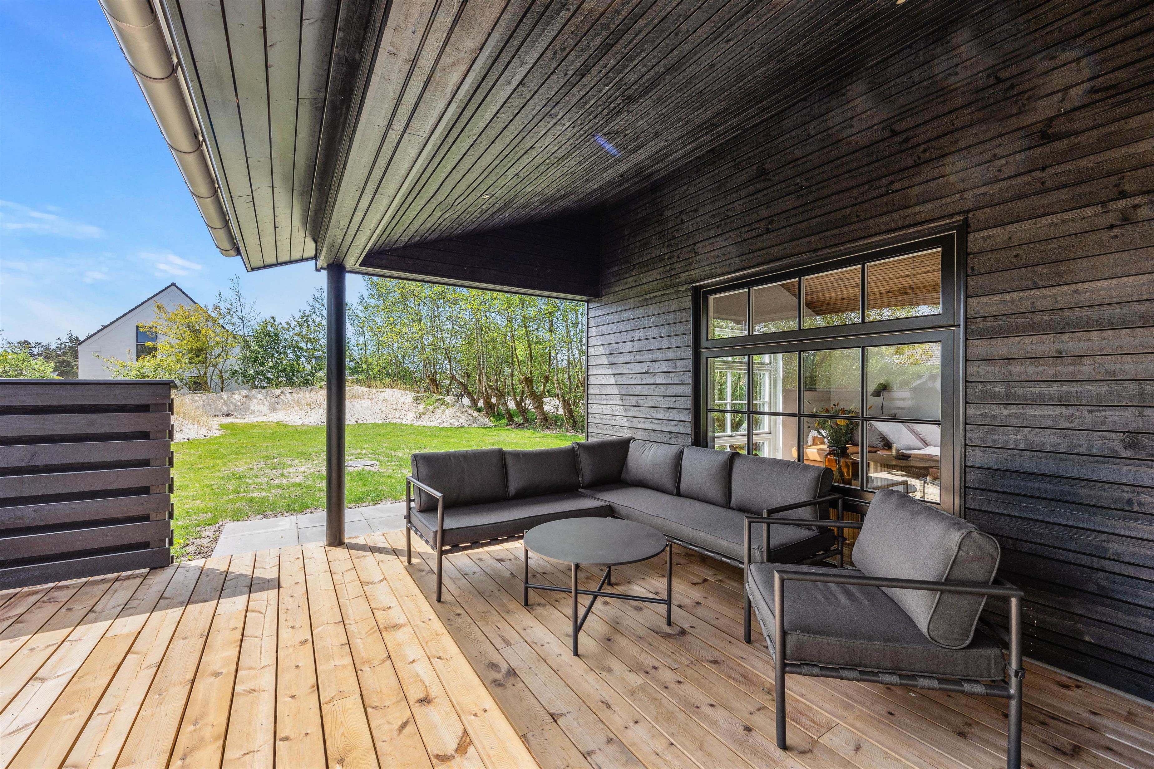 Benyt de rummelige udendørsområder – grunden på 1500 m² byder både på en åben og en overdækket terrasse, og her finder du komfortable havemøbler, så I kan nyde den friske luft og den smukke natur over en lokal øl eller et koldt glas vin.