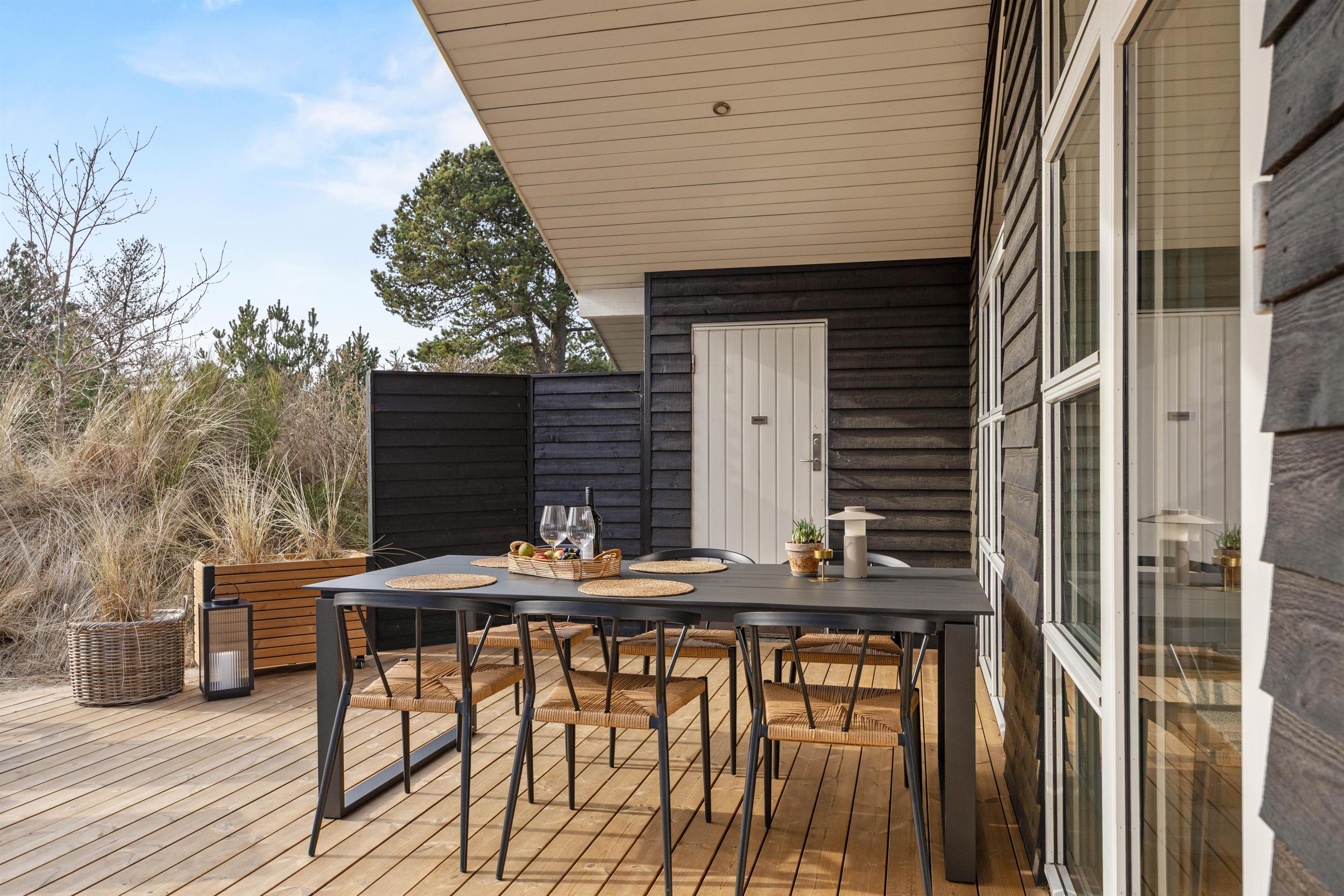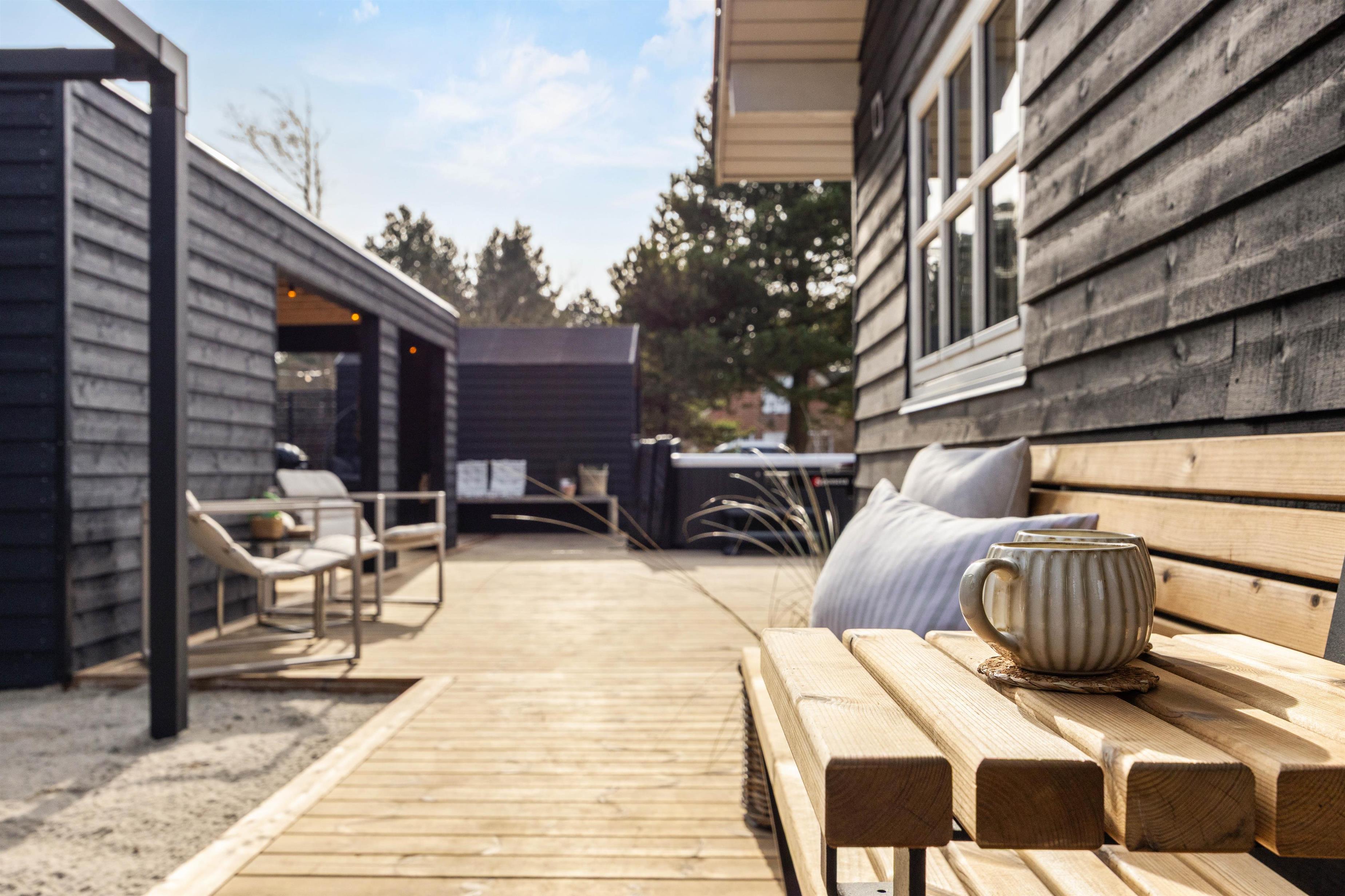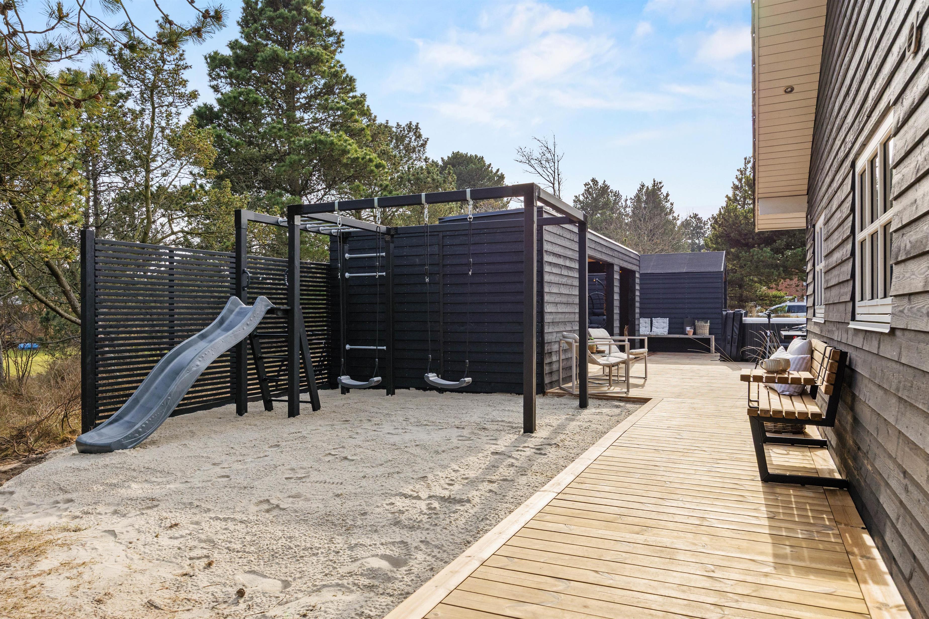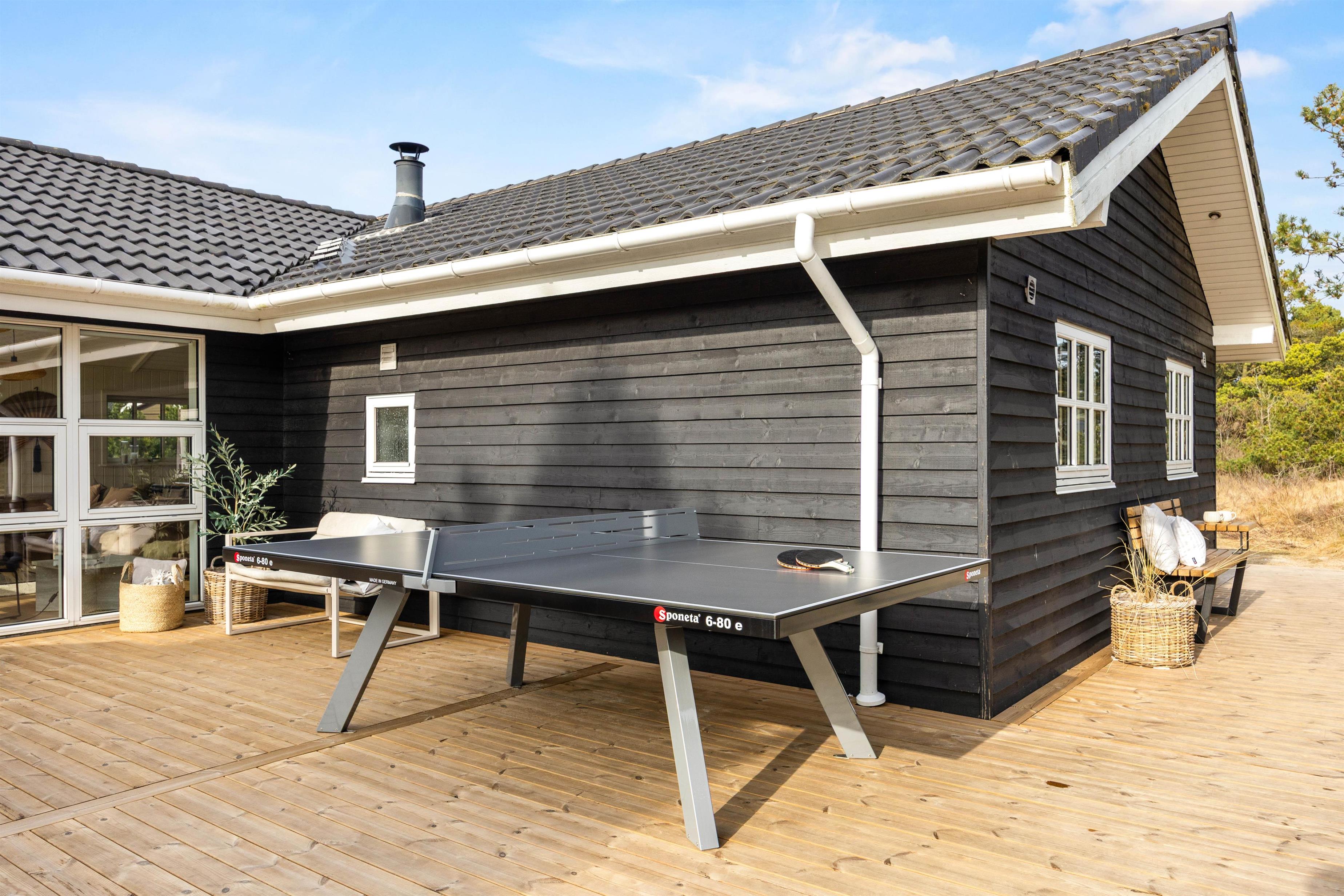 Med udeområdet får I en udespa, en stor udesauna og udendørs bordtennis at hygge jer med på den 170 m2 store terrasse, og her kan børnene også slå sig løs på legepladsen med sandkassen og gyngen, måske efter en god, fælles gåtur på de fine strande i Blåvand.