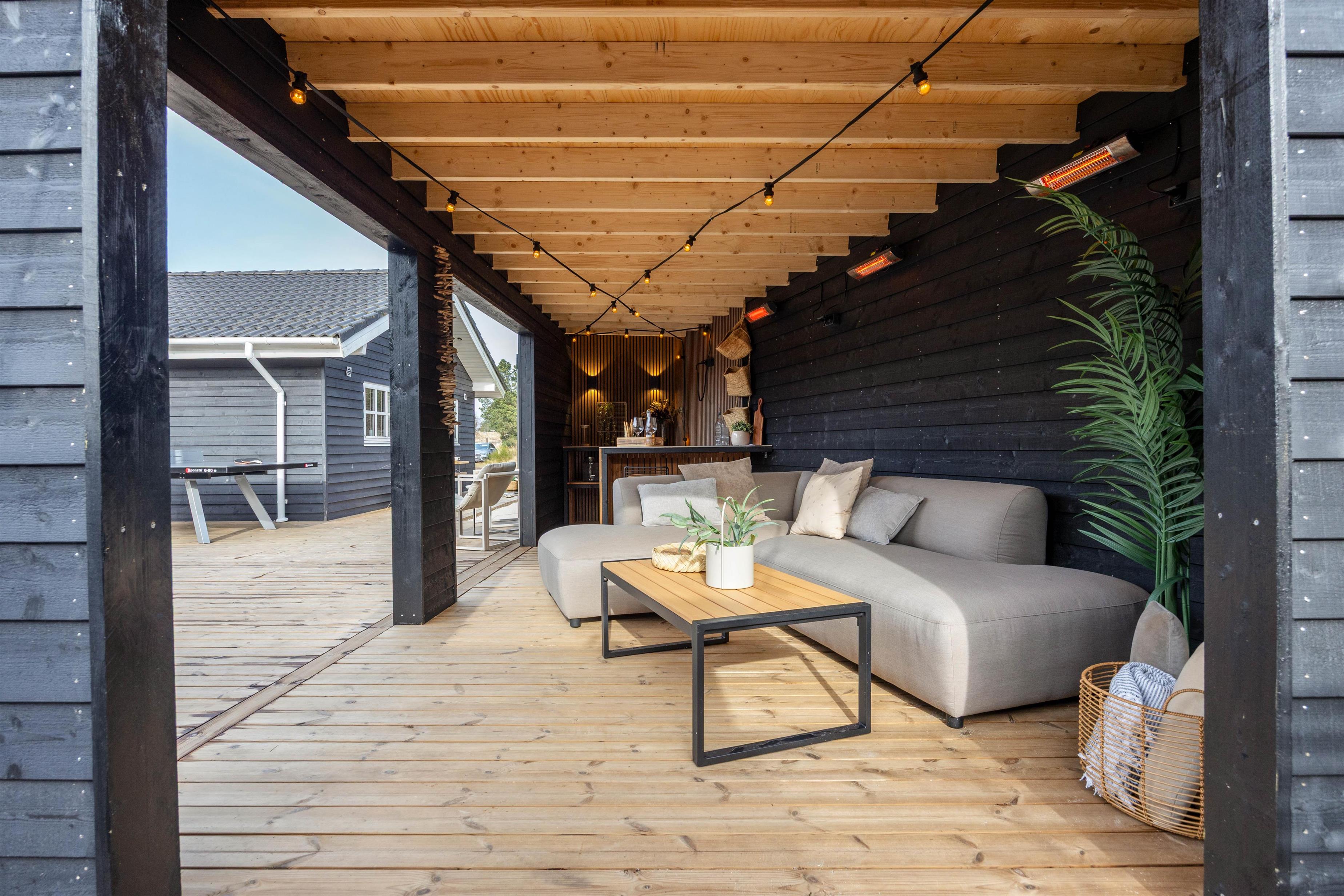 Fra stuen kommer I ud på den store og alsidige terrasse, hvor I også finder det separat beliggende og overdækkede loungeområde med udekøkkenet/baren og den gode sofa, hvor I kan hygge jer i læ for regn og vind og finde skygge over en kølig drink på solrige dage. Med gasgrillen kan I nemt og hurtigt tilberede aftenens feriemiddag, og på de gode sommeraftener er det oplagt at spise middagen rundt om havebordet i den lune aftensol.
