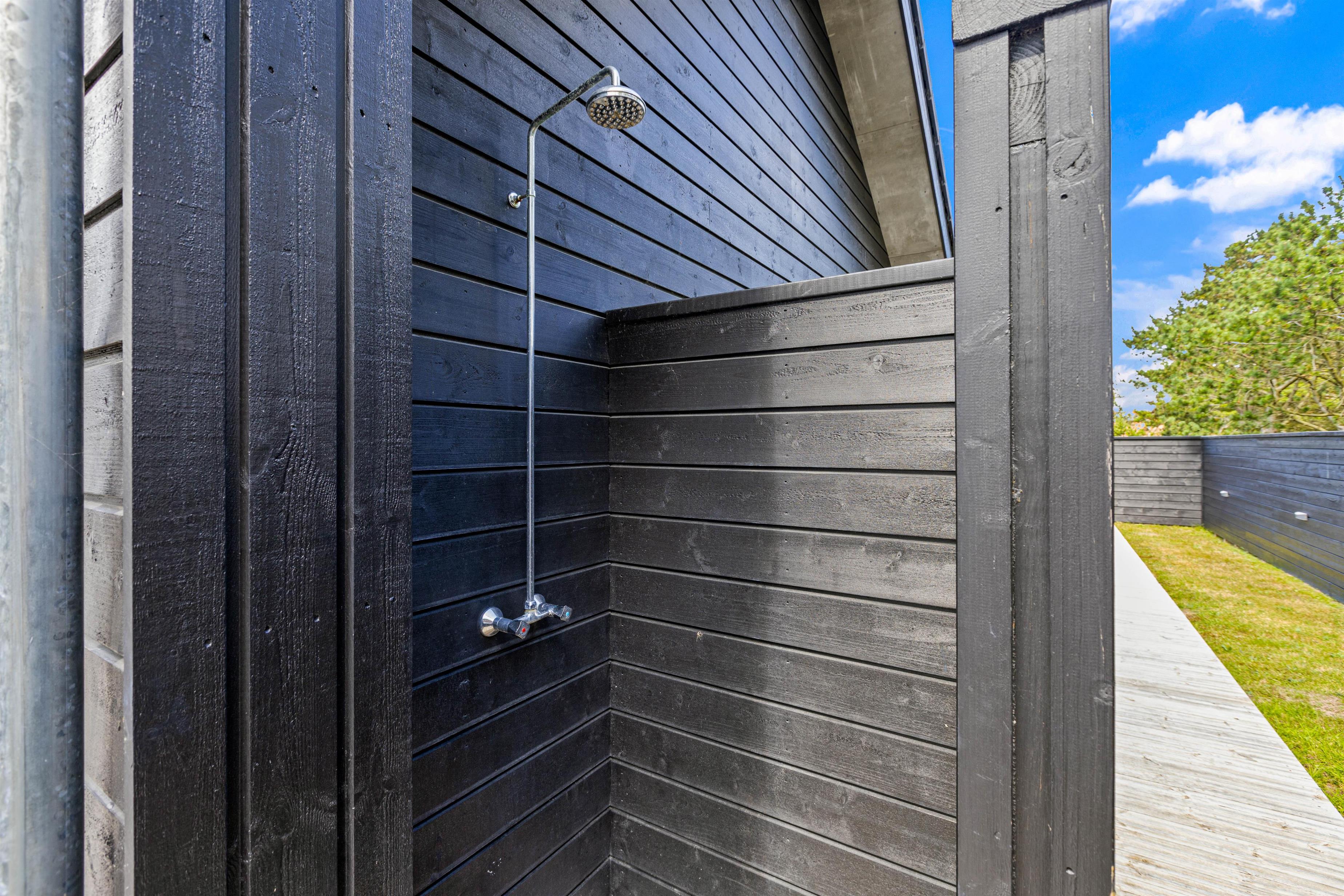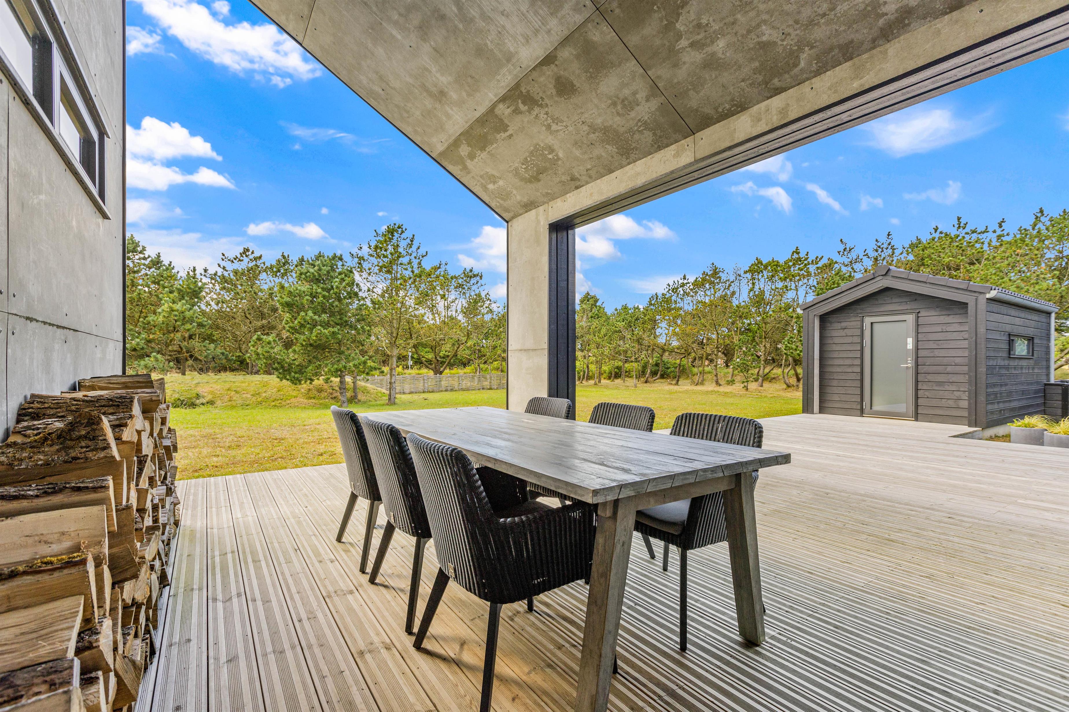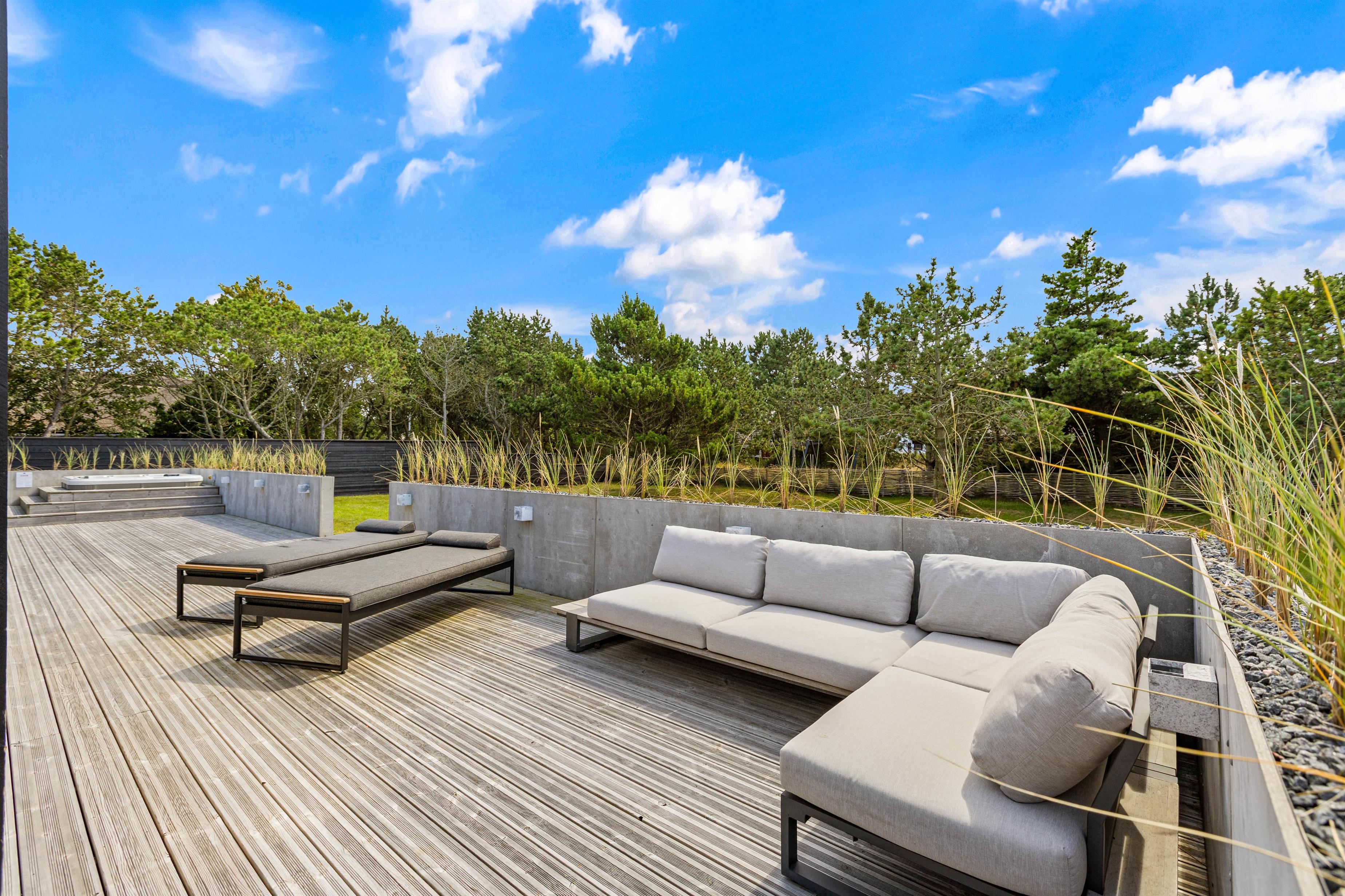 En overdækket terrasse sikrer, at I kan nyde udendørs livet uanset vejret. Som kronen på værket er der et udendørs spabad og en infrarød sauna, som fint rummer 2-3 personer ad gangen, ledsaget af en forfriskende udendørs bruser, hvilket giver jer luksuriøse wellness-øjeblikke – perfekt til at forkæle både krop og sjæl. Udebruseren kan benyttes fra 1. april til 31. oktober.