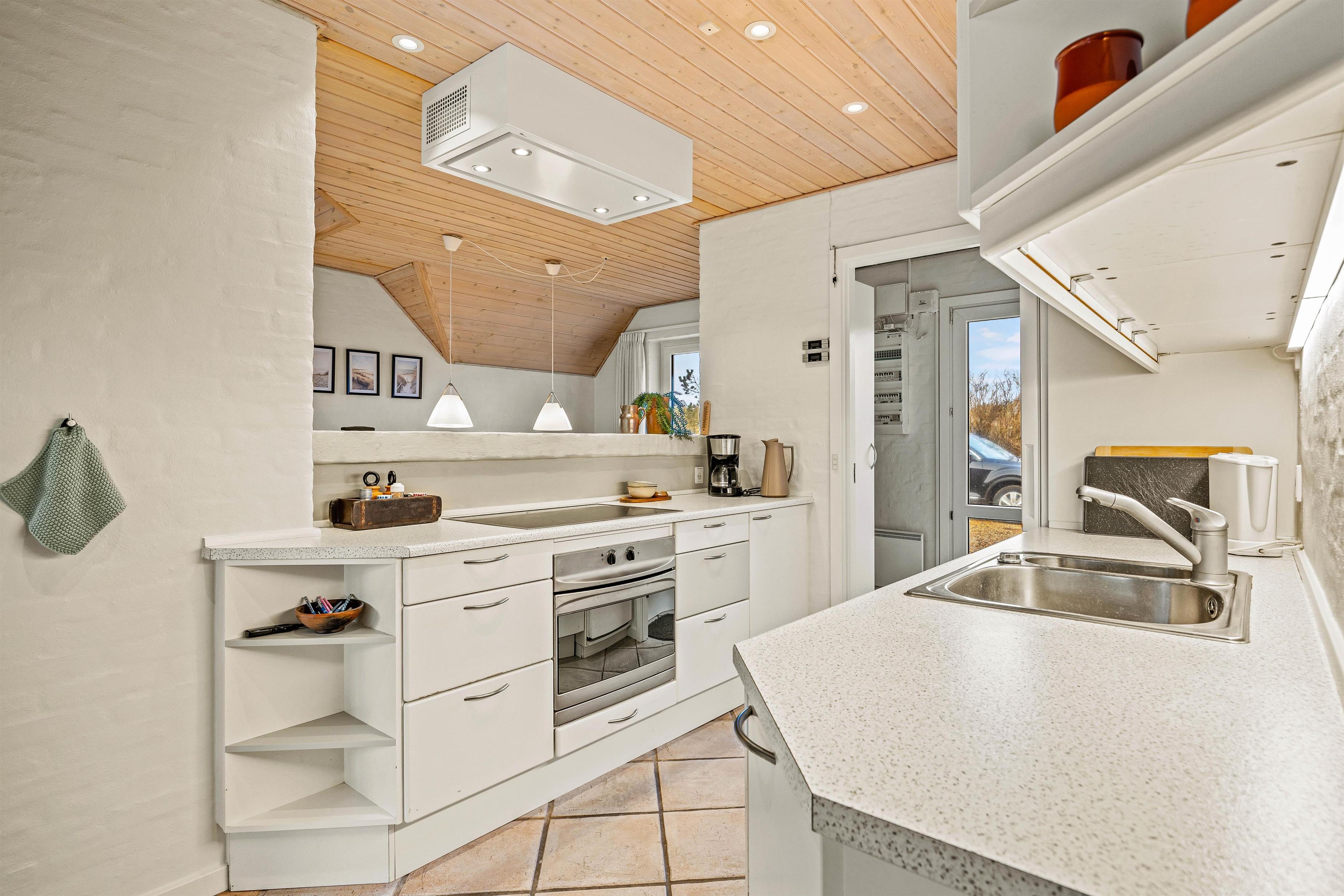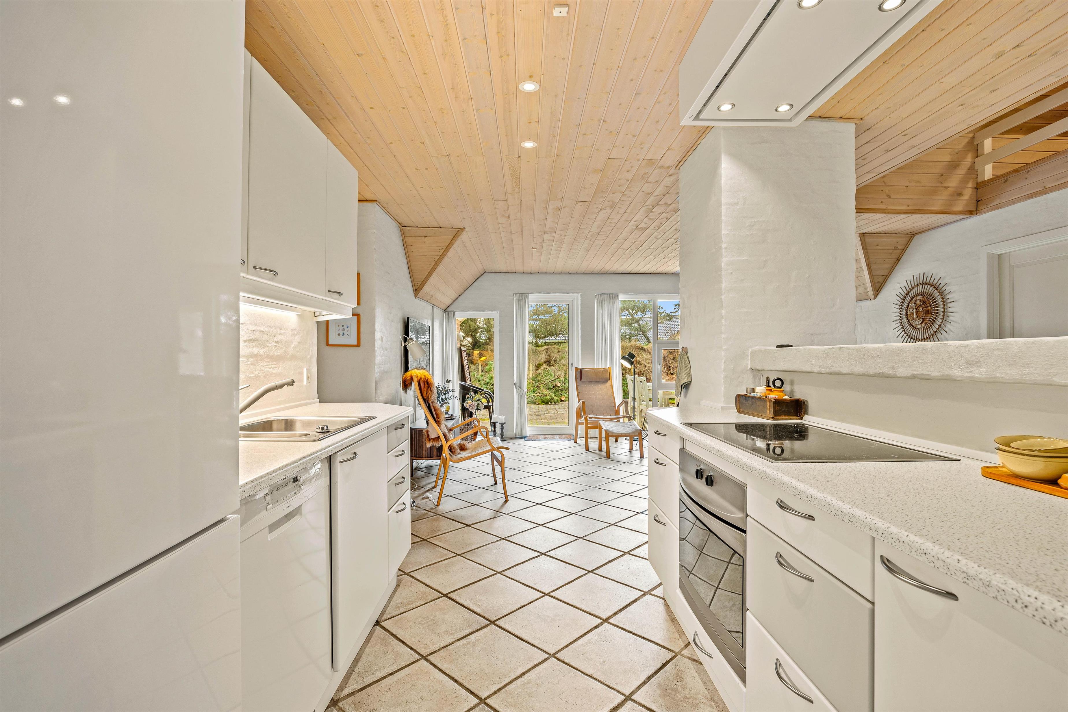 Kun 200 meter fra feriehuset på Strandparken 13B er der indkøbsmulighed og morgenbrød, så I kan hente friske rundstykker på vej hjem fra morgendukkerten eller dagens første hundeluftertur. Andre kan så lave kaffen i det lyse velindrettede køkken med opvaskemaskine og induktionskogeplade og gøre klar til fælles spisning i den hyggelige køkkenkrog eller, hvis vejret tillader det, på den dejlige terrasse.