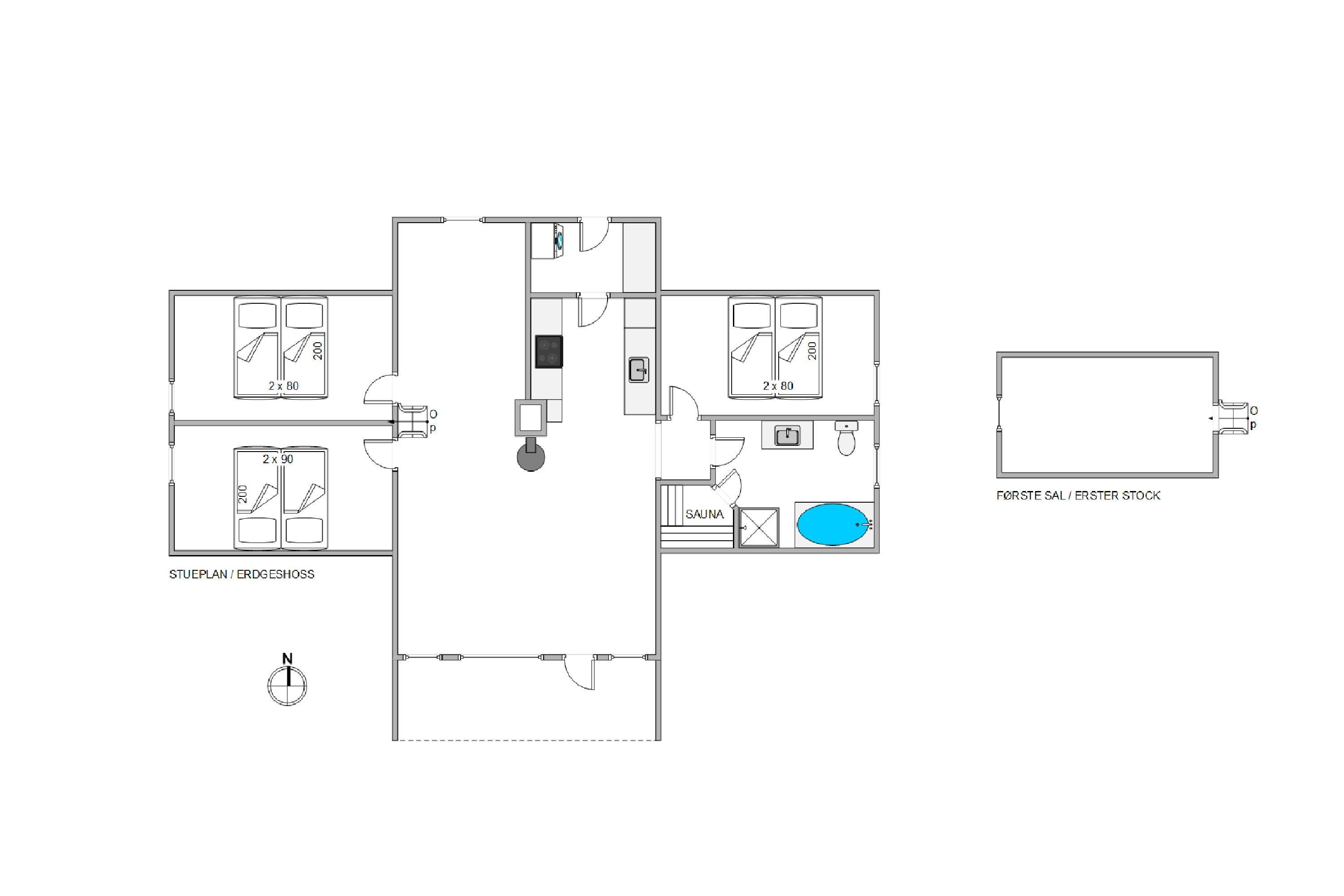De 3 soveværelse er udstyret med dobbeltsenge og ligger alle med udgang til husets hjerterum. Badeværelset med gulvvarme er moderne indrettet med 2-personers spa og en lækker sauna, så I kan blive varmet godt igennem efter en tur på stranden. I feriehusets entré er der desuden både vaskemaskine og tørretumler samt ladestation til jeres rådighed.