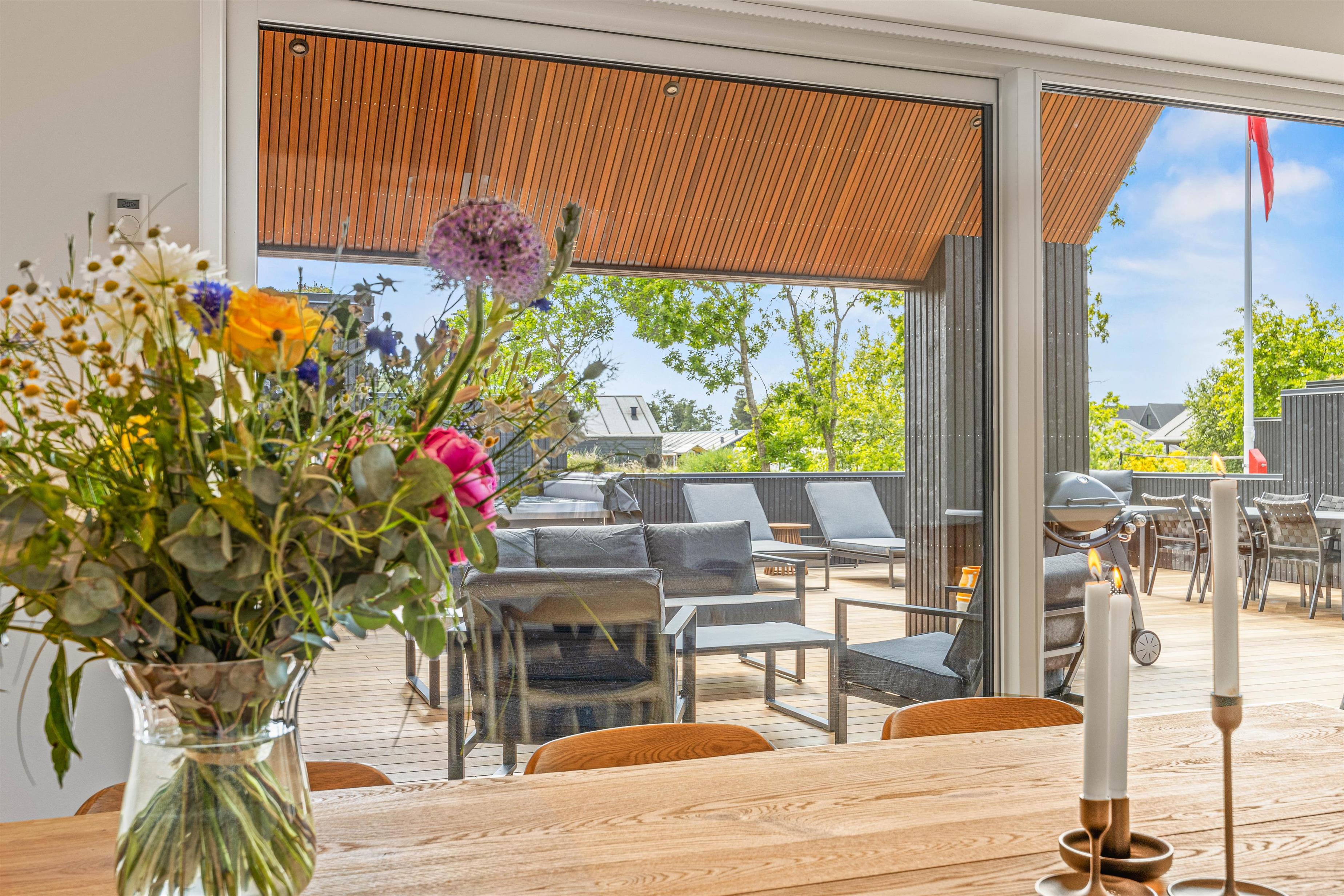 Det er ikke kun indvendigt, at feriehuset på Midtbyvej 8B står knivskarpt. Udenfor venter jer et lækkert, delvist overdækket terrasseområde. Her kan I nyde den danske sommer, uanset om I skal dase i solen, nyde morgenkaffe eller læse en god bog. Havemøbler, liggestole og gasgrillen står klar til jer.