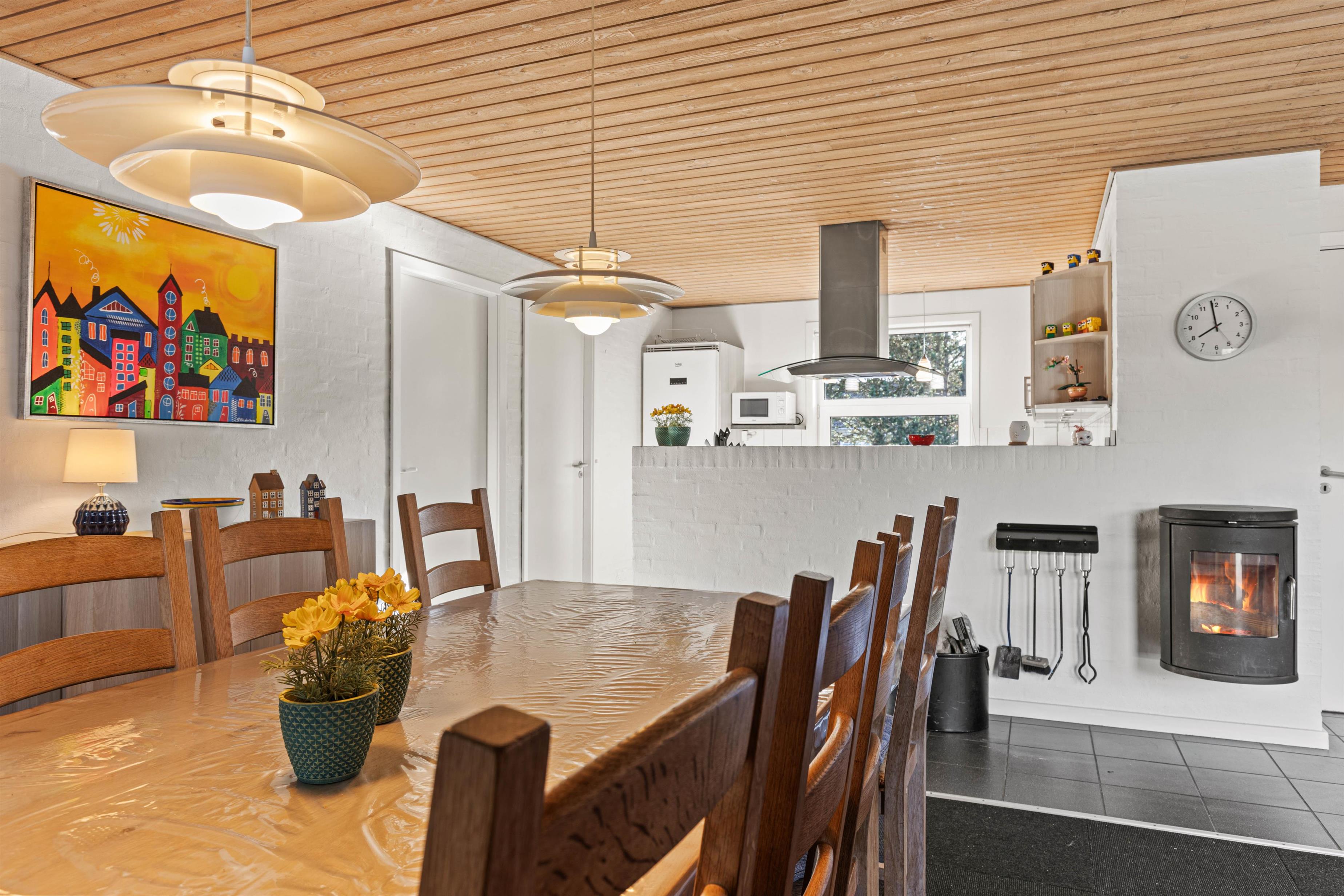 Husets hjerte er det store opholdsrum, der er en kombination af stue, spiseafdeling og køkken. Her kan I slappe af foran brændeovnen, se film på den store fladskærm eller læse en bog i den behagelige lænestol. Fra opholdsrummet har I også direkte adgang til den møblerede og afskærmede terrasse.