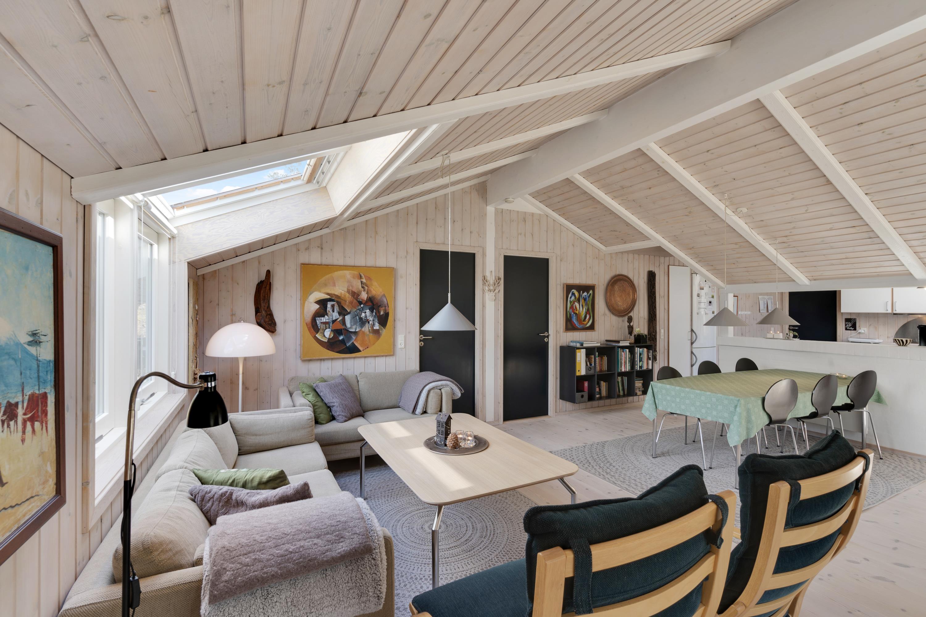 I den store opholdsstue, hvor køkken, stue og spiseafdeling er forenet, er der rig mulighed for mange hyggelige feriestunder. Med lyse træpaneler, loft til kip og et skønt lysindfald bliver der skabt en skøn ferieatmosfære i opholdsstuen, som I med garanti vil føle jer godt tilpas i. Mangler I en bog til ferien findes der et lille 'bibliotek' med danske, tyske og engelske bøger. Sommerhuset er også holdt både røg - og husdyrfrit.