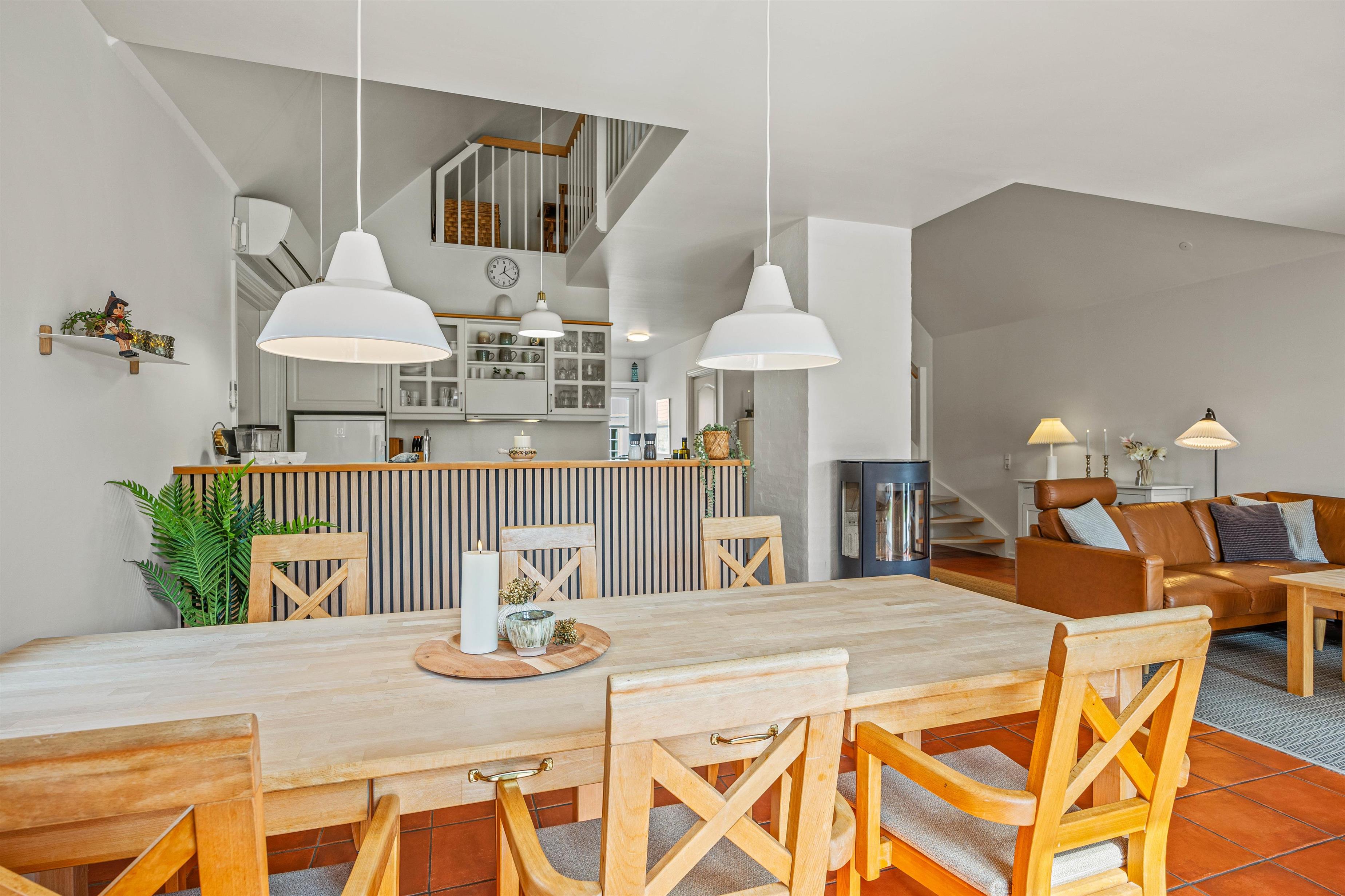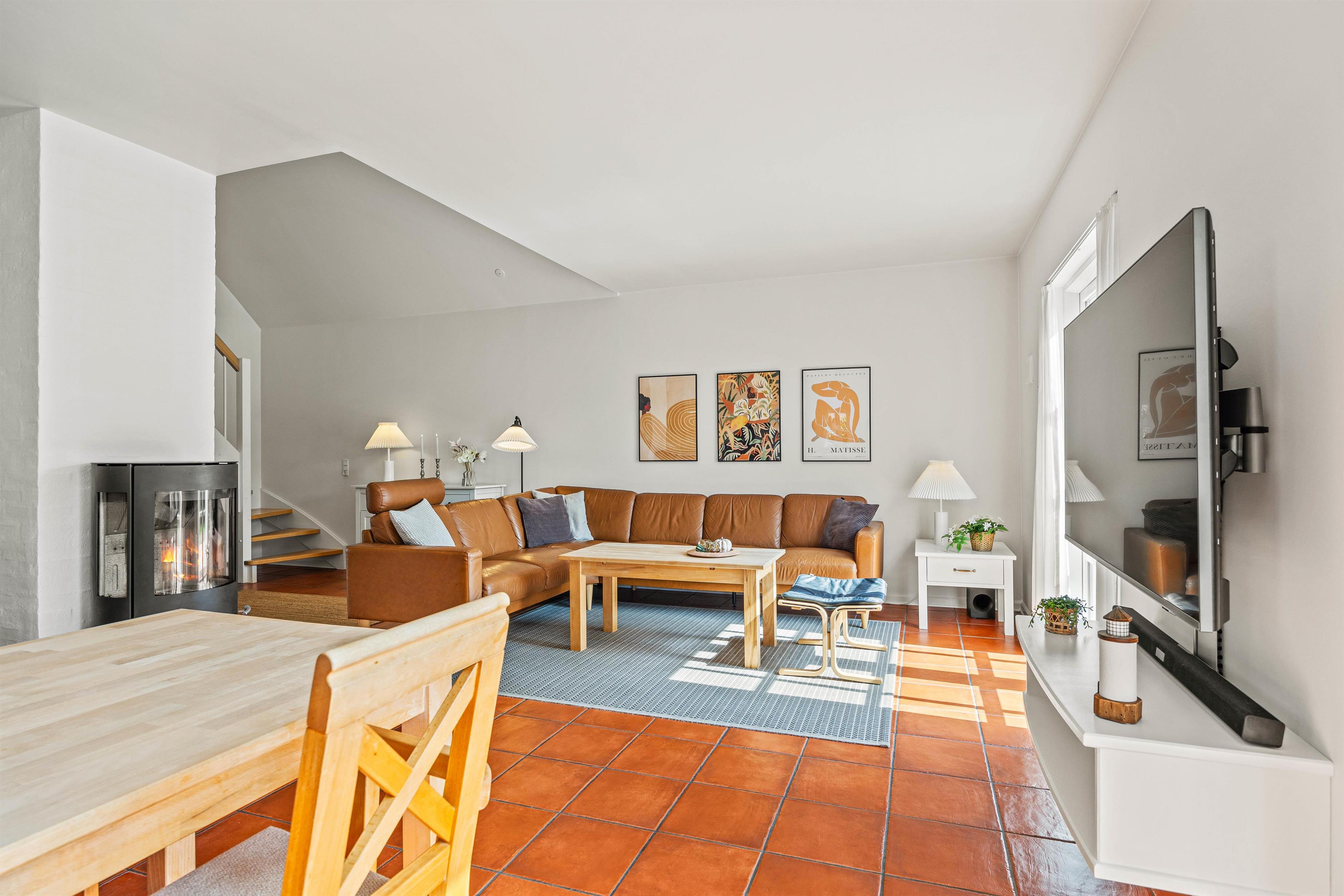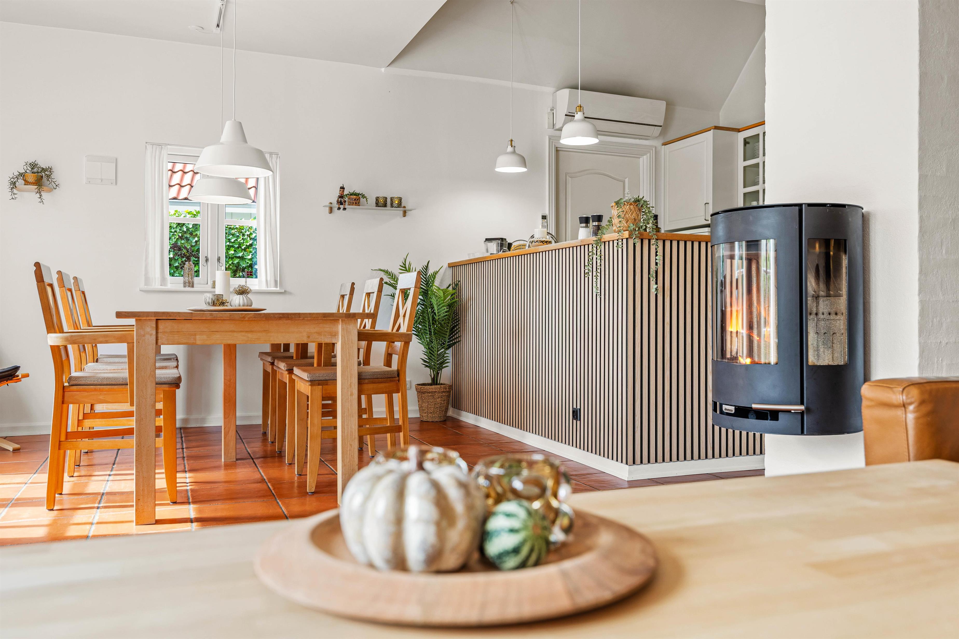 Opholdsstuen ligger også i stueetagen, og her vil I uden tvivl tilbringe mange timer sammen. I kan sætte jer godt til rette i sofaerne, mens I streamer film via Chromecasten – for ekstra god lyd til jeres yndlingsfilm kan I oprette forbindelse til soundbaren, som I også kan spille musik gennem. Skal der i stedet skrues op for den hyggelige stemning, kan I tænde op i brændeovnen.