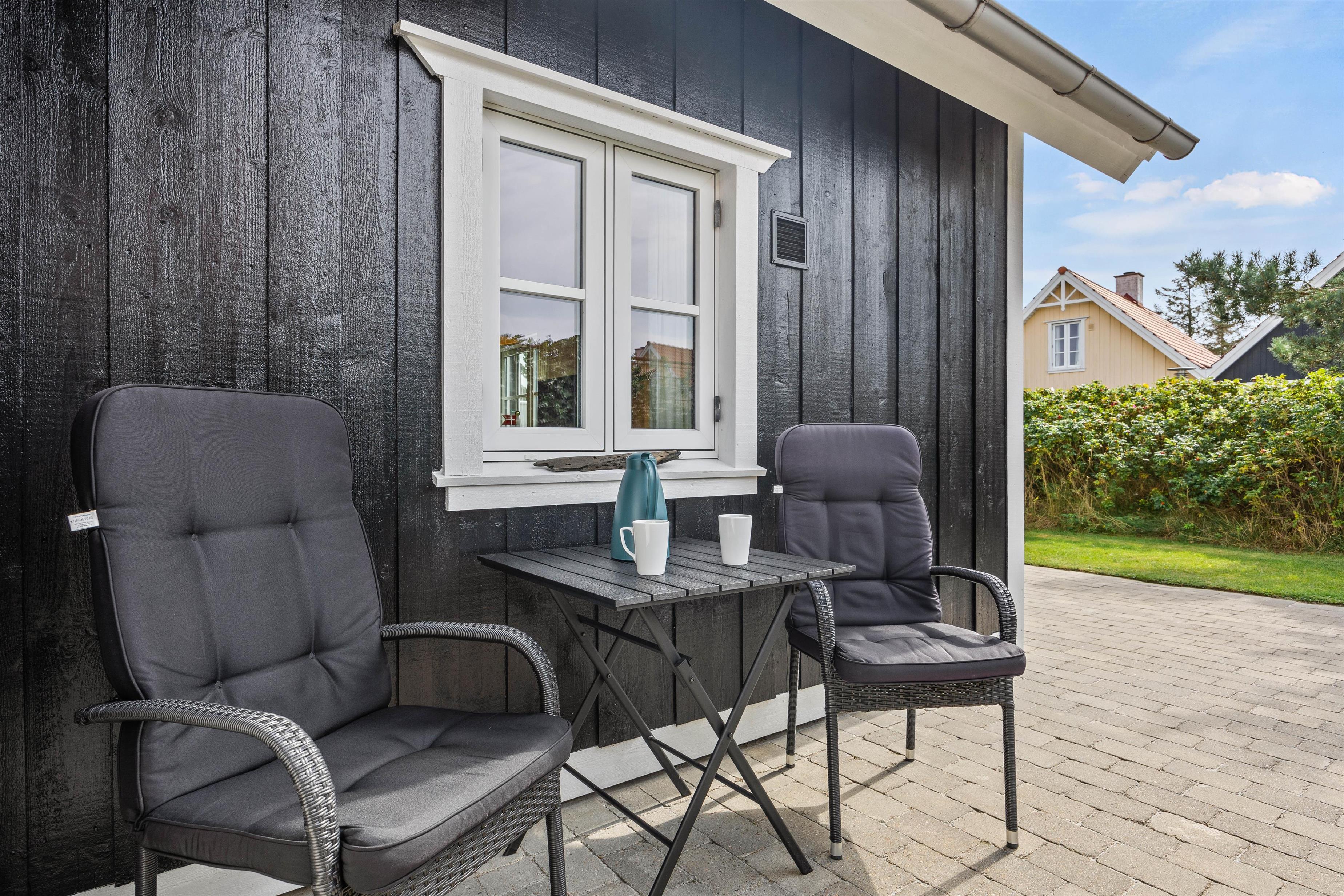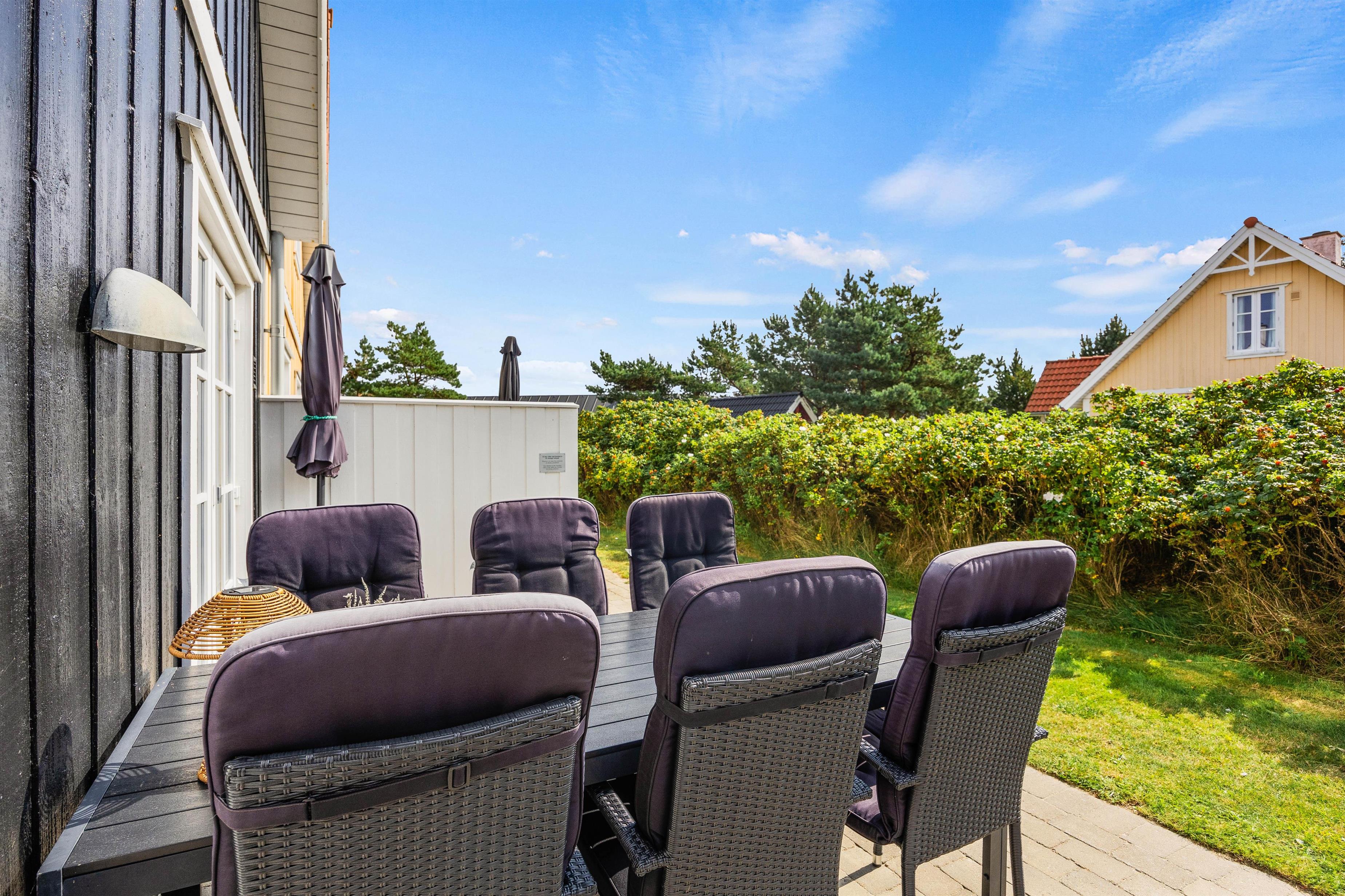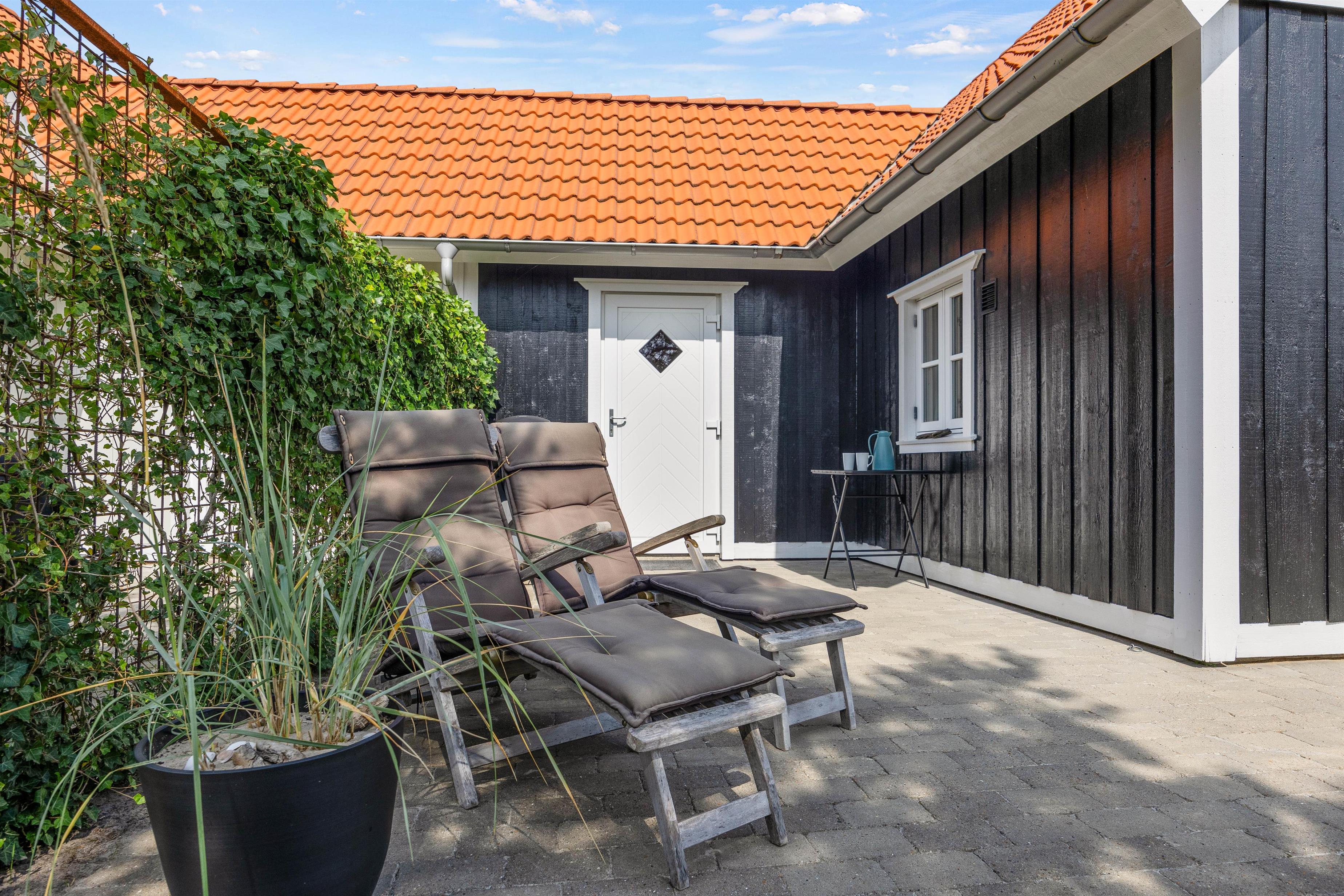 På de varme, solskinsfyldte feriedage skal I selvfølgelig udenfor. Ryk ud på terrassen, hvor I kan finde jer godt til rette i liggestole og havemøbler (bemærk blot, at havemøblerne er fjernet i vintermånederne). Terrassen er godt afskærmet af et hegn med slyngplanter og ligger godt for solen, så I kan have glæde af den det meste af dagen. Om aftenen kan I finde grillen frem og nyde en lækker middag med røde bøffer og god vin.