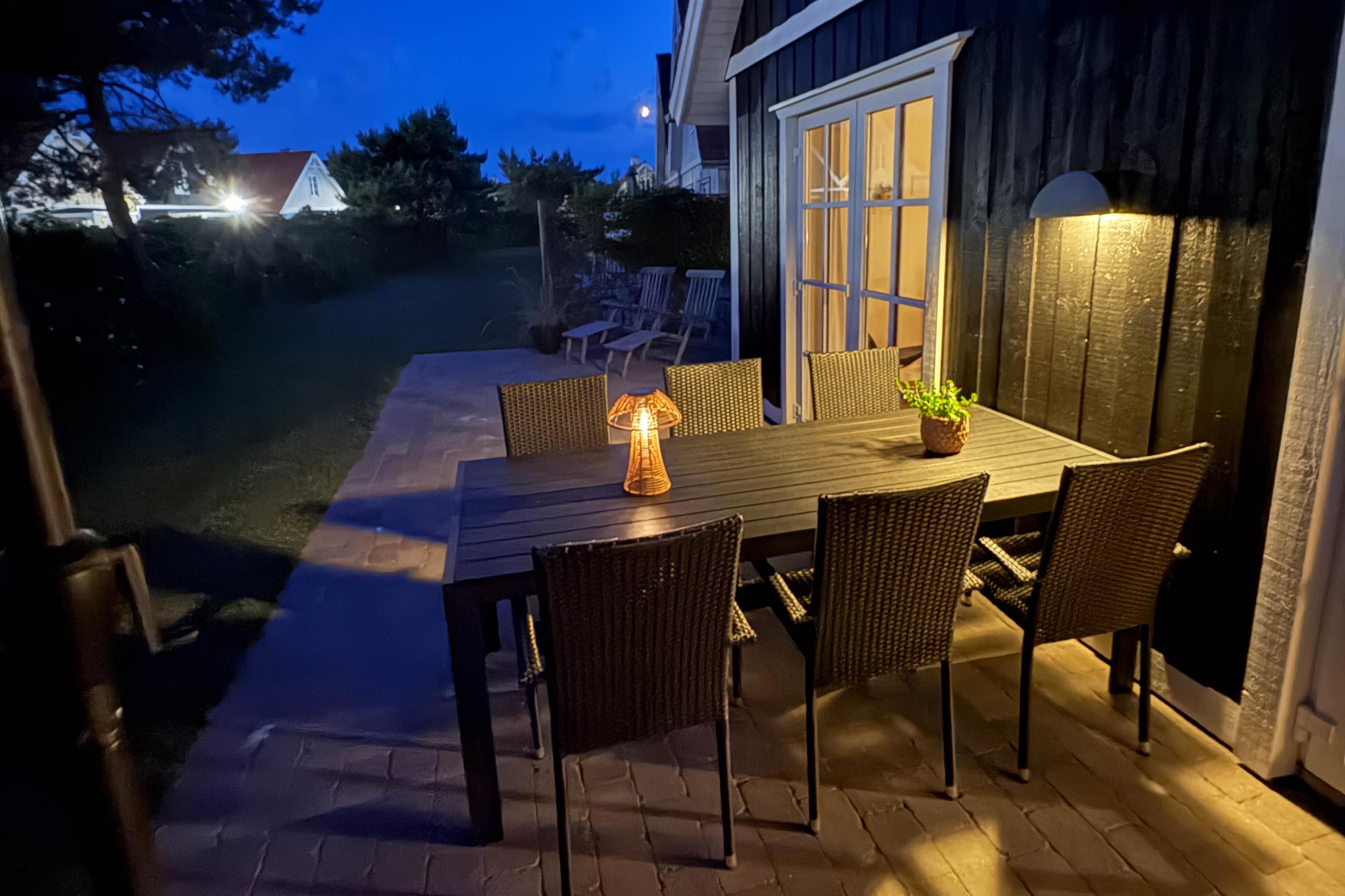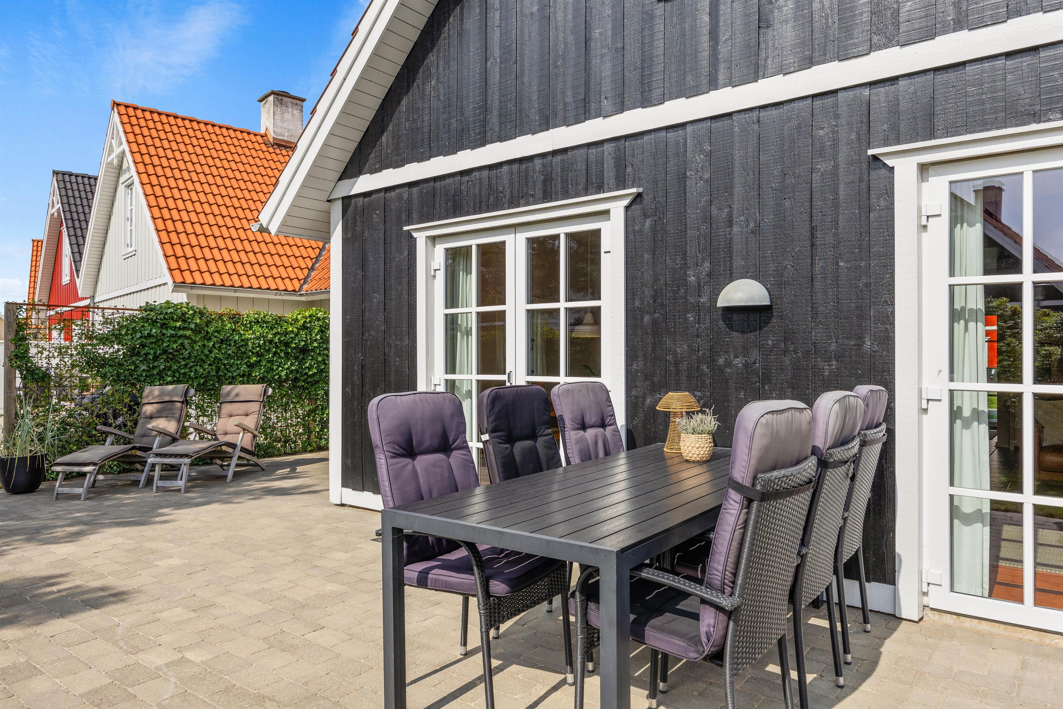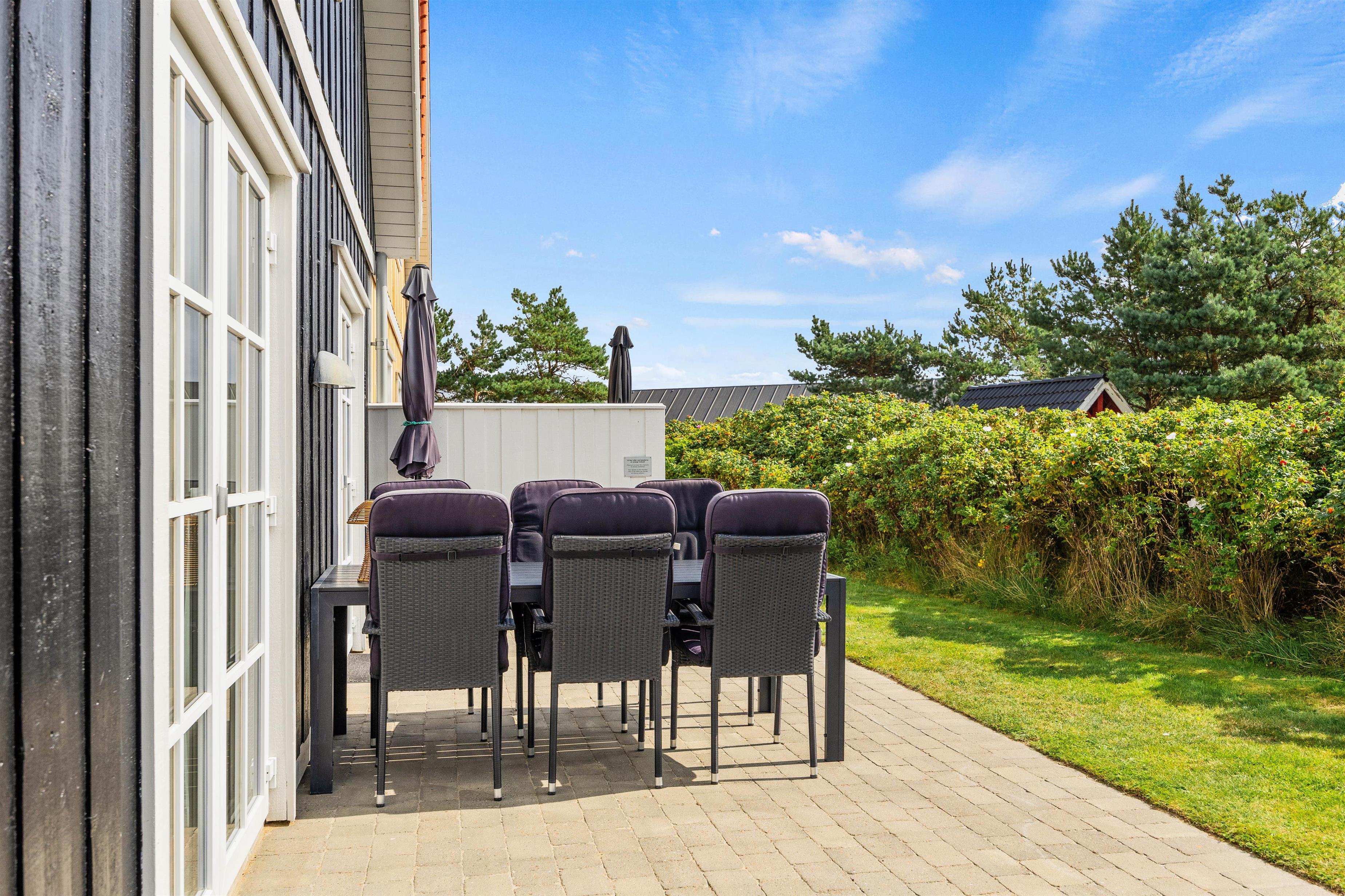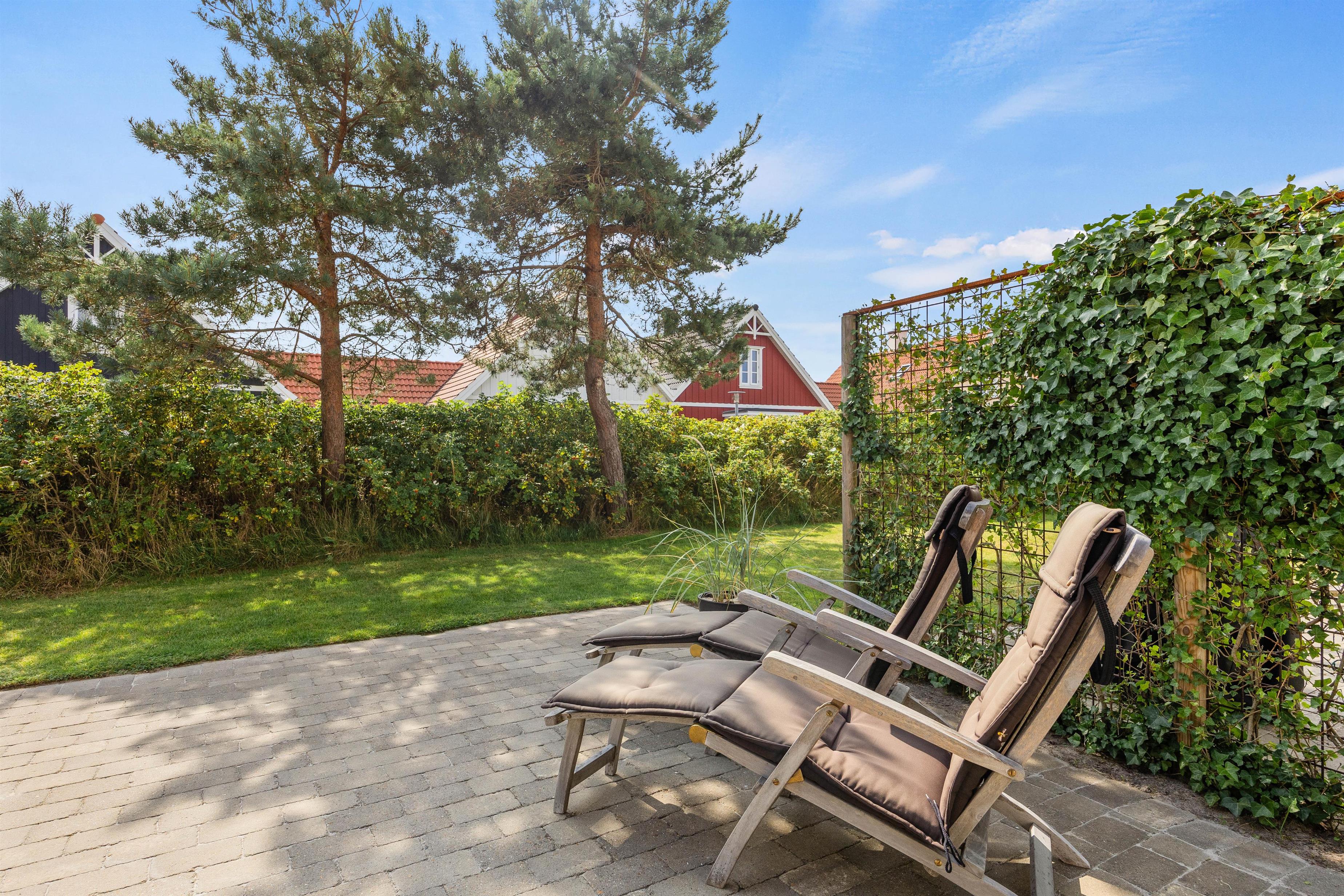 På de varme, solskinsfyldte feriedage skal I selvfølgelig udenfor. Ryk ud på terrassen, hvor I kan finde jer godt til rette i liggestole og havemøbler (bemærk blot, at havemøblerne er fjernet i vintermånederne). Terrassen er godt afskærmet af et hegn med slyngplanter og ligger godt for solen, så I kan have glæde af den det meste af dagen. Om aftenen kan I finde grillen frem og nyde en lækker middag med røde bøffer og god vin.