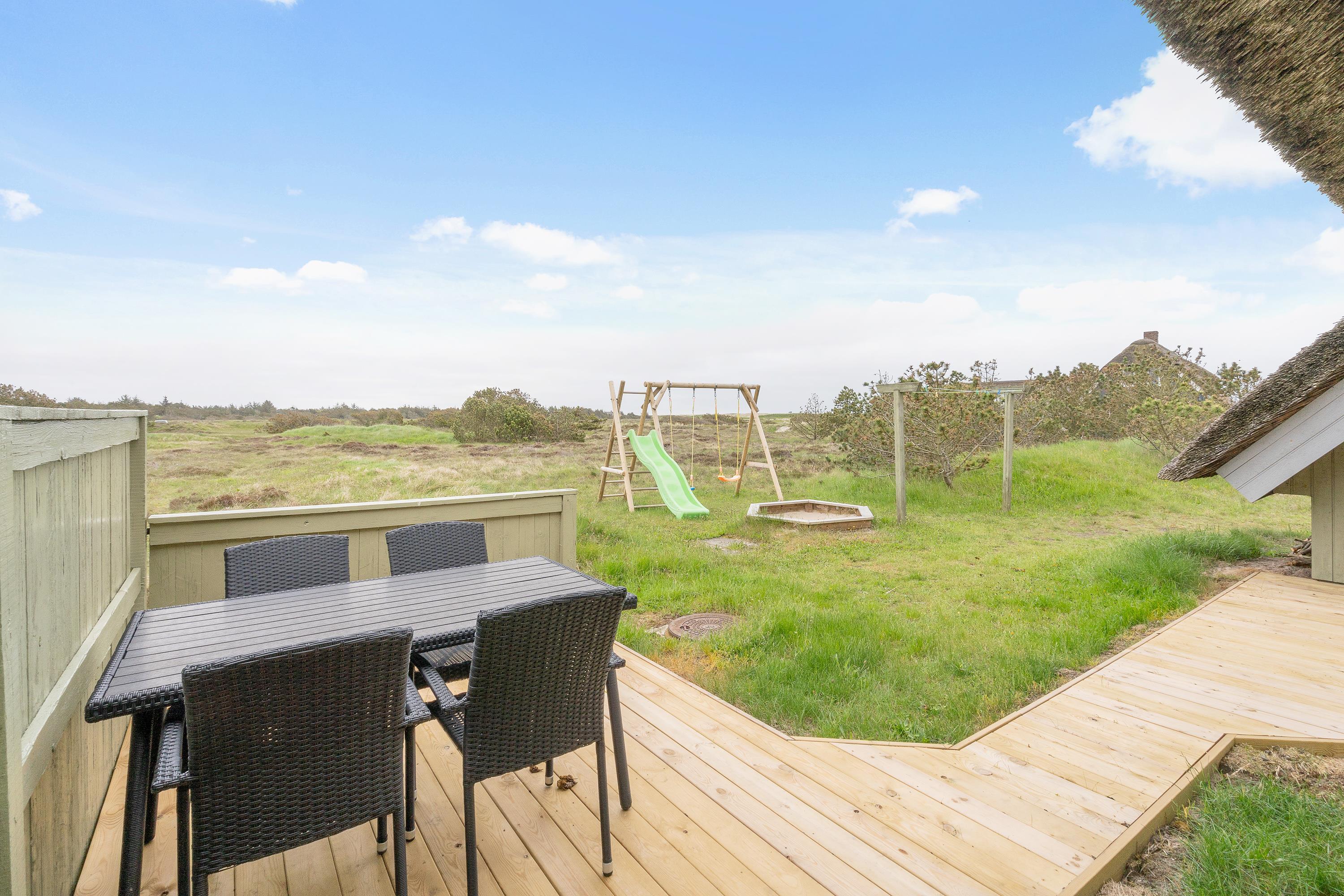 Fra stuen kommer I ud på feriehusets afskærmede og delvist overdækkede terrasse. Havemøbler, liggestole og grill står til rådighed, så I kan nyde solskinsdagene og slutte dagen af med en hyggelig grillaften, mens solen langsomt forsvinder ned i horisonten.