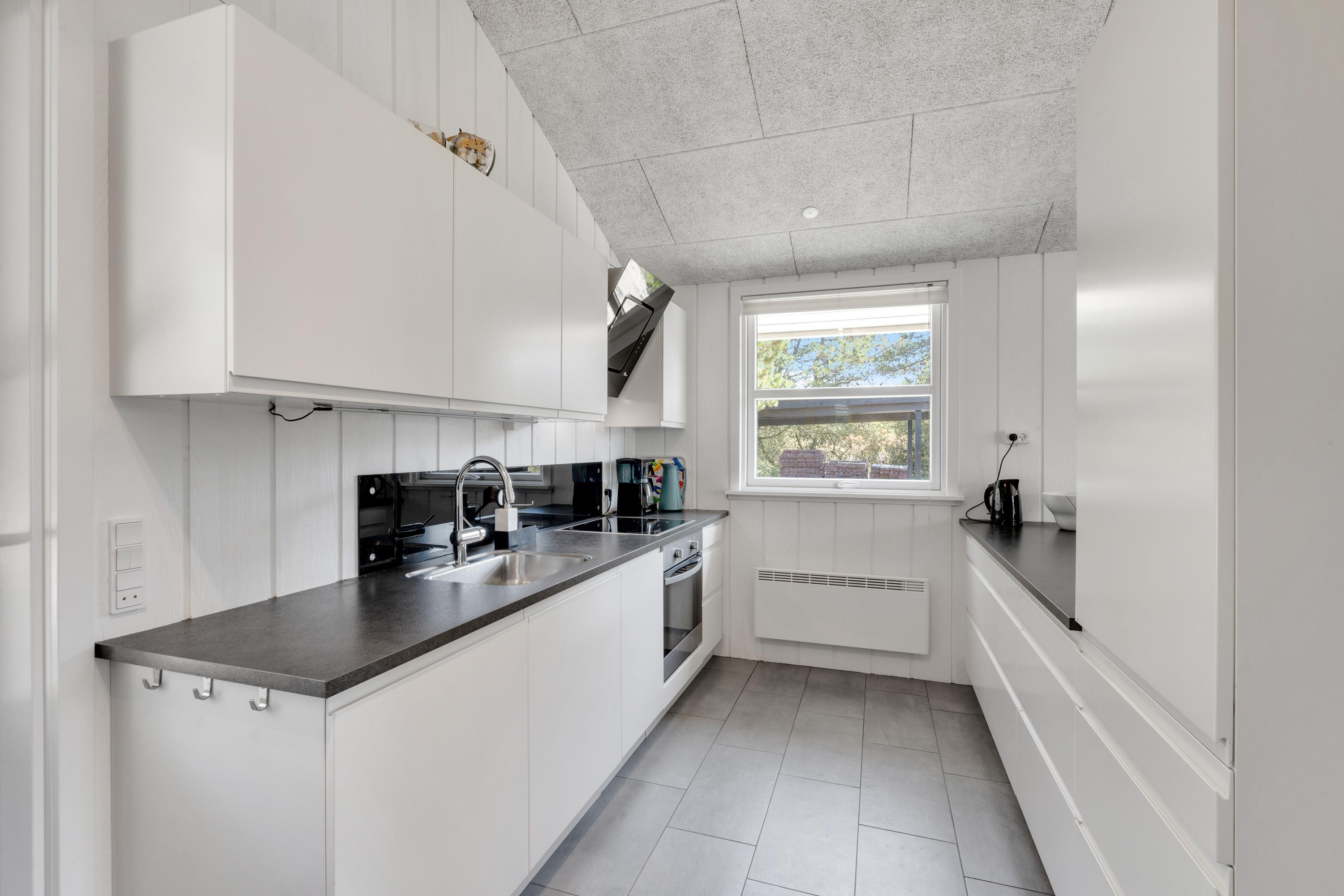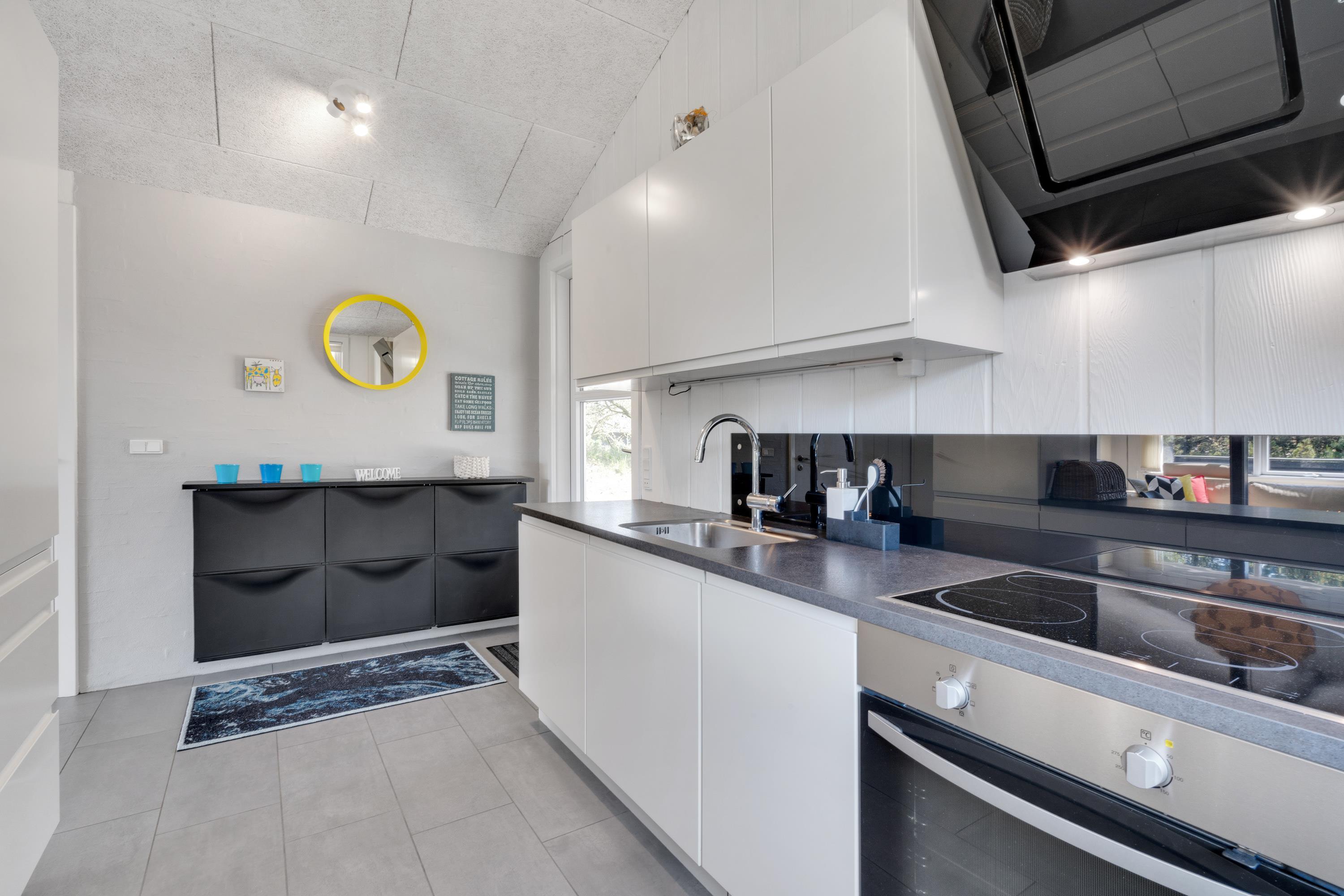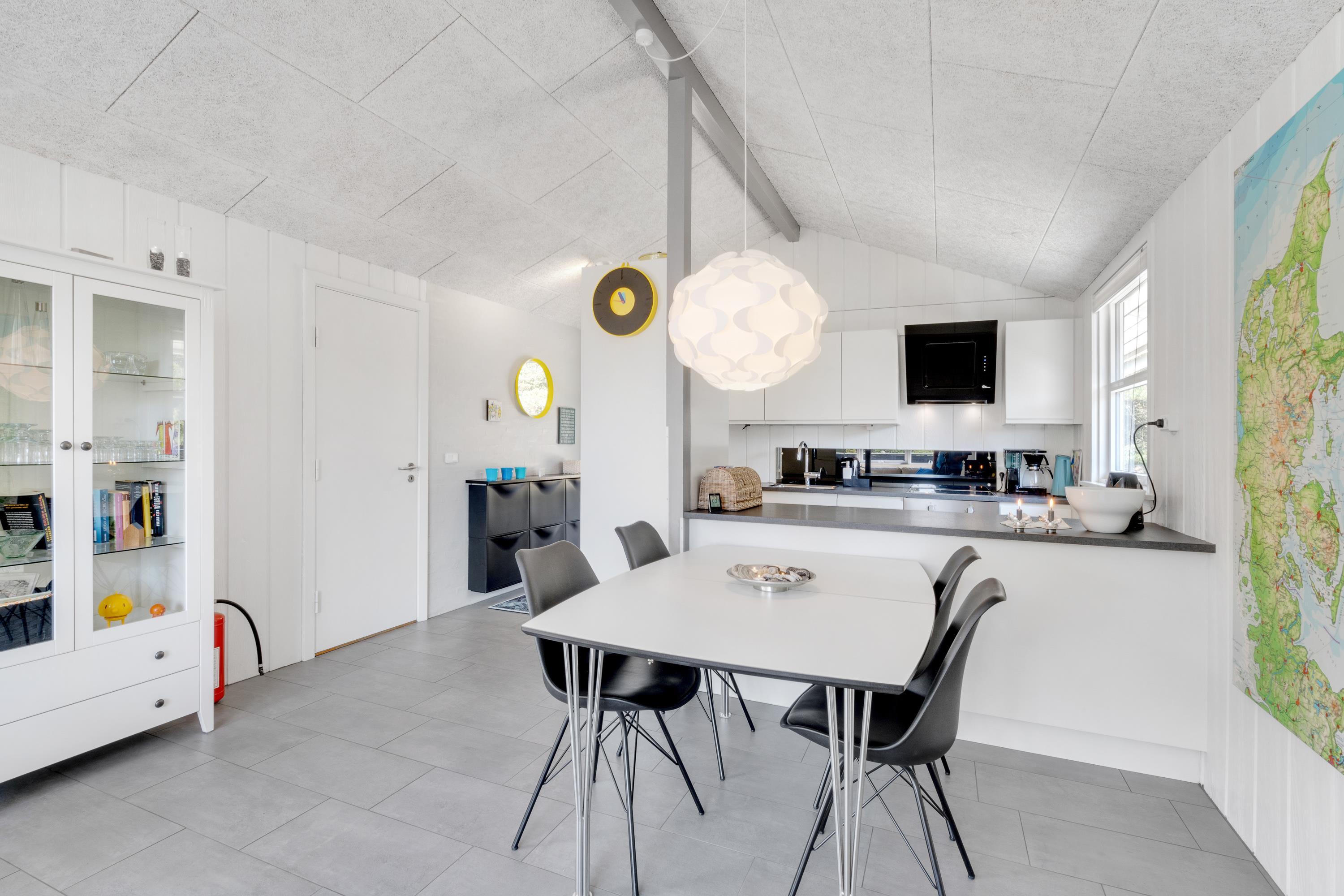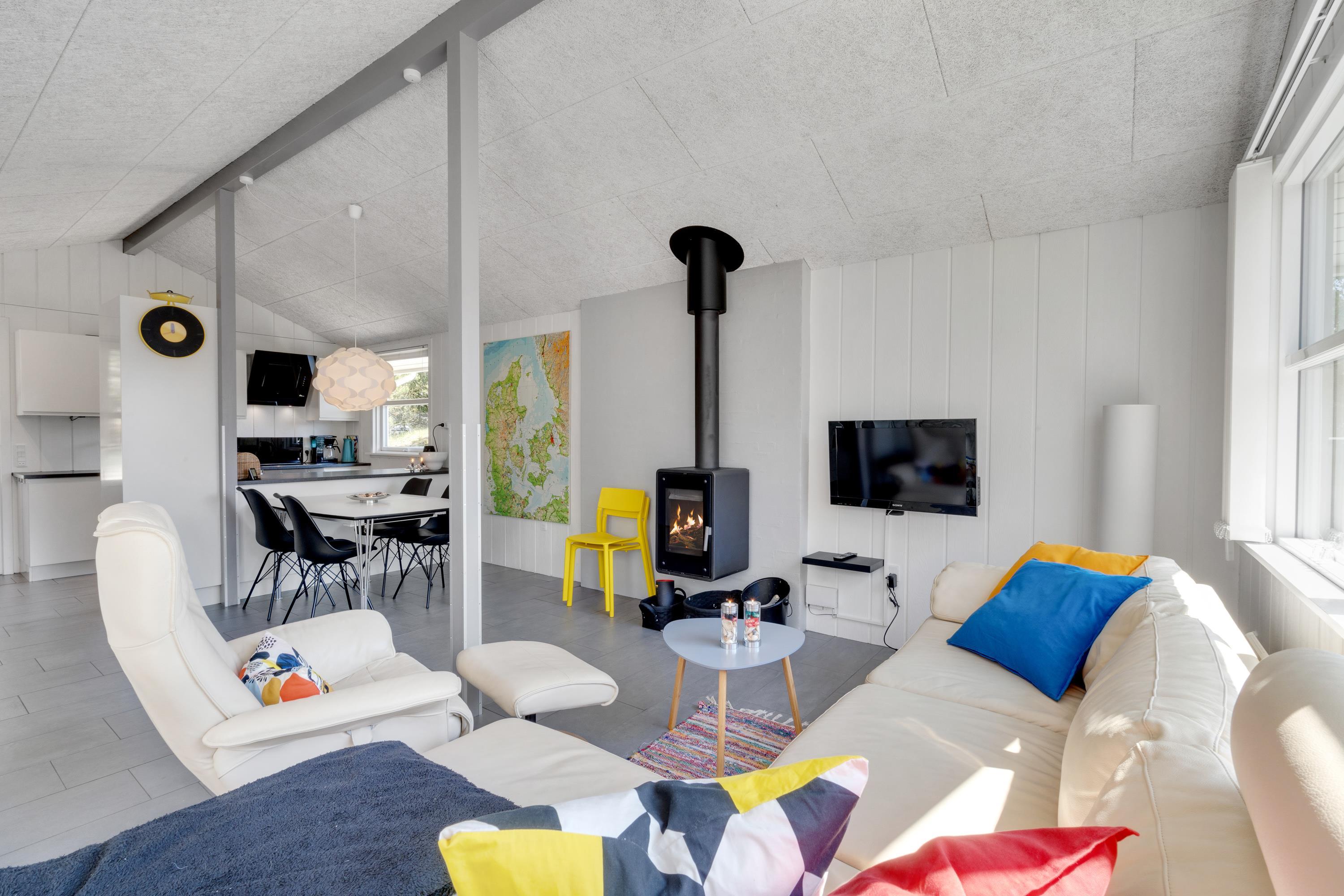 Derudover har sommerhuset et stort alrum, hvor køkken, stue og spiseafdeling er samlet i ét stort rum, hvor der er lagt op til mange dejlige feriestunder. Om I laver mad i køkkenet, spiller brætspil omkring bordet eller ser film i tv’et, bidrager brændeovnen med ekstra hyggelig stemning og god varme.