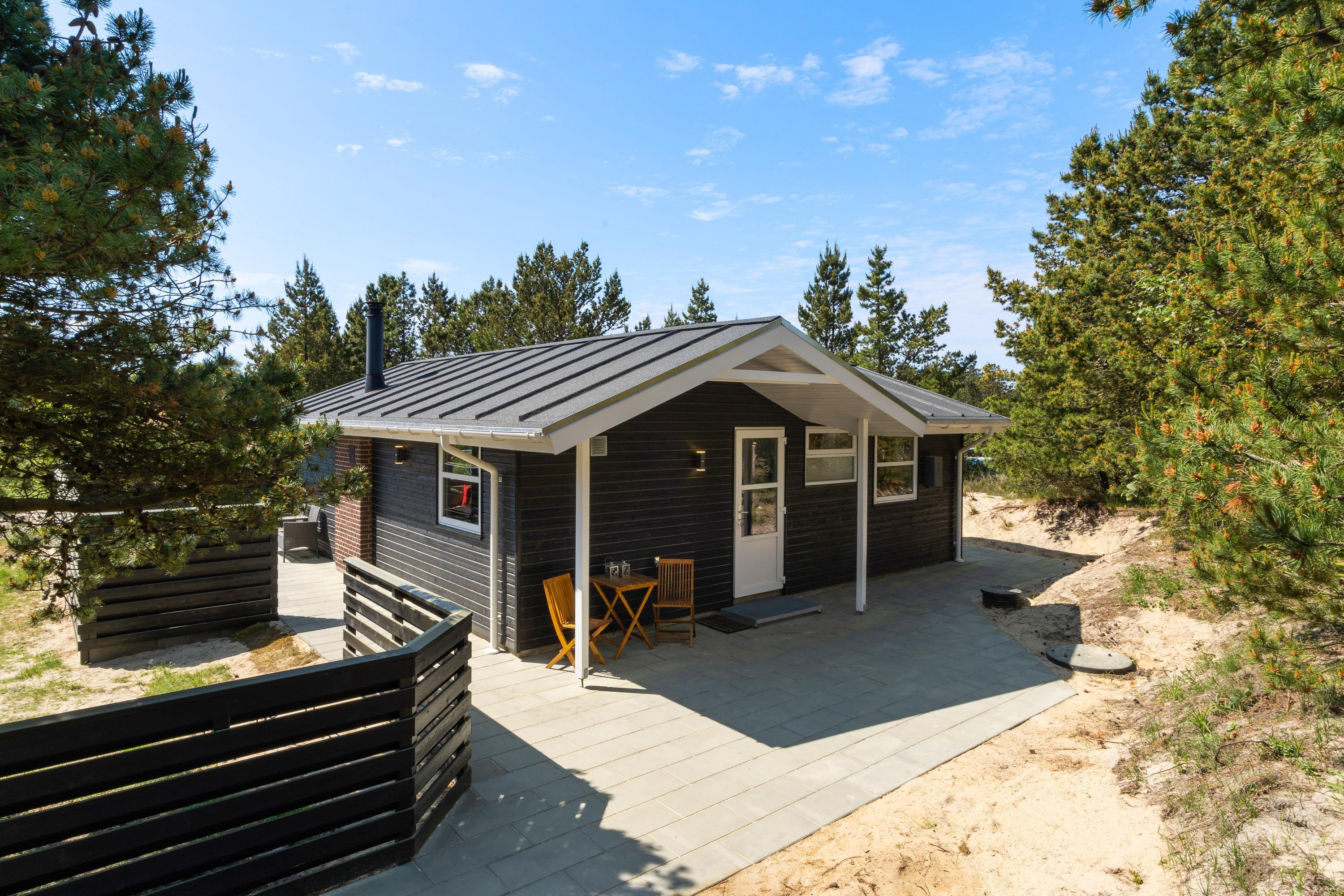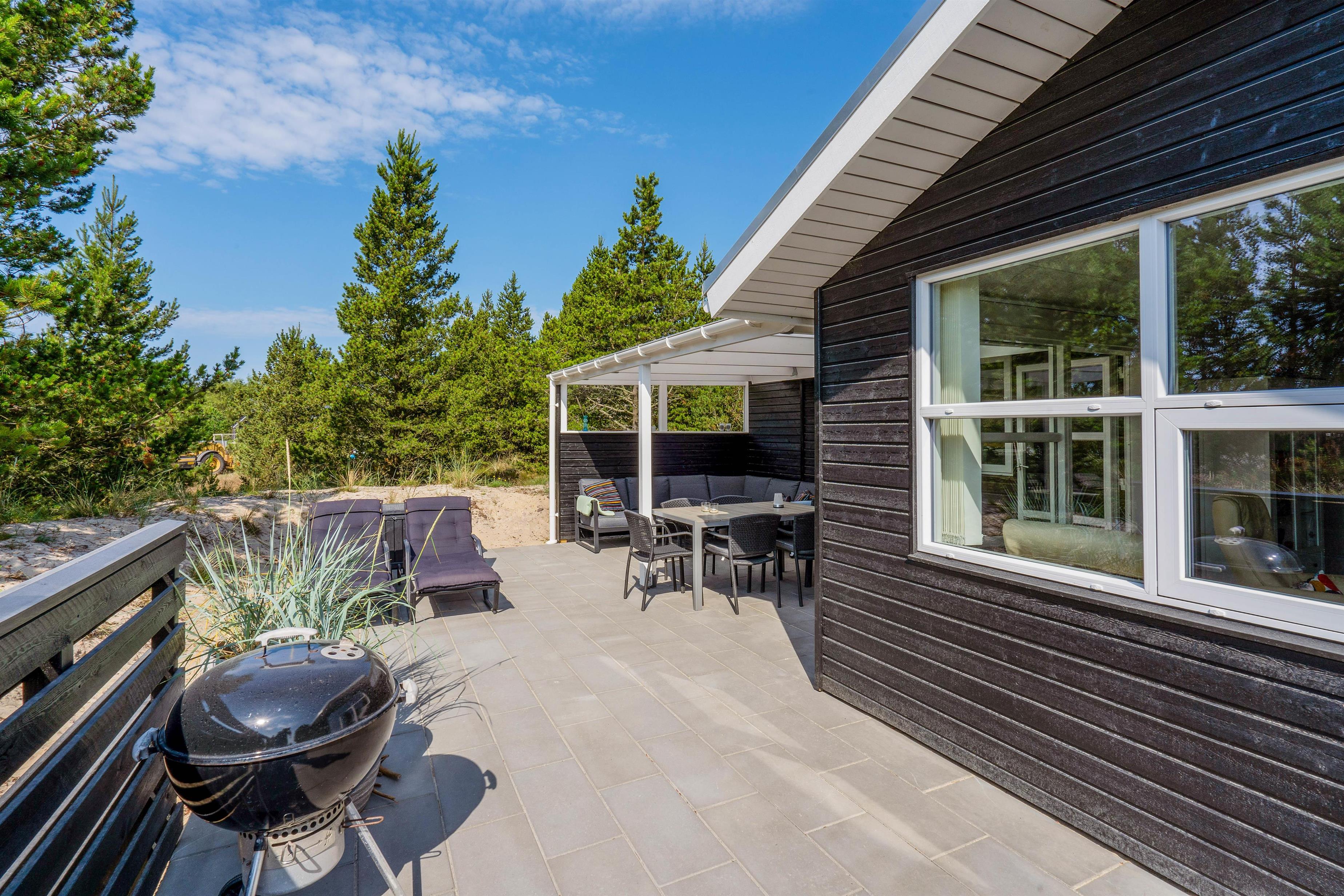 Terrassen er afskærmet og delvist overdækket, så her kan I også sidde i både ly og læ. Desuden sidder I også uforstyrret på terrassen takket være de høje træer, der omgiver sommerhuset.