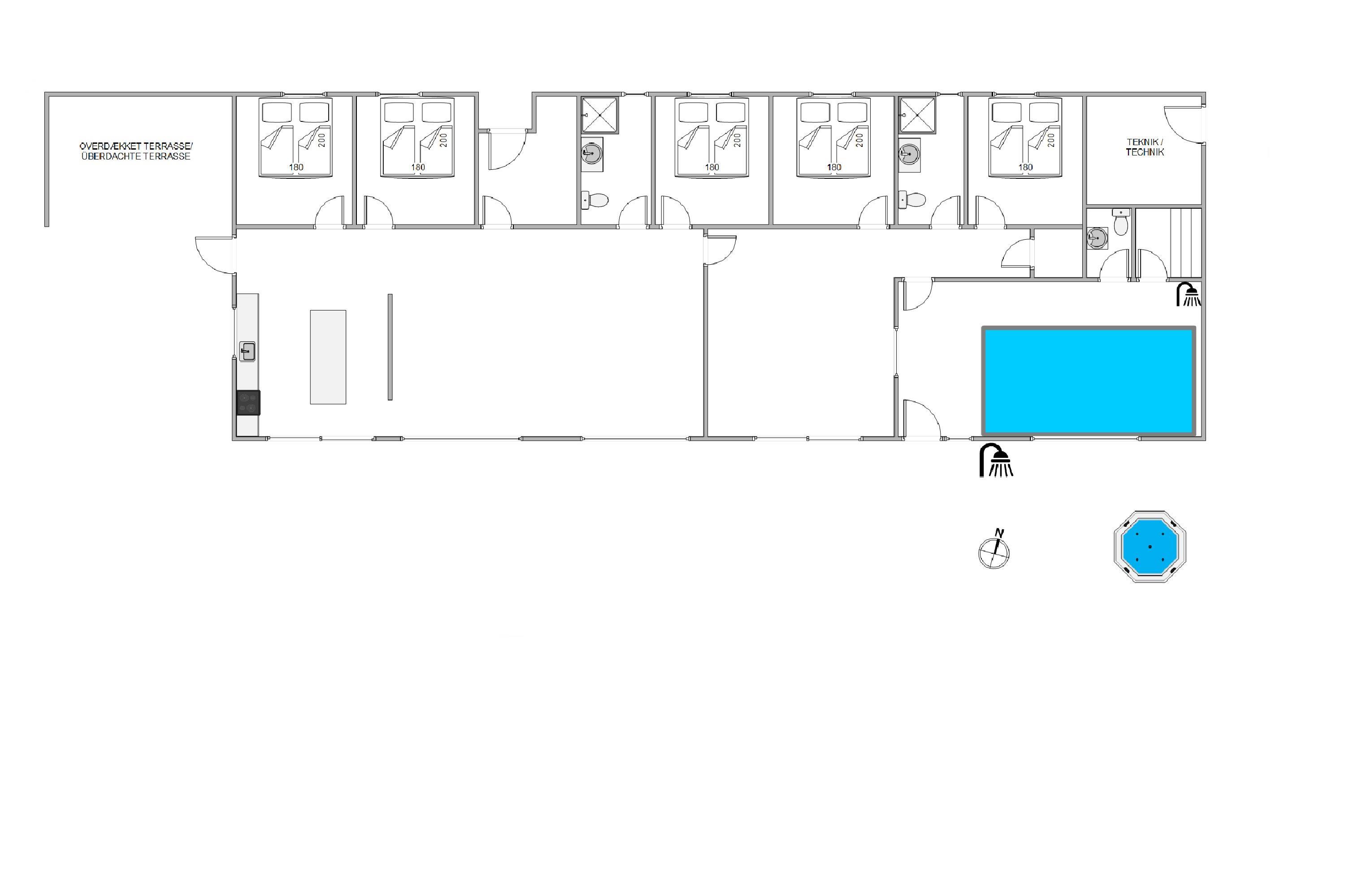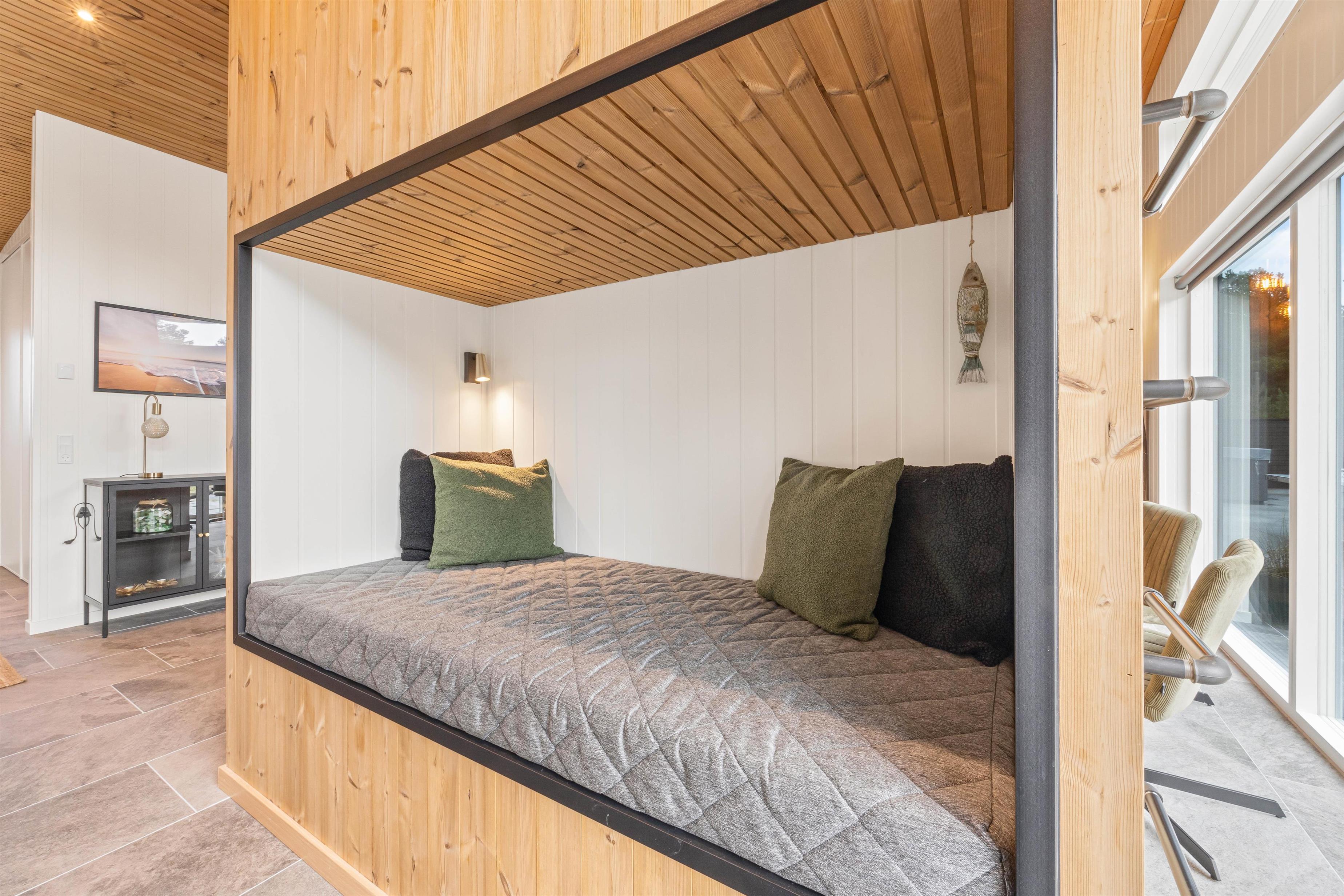 Når feriedagen lakker mod enden, og der skal samles ny energi kan I gå til køjs i et af de 5 soverum med dobbeltsenge, der måler 180x200cm. I køkkenalrummet er der også en indbygget alkove og en hems, der kan benyttes af flere på en gang. Her er lagt op til samvær og hygge på flere planer i den spændende indretning.