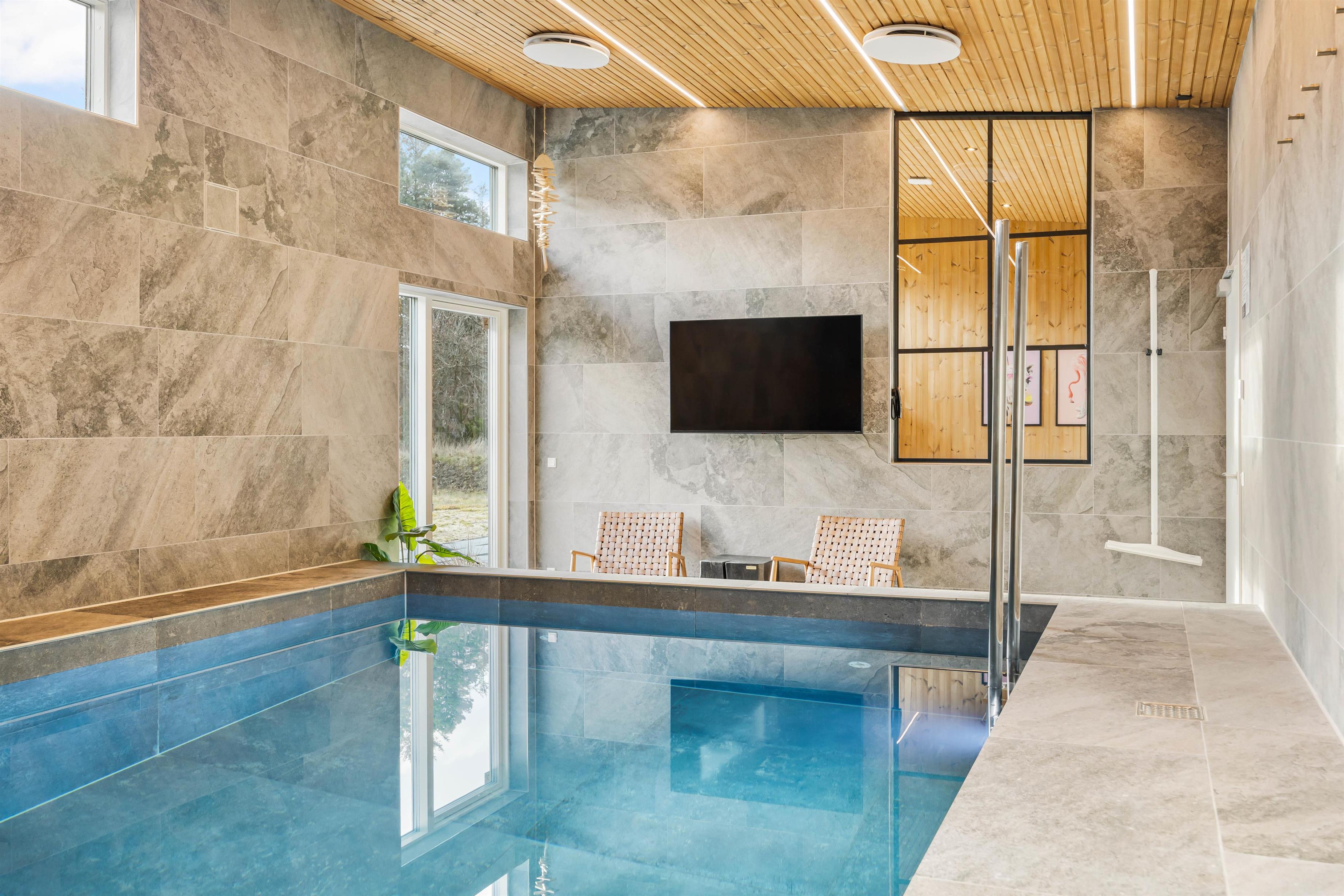 Det luksuriøse feriehus byder på et væld af underholdende og afslappende faciliteter, der tilgodeser stort set alle interesser og behov på ferien. Poolen kan få alle vandhunde på dupperne, og har indbygget ”svømmetræner” samt mulighed for at have musikvideoer og anden underholdning kørende på væggens Smart-tv/fladskærm. En hjemmespa dag er også en mulighed, hvor der blandt andet kan slappes af i varmen i den tilhørende sauna.