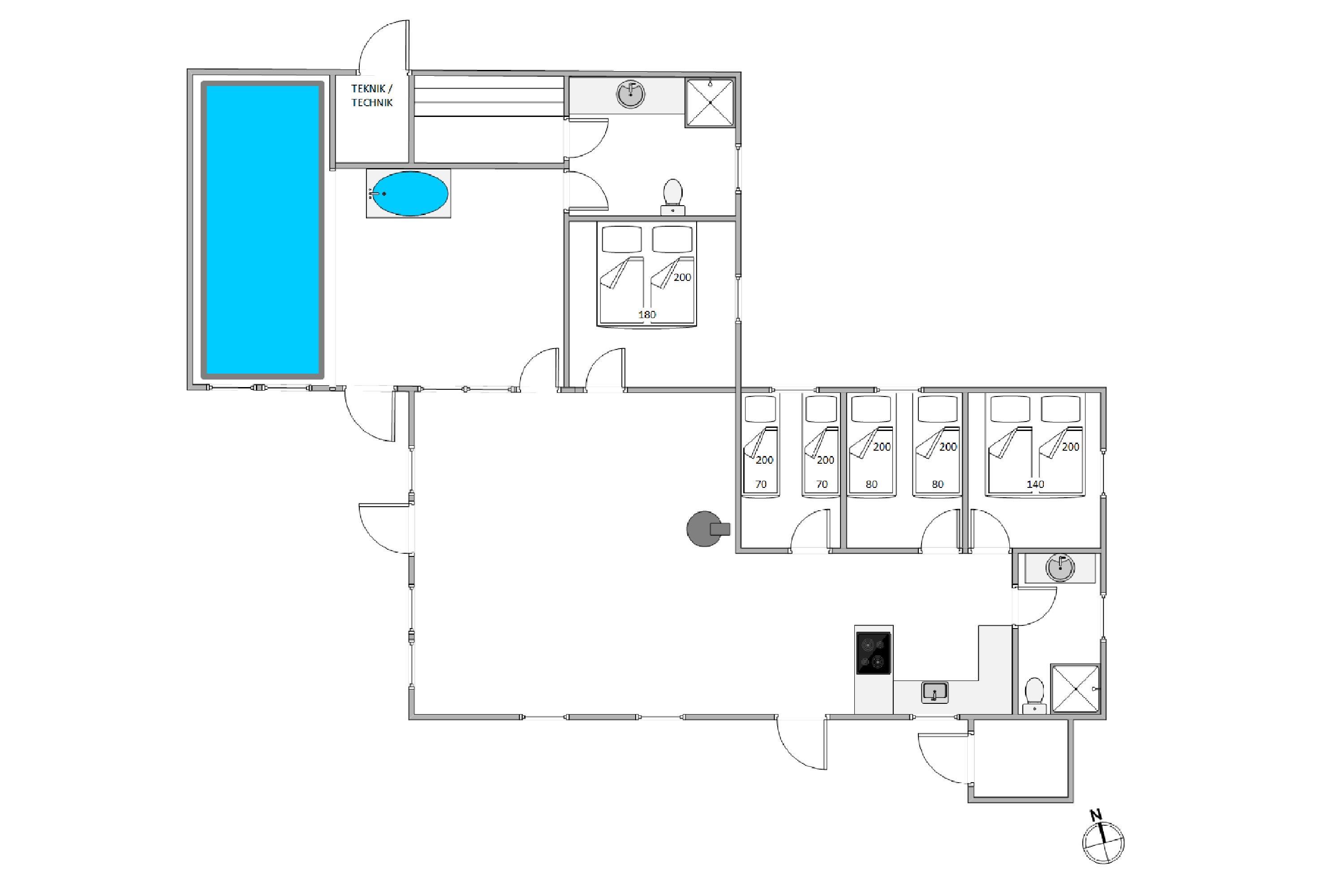 Huset er oplagt til en familieferie, og især børnene vil få glæde af det store poolrum med indendørs swimmingpool og spabad, hvor der kan leges og bades hele året rundt. Imens kan de voksne slappe af i den dejlige sauna og nyde lidt ekstra wellness.