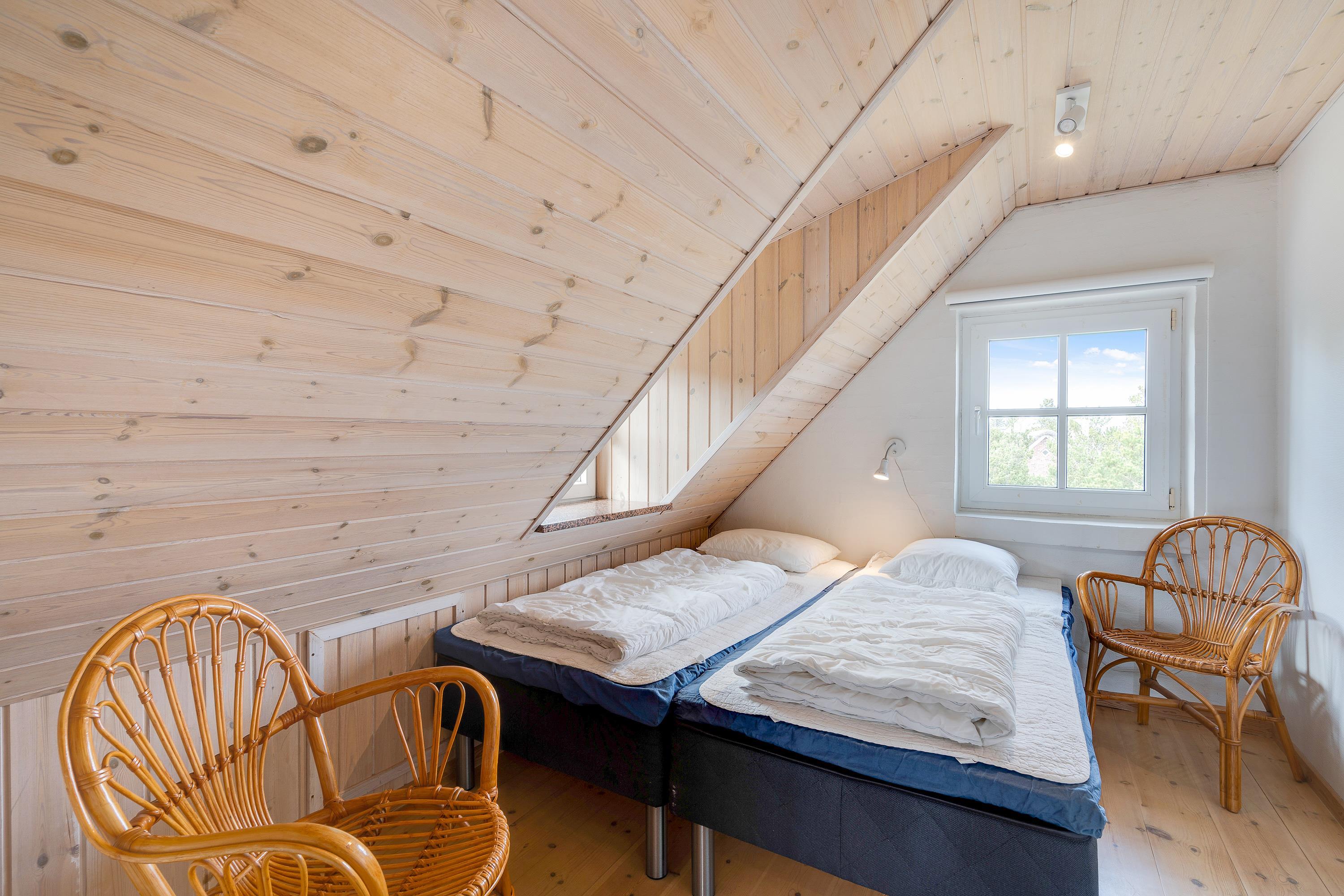 Sommerhuset er særdeles velindrettet, så der er god plads til alle 12 feriegæster. På feriehusets 2 etager finder I 6 soveværelser, 2 badeværelser med gulvvarme og 1 gæstetoilet. Fra stuen på førstesalen kan I træde ud på en altan, hvorfra I kan nyde en dejlig udsigt over området.