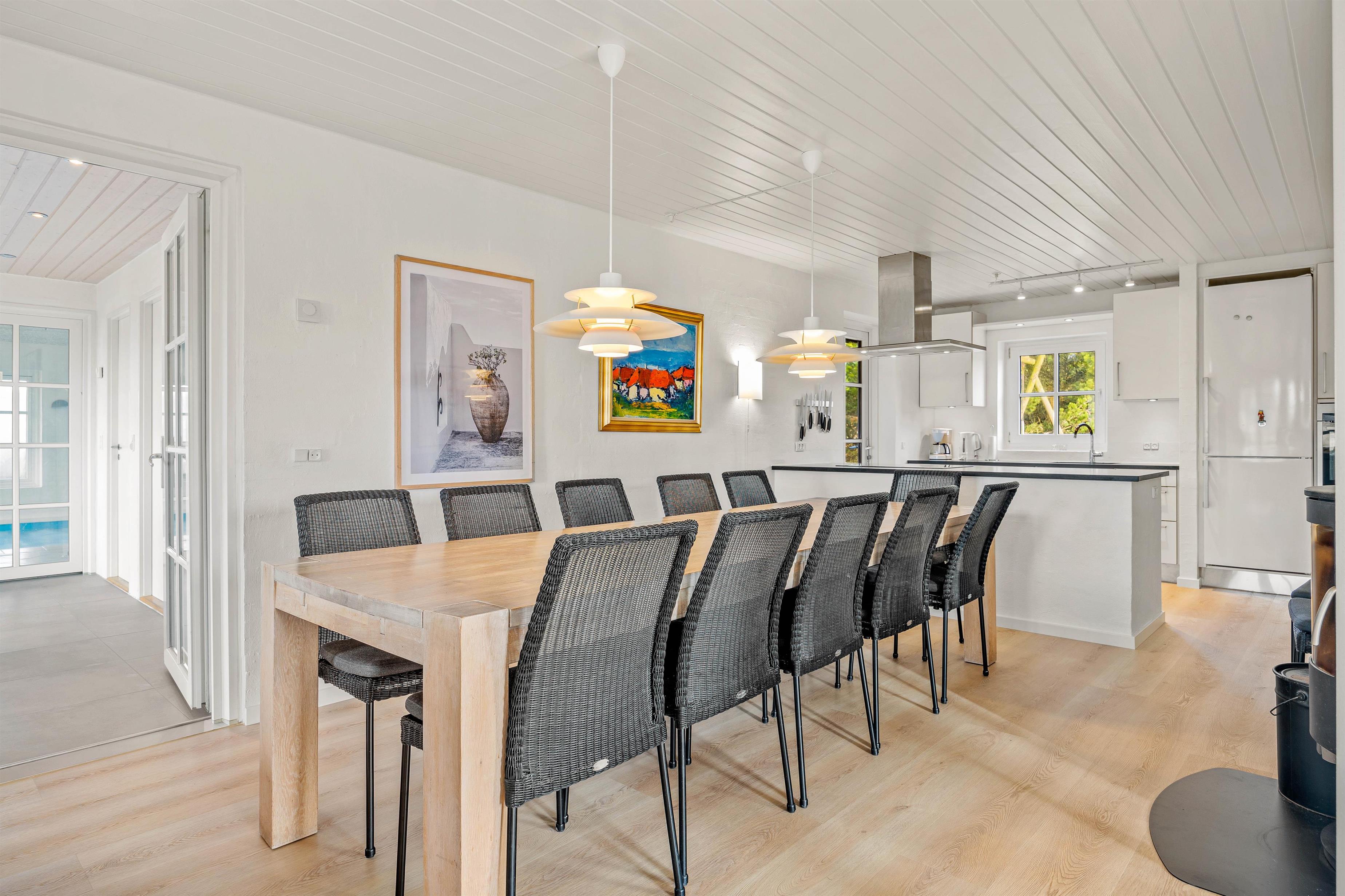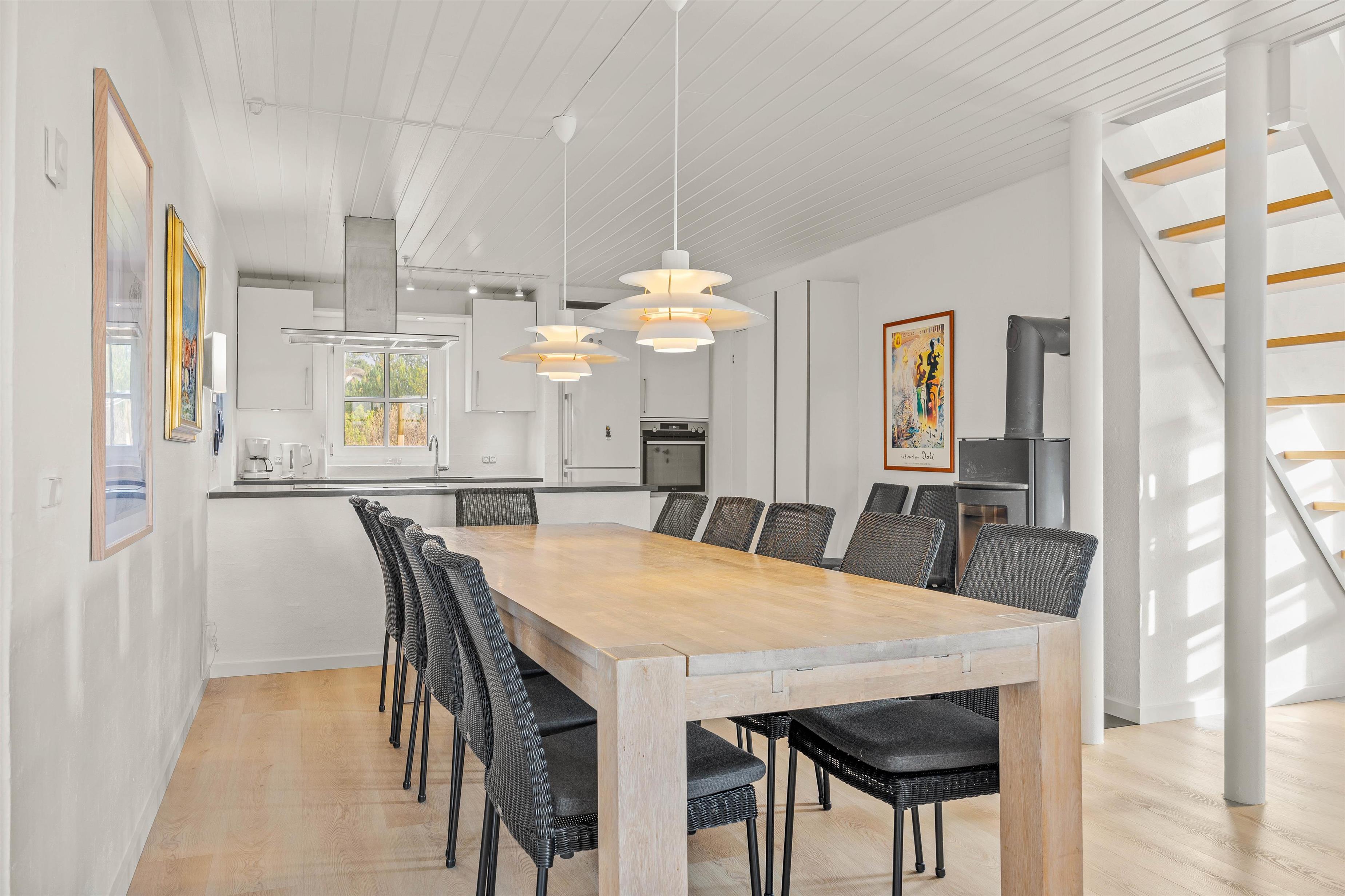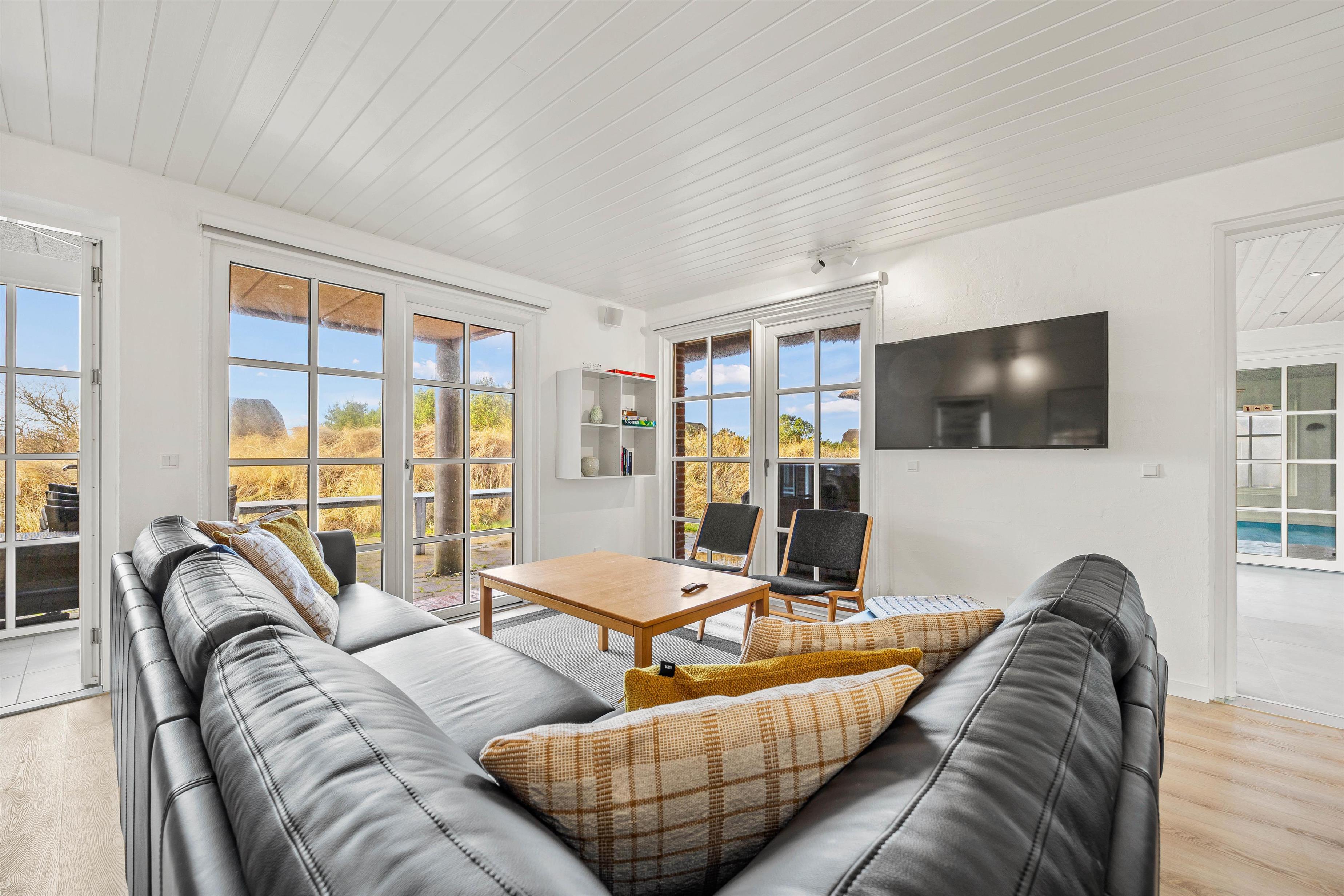 Hjertet i feriehuset er det store lyse opholdsrum, hvor køkken, stue og spiseafdeling er samlet i ét rum. Her kan I nyde hinandens selskab, selv når nogle sørger for maden i køkkenet og andre ser tv i stuen. Desuden er der også en stue på førstesalen, hvor der også er både sofaer og tv.
