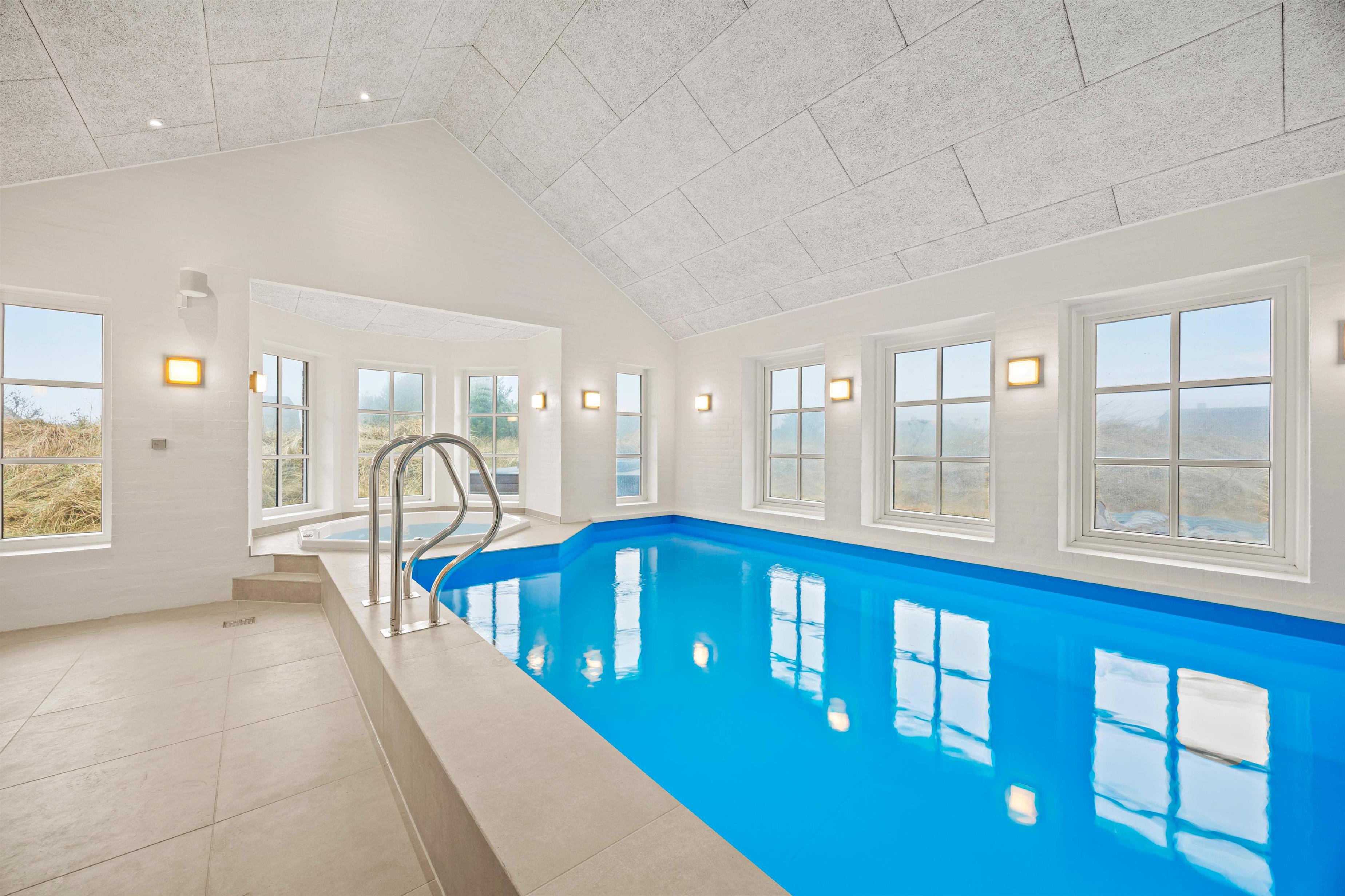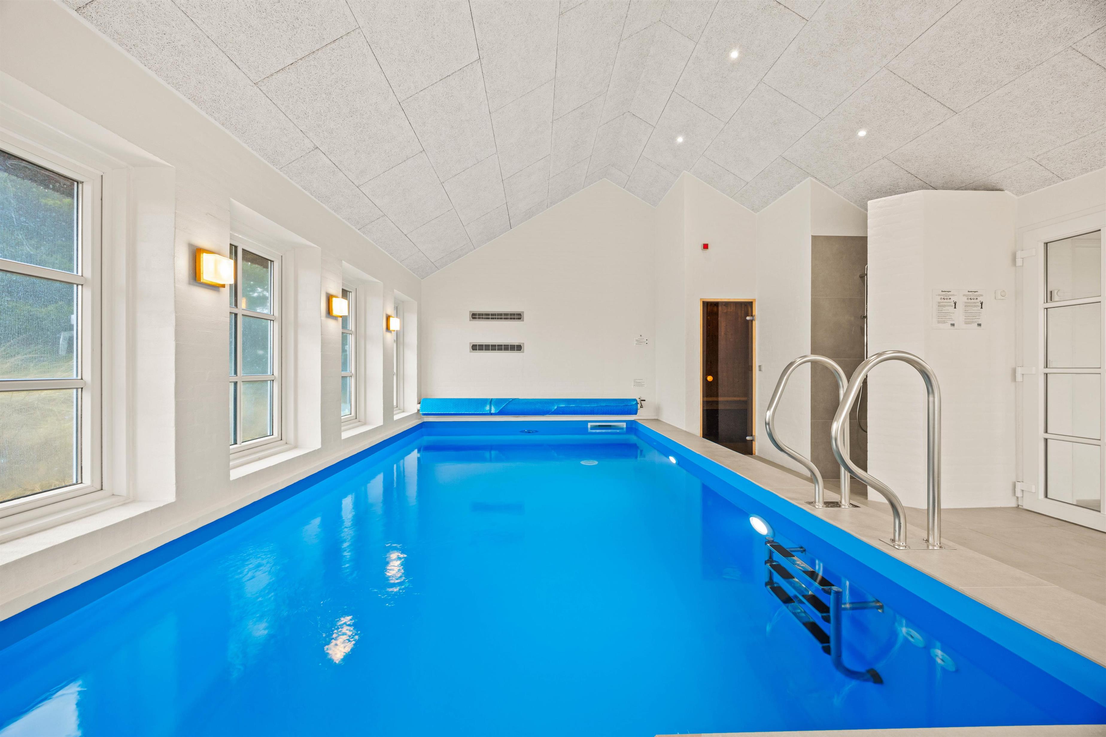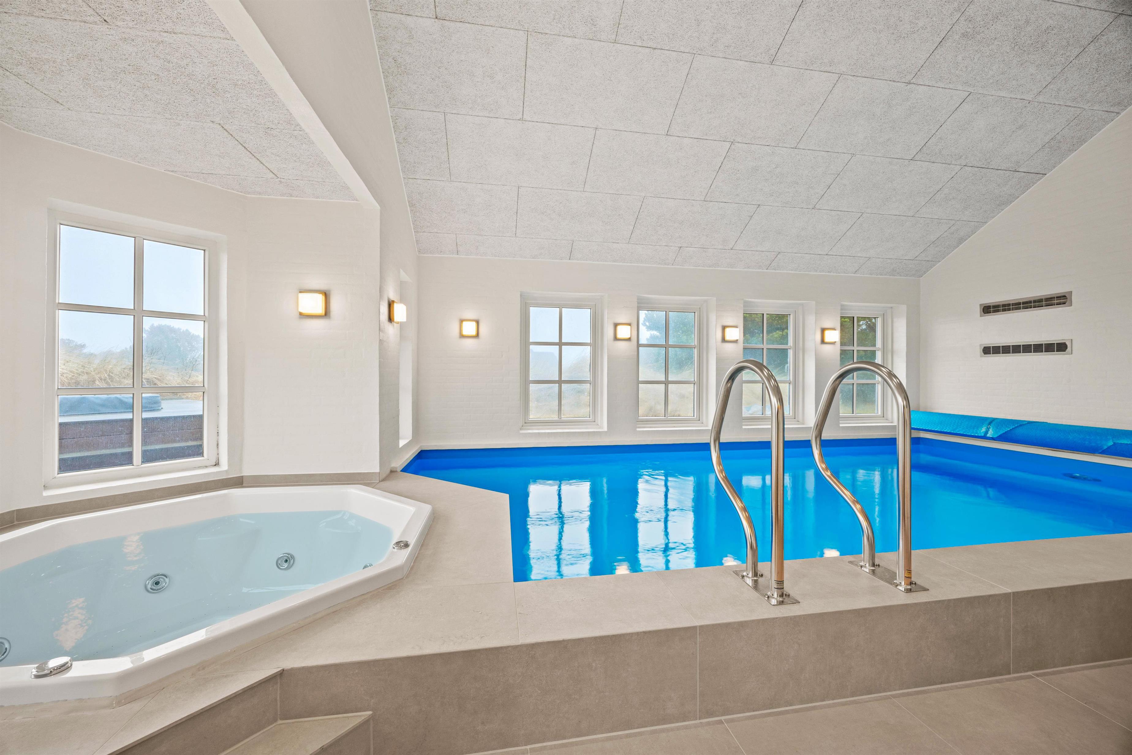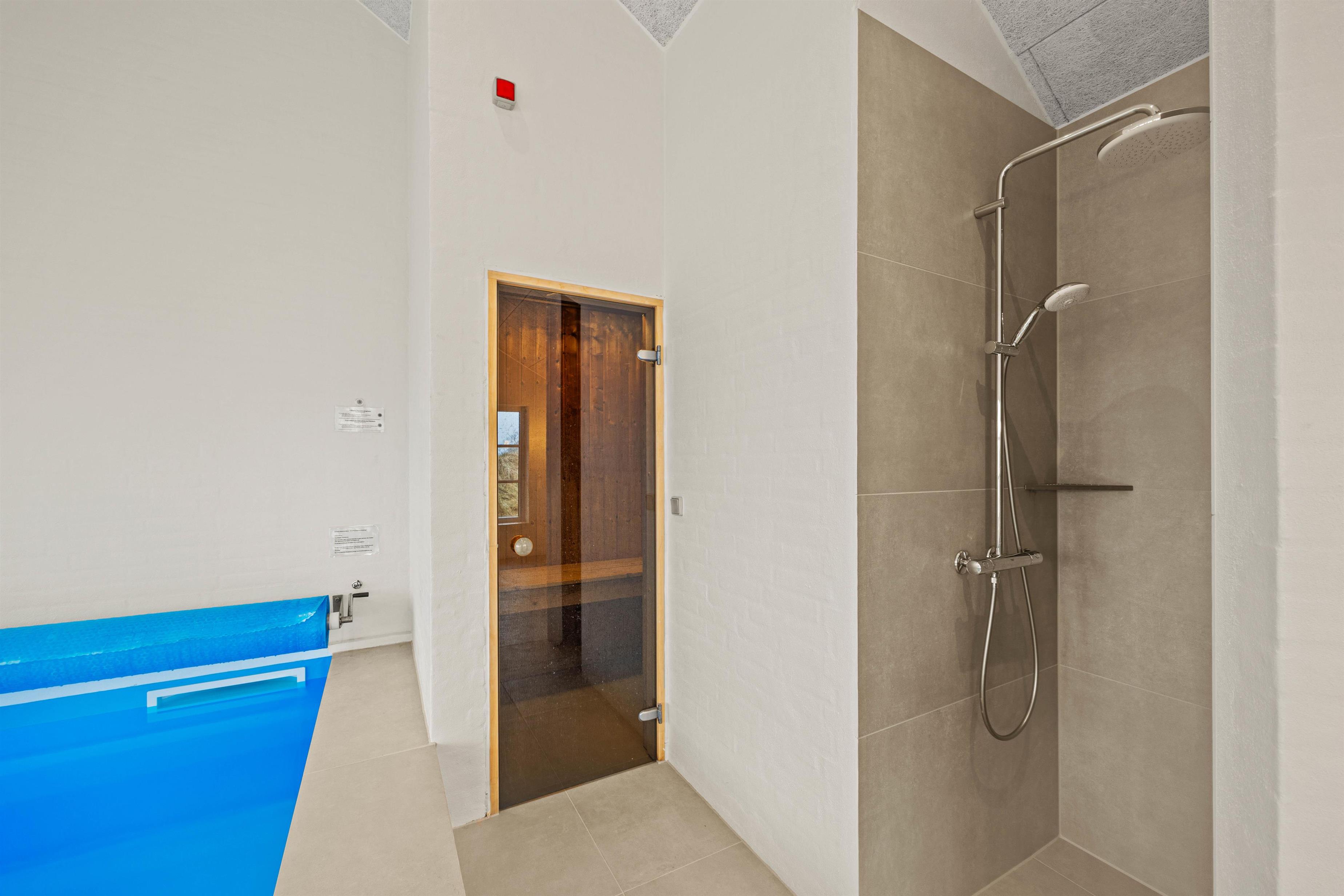 Et af de store højdepunkter i sommerhuset er det store poolrum. Her står den 20 kvadratmeter store swimmingpool med svømmetræner klar til de friske vandhunde. Her er der lagt op til mange timers sjov og leg i vandet. Poolen er udstyret med automatisk klorreguleringssystem for et bedre bademiljø og dermed en bedre oplevelse. Efterfølgende kan I hoppe en tur i saunaen for at komme helt ned i gear igen.