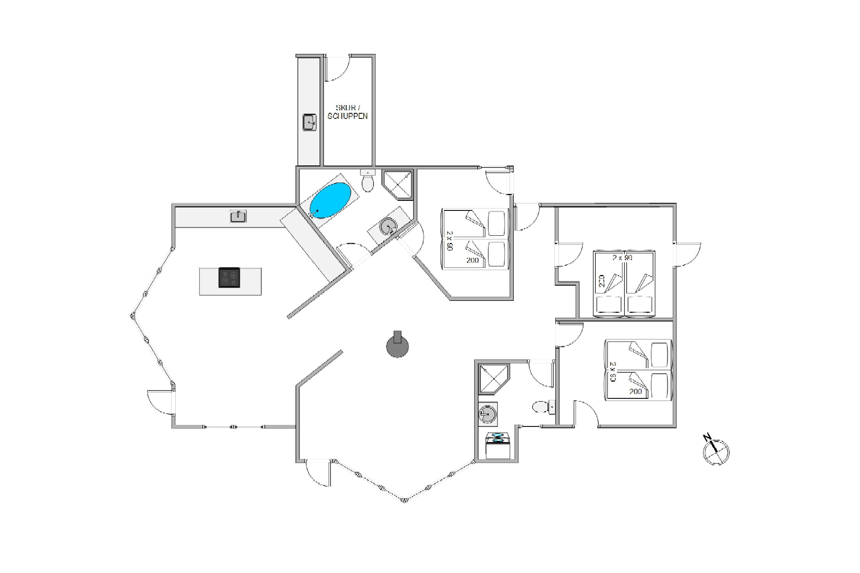Køkkenet ligger i åben forbindelse med spise- og dagligstue, og huset er udstyret med en separat fryser på 60 liter, som I hurtigt vil kunne få fyldt op, da der kun er omkring 1 kilometer til indkøbsfaciliteterne i Blåvand by. Der er mikroovn i køkkenet og en opvaskemaskine, så I også kan lave hurtige måltider, der kun kræver en opvarmning – og hurtigt kan få servicet væk fra bordet til effektiv afvaskning.