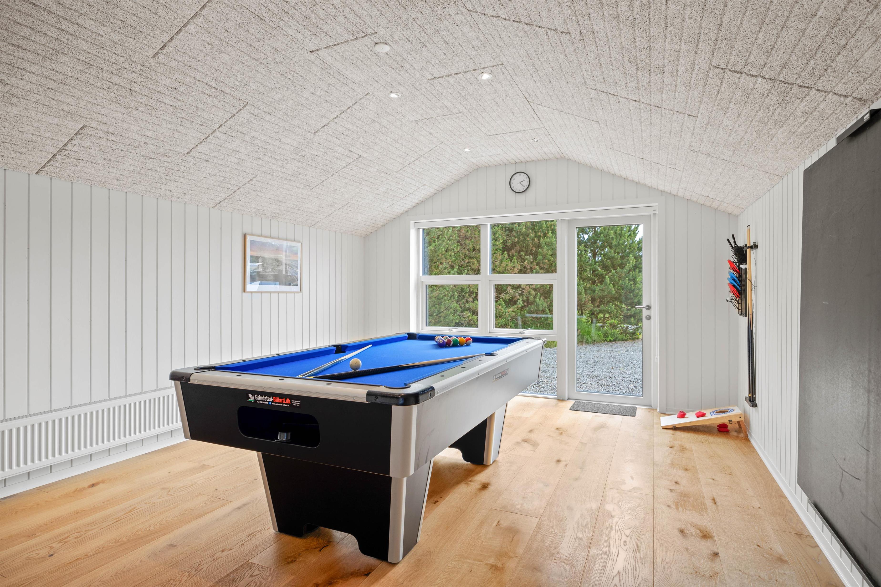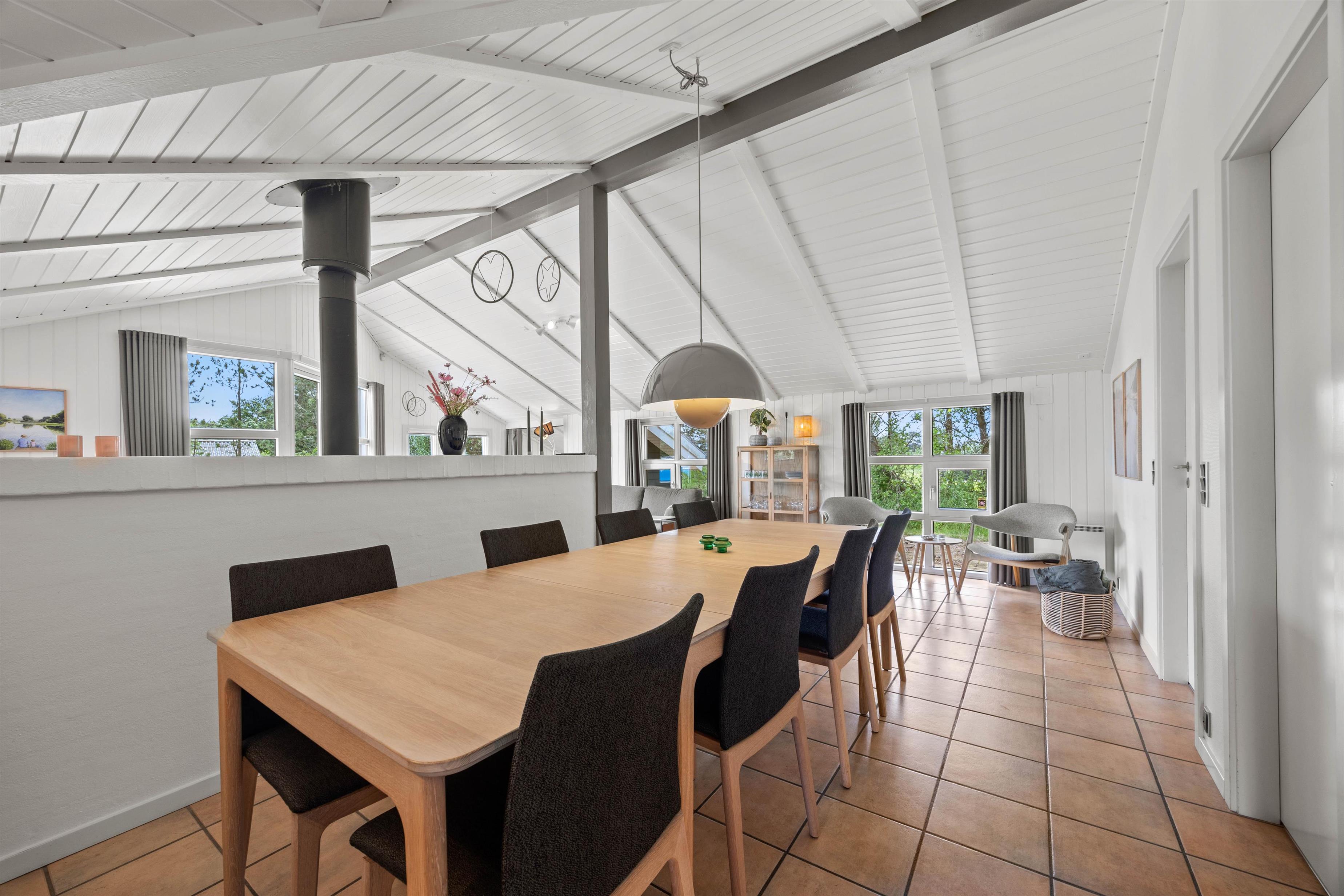 I Strandparken 9 føler man sig velkommen straks, man træder ind i det hyggelige sommerhus. Den lyse indretning, god plads på de 150 veldisponerede m2 og det fine lysindfald fra vinduespartierne sætter feriestemningen i top. Her er idéelt til den aktive familie og venner, som holder af at dyrke både aktiviteter og afslapning sammen. I stuen kan I hygge jer sammen foran brændeovnen – se en film, eller nyde udsigten over terrassen og plænegrunden. I det åbne køkken er alt, hvad I har brug for til at forkæle hinanden med hjemmelavede måltider. Lystfiskerne iblandt jer vil glædes over den separate fryser på 200 liter. De aktive kan tage sig et spil billard eller bordtennis før middagen.