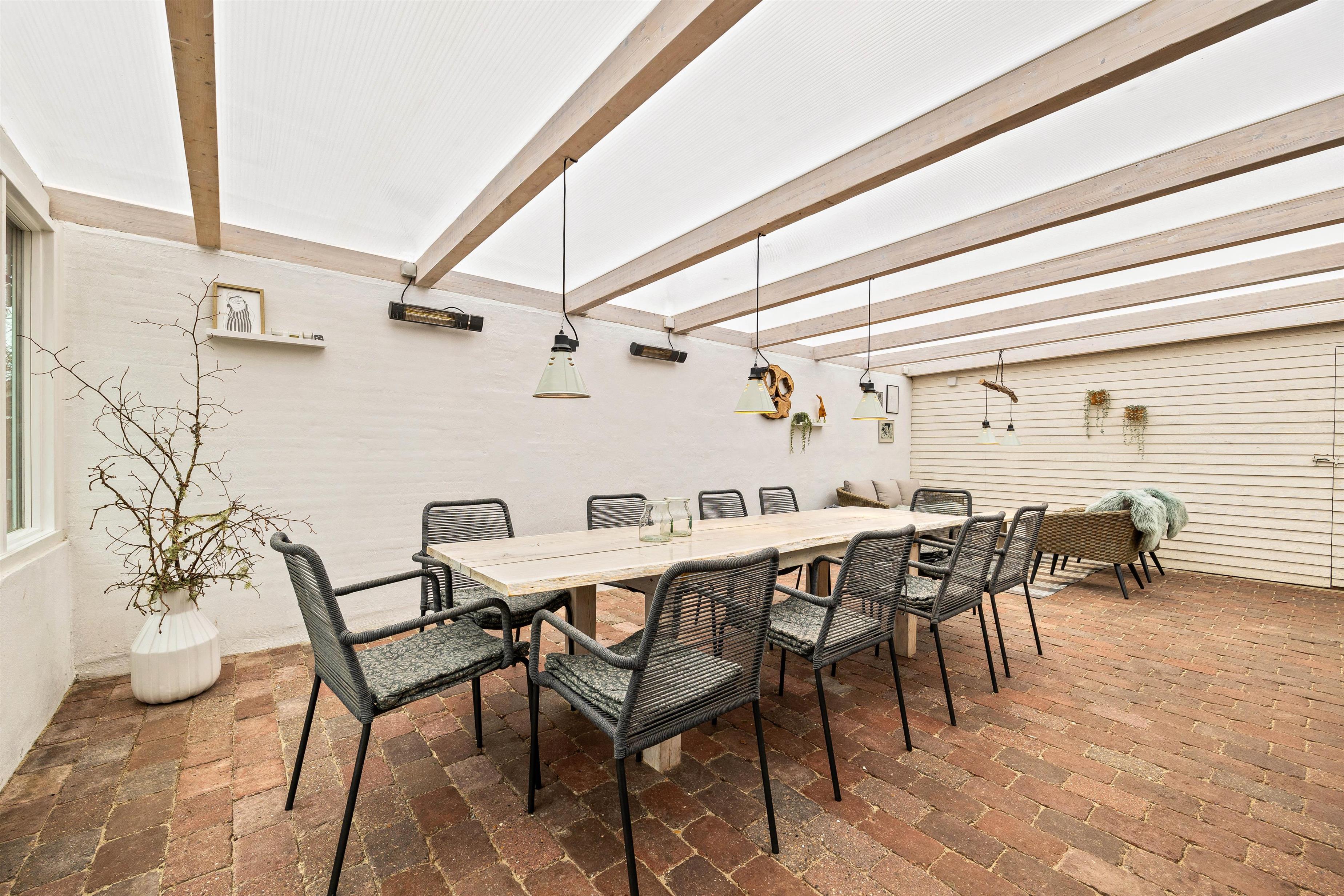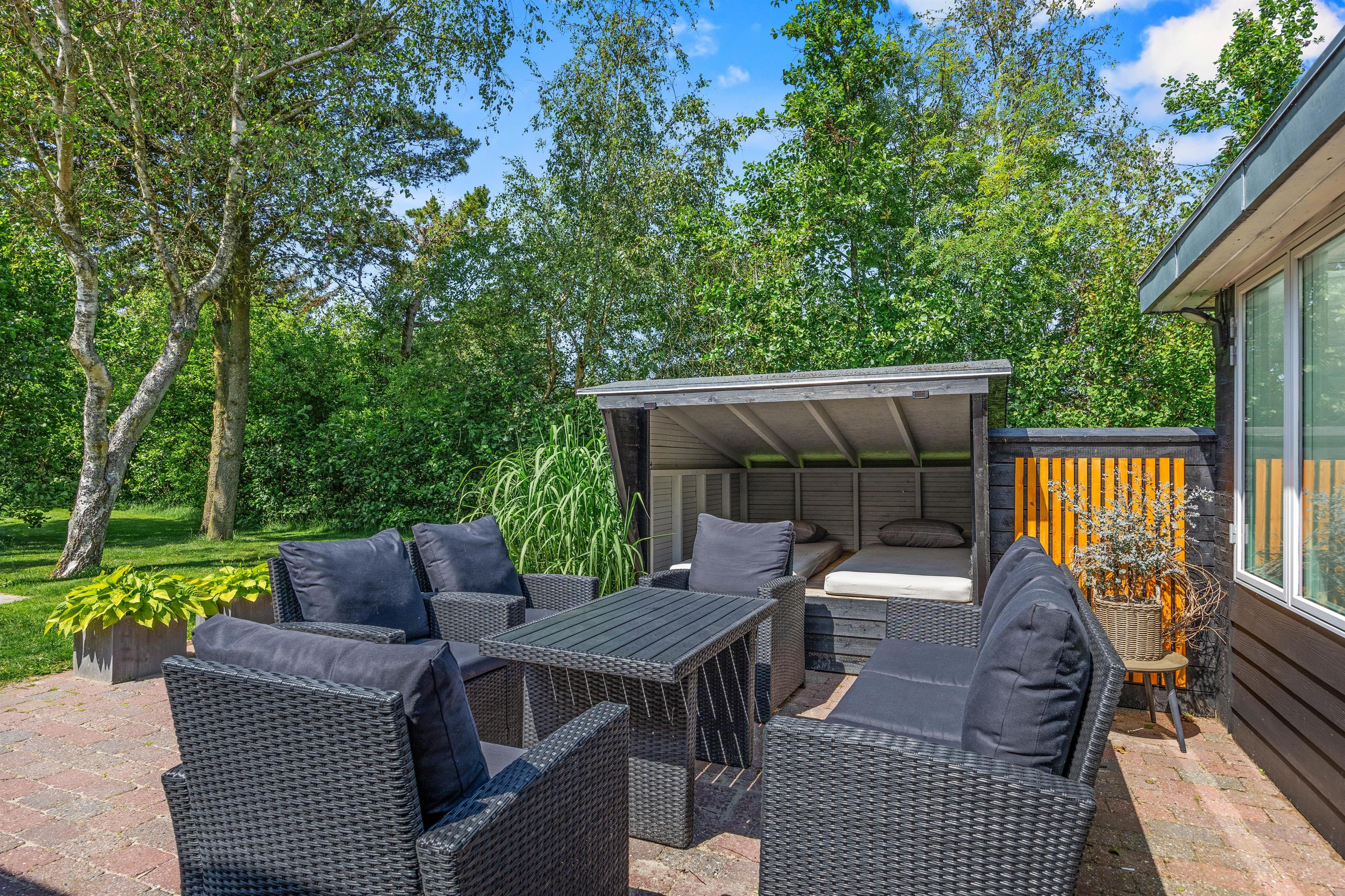 På terrasserne er der naturligvis komfortable havemøbler, hvor I kan slappe af og nyde et godt måltid fra grillen, ligesom liggestolene inviterer til afslapning og måske en lille middagslur. Feriehusets redskabsrum er åbent låsbart, så I kan roligt sætte jeres cykler ind her.