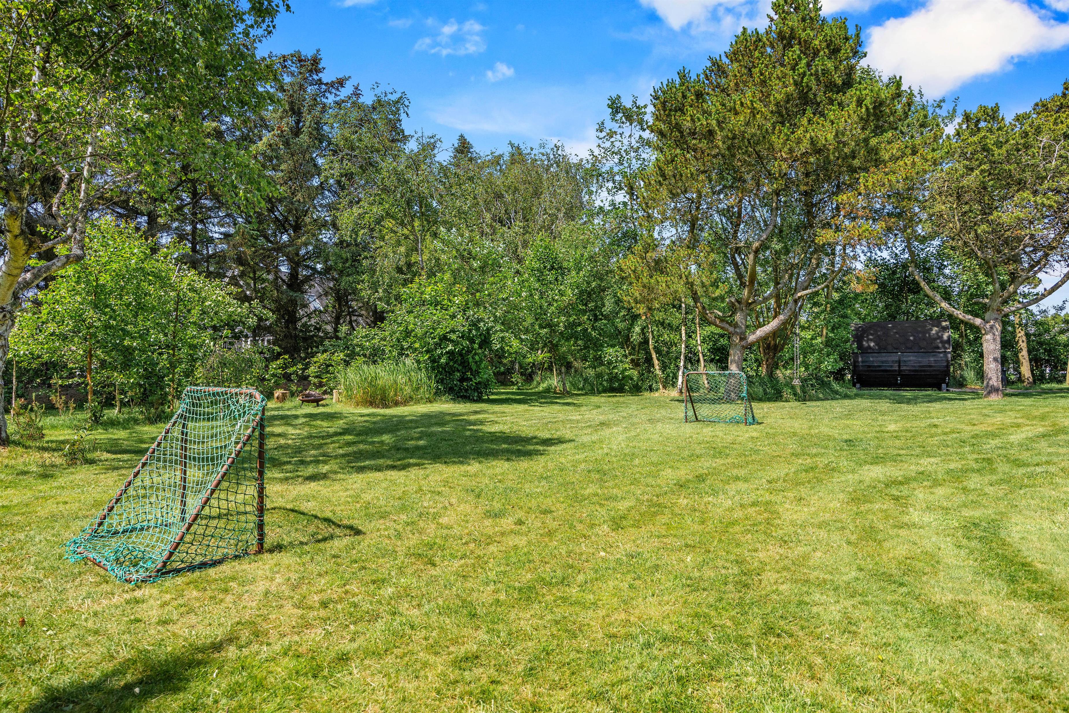 Feriehuset på Hans Thuesensvej 20 ligger på en stor 2214 m2 plænegrund, hvor I virkelig har mulighed for at nyde ferien i det fri. Her er noget for enhver, uanset om I er til solbadning, boldspil på plænen eller skønne grillaftner med sine nærmeste. Aktivitetsrummet gemmer på et utal af spil og legeredskaber, som I frit kan benytte, ligesom fodboldmålene står klar til en frisk dyst.