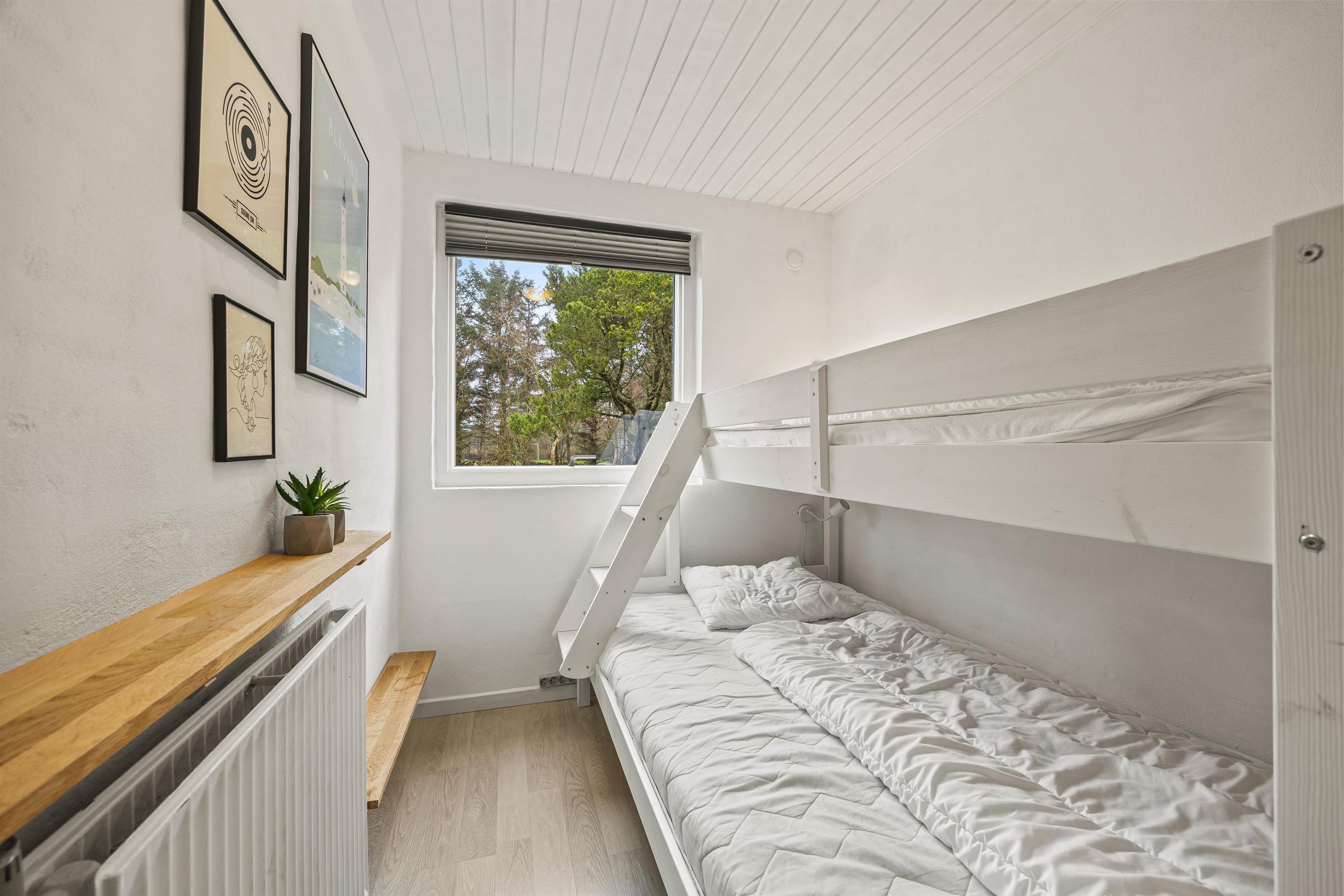 To af feriehusets fem soveværelser ligger i stueetagen sammen med et badeværelse med bruser og gulvvarme. Ovenpå findes de øvrige soveværelser og det andet badeværelse. Et værelse er med køjesenge med en bred underkøje, mens de andre fire har dobbeltsenge. To af soveværelserne har desuden eget TV. Fra førstesalens ene værelse kan man nyde altanen og udsigten udover den grønne have.