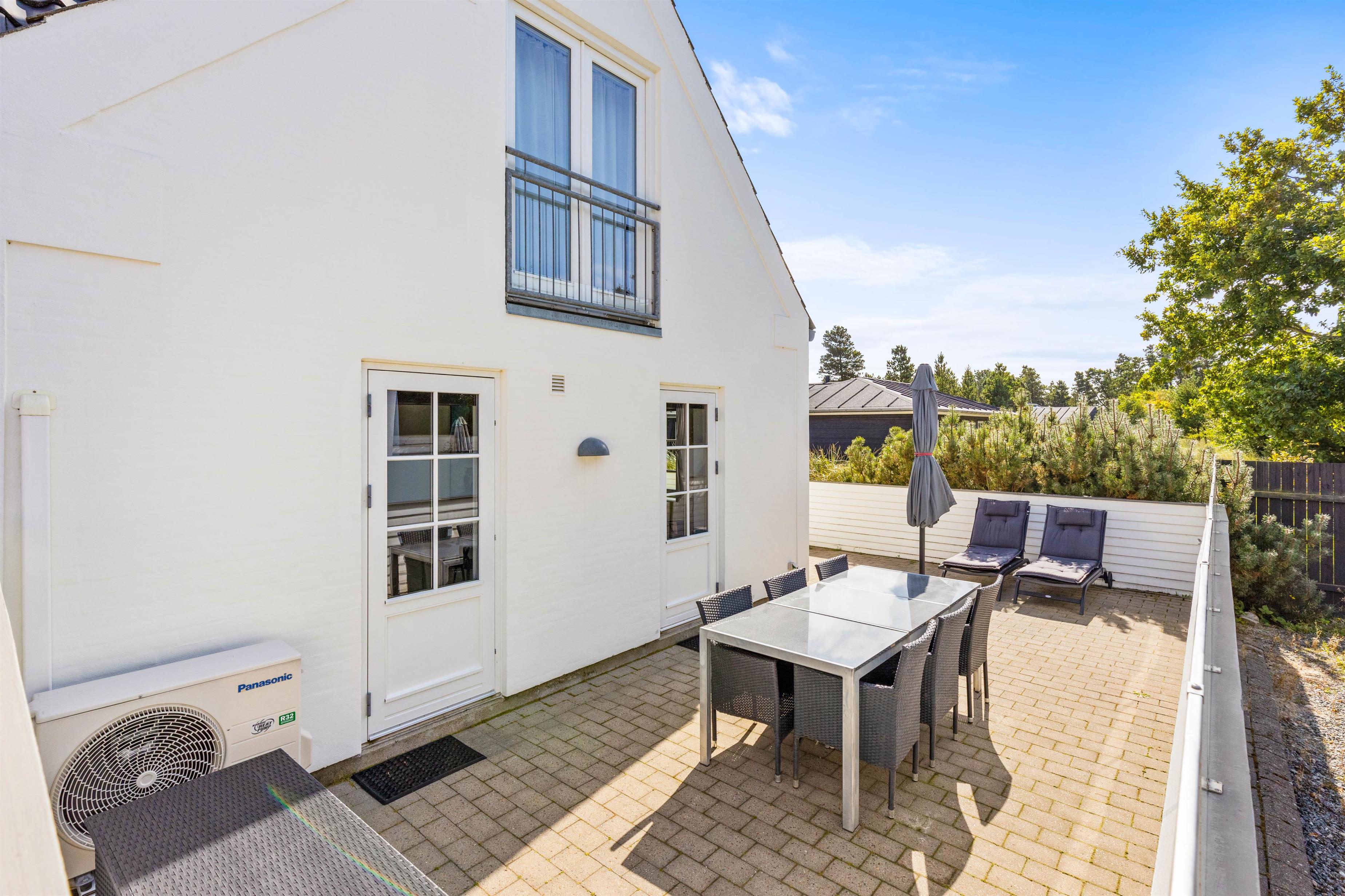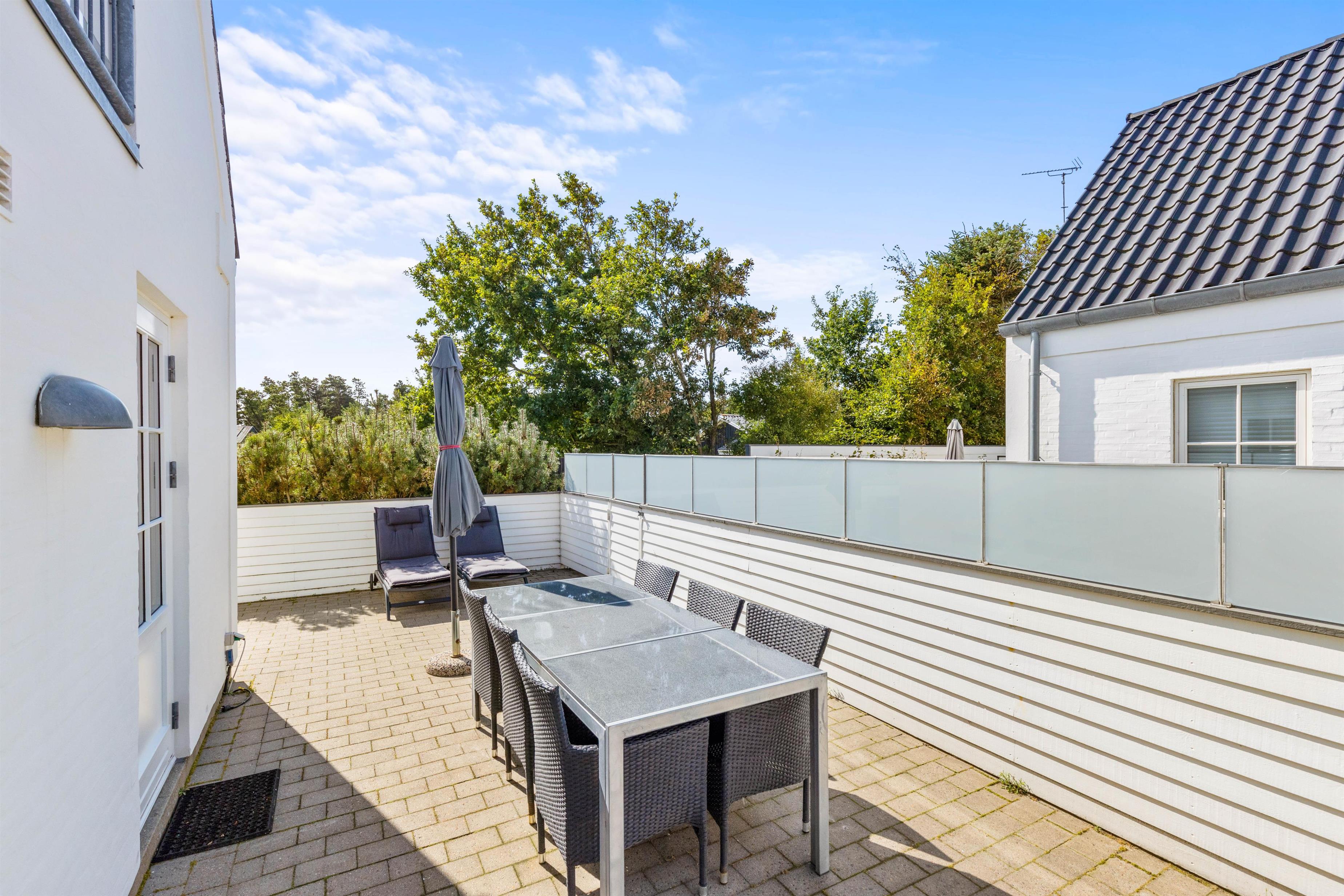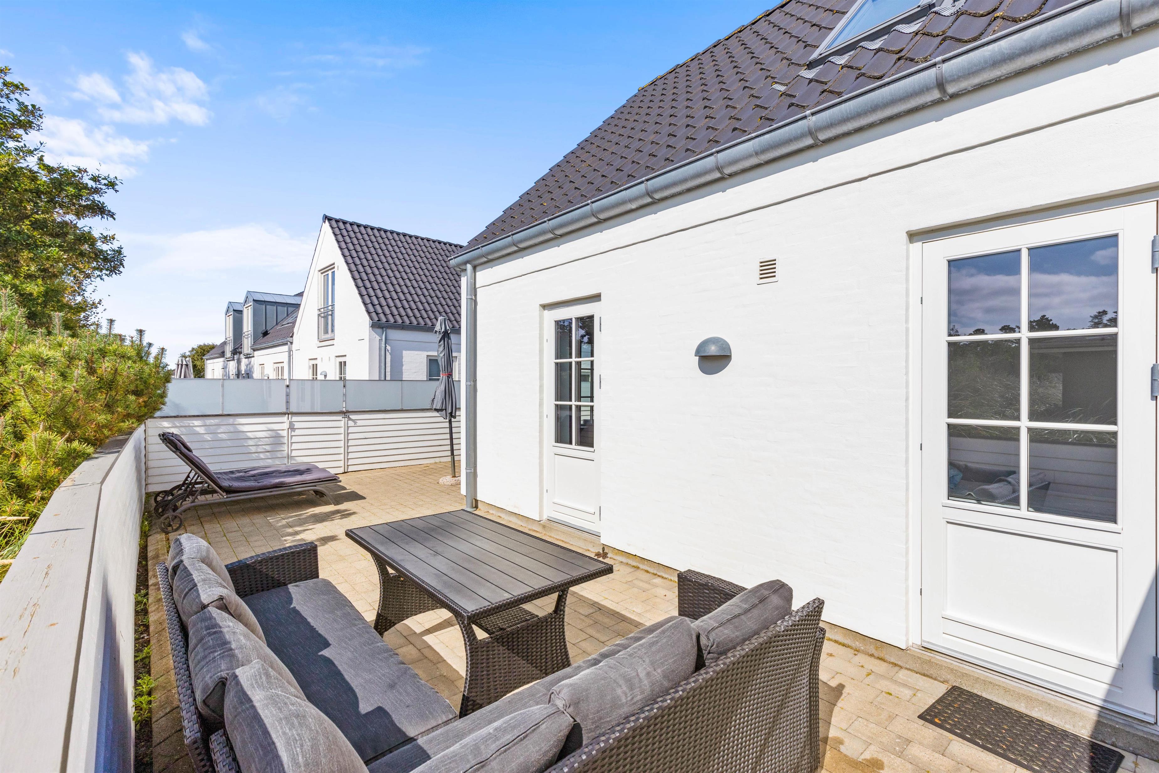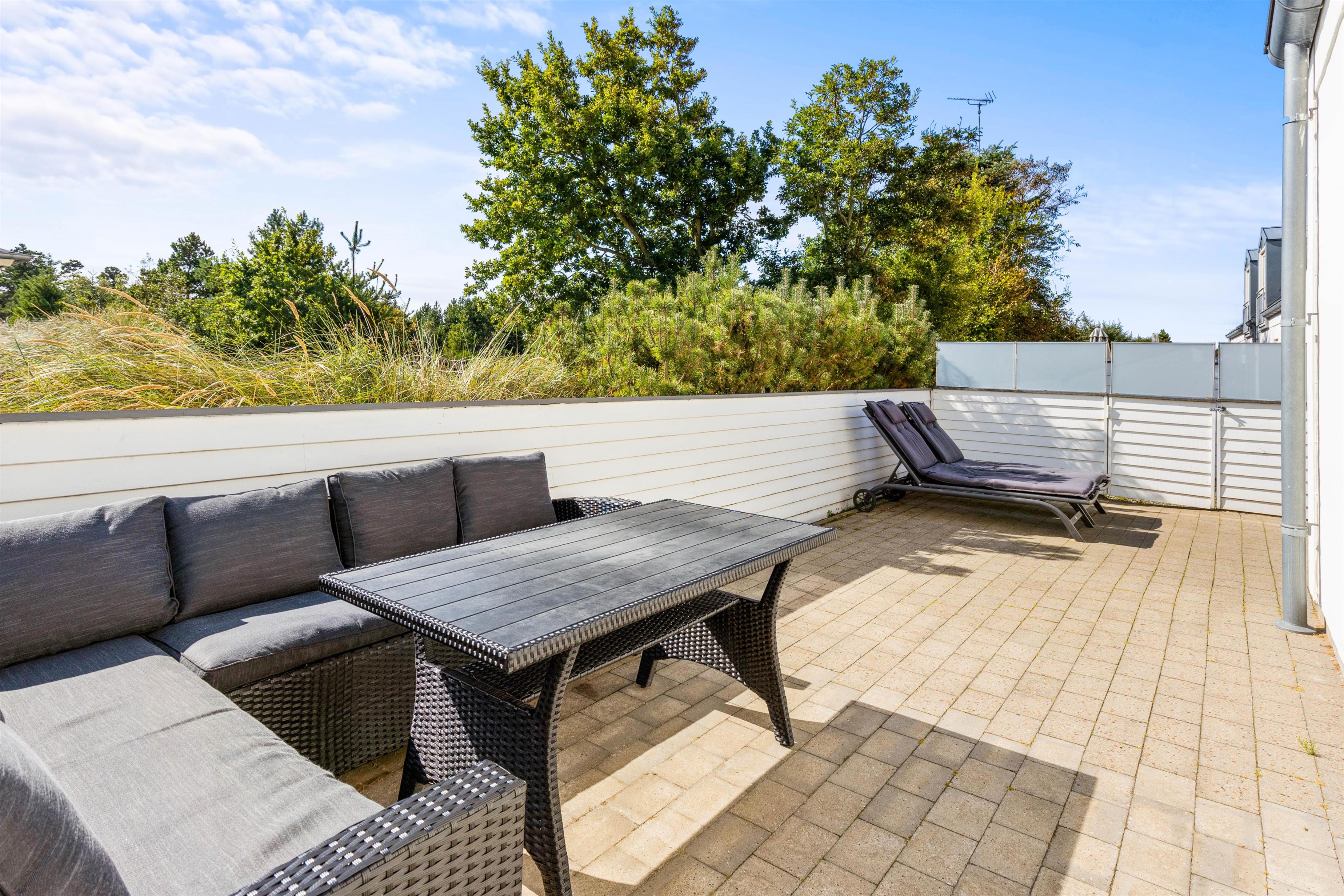 Til ferielejligheden har I en lukket terrasse, som I kan tilbringe de solrige feriedage på. Her kan I finde jer godt til rette i havemøbler og liggestole med snacks og kolde drikkevarer, mens solen skinner på jer – her har I endda sol hele dagen. På den lukkede terrasse kan I også have jeres hund med ude, uden at den stikker af på opdagelse.
