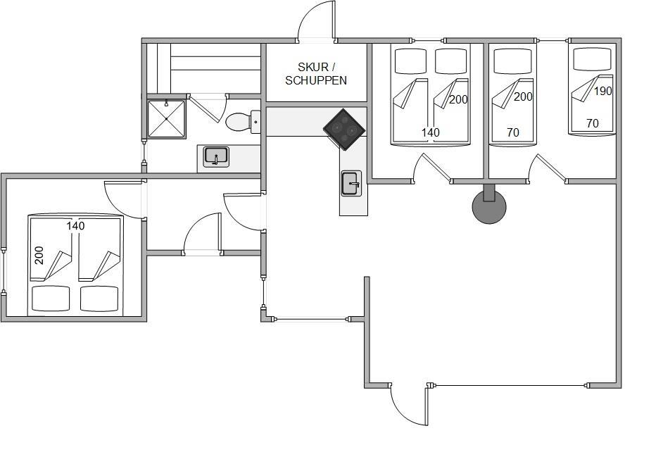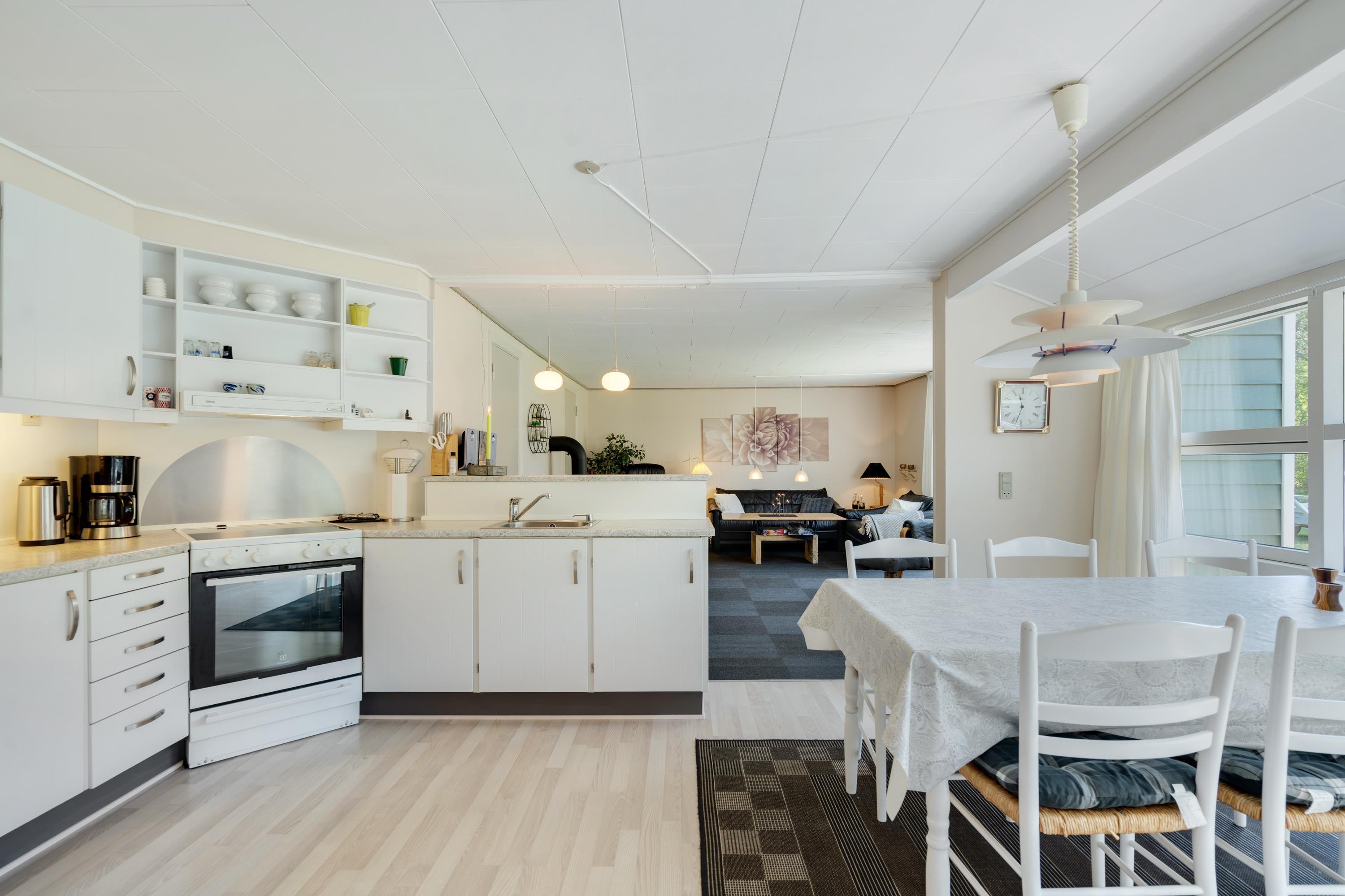 Feriehuset er med sine 3 soveværelser ideelt til en hyggelig familieferie og her rigeligt plads til 6 personer. Det dejlige sofahjørne indbyder til enten en hyggelig spilleaften i familien skød eller til ren afslapning foran brændeovn og TV. Fra det veludstyrede køkken er der udsyn til stuen, så man kan følge med i snakken, også imens der trylles i køkkenet.