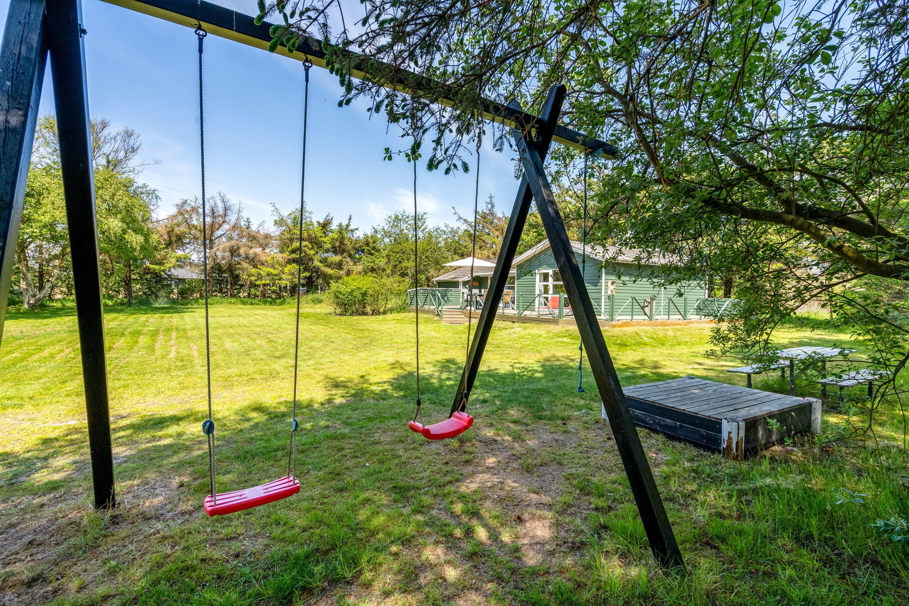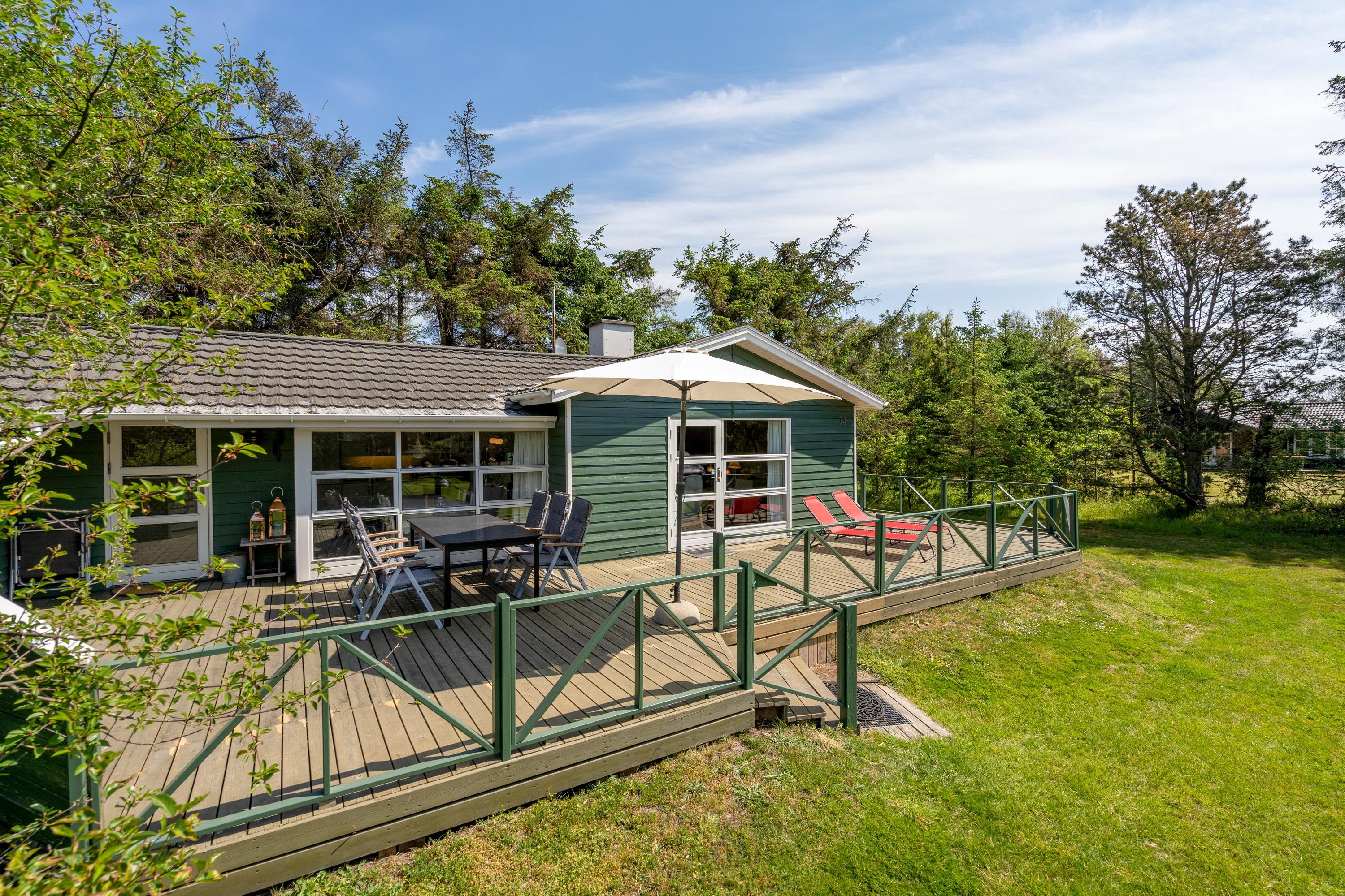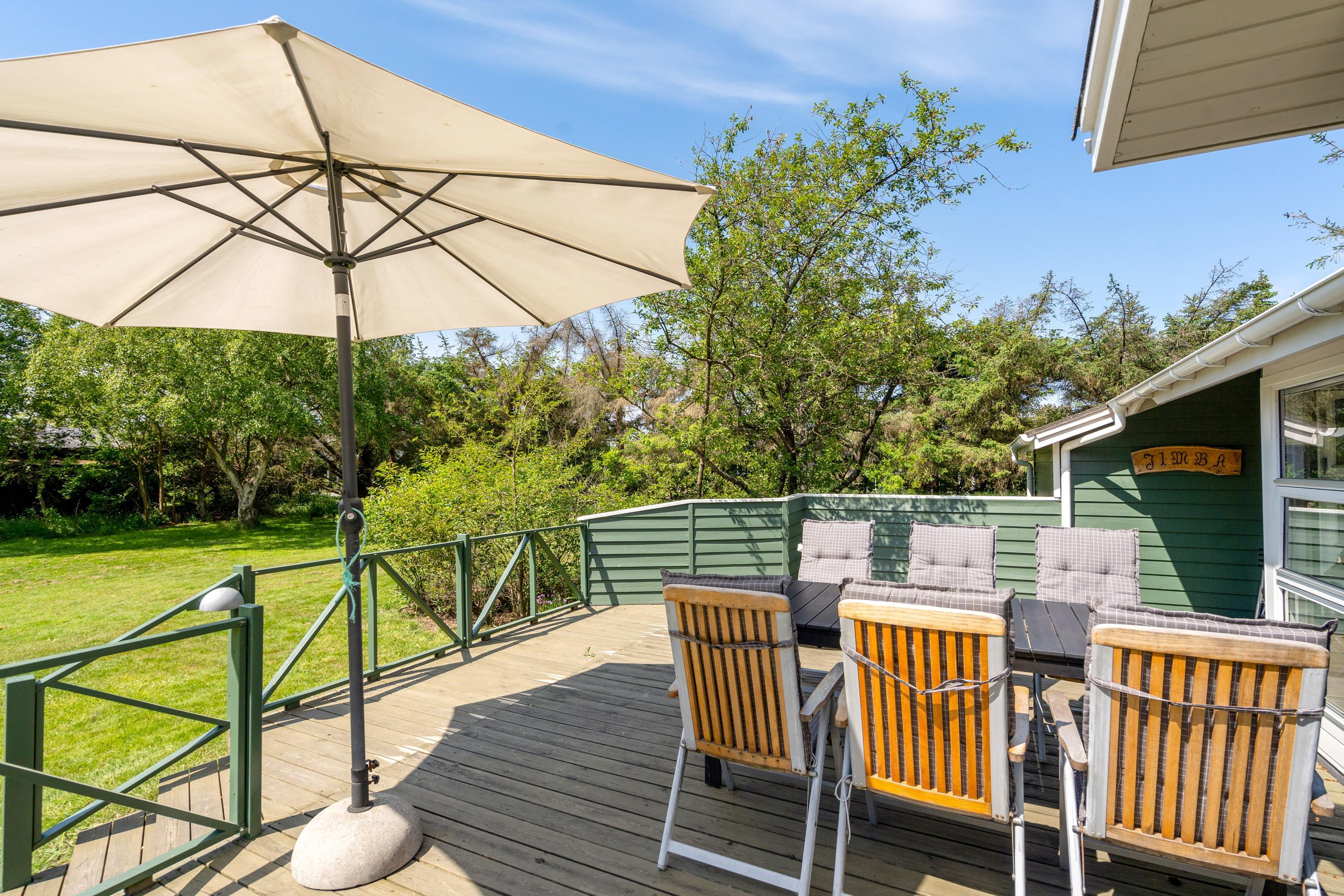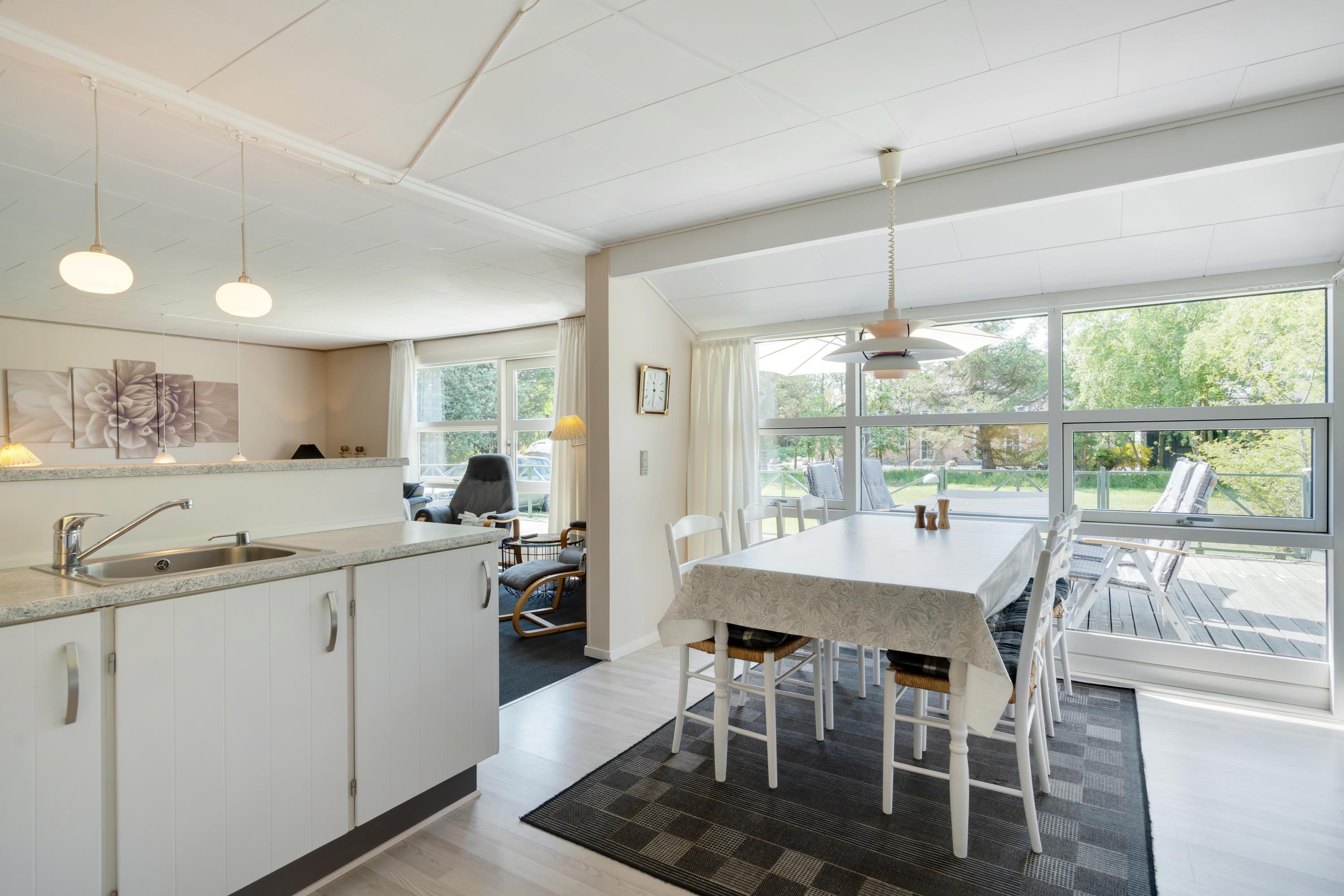 Sommerhuset har også et dejlig køkken/alrum med direkte udgang til den store træterrasse hvor der mulighed for, at I kan sidde uforstyrret og grille eller bare nyde solen i mens børnene leger i den store have hvor der er både gyngestativ og sandkasse.