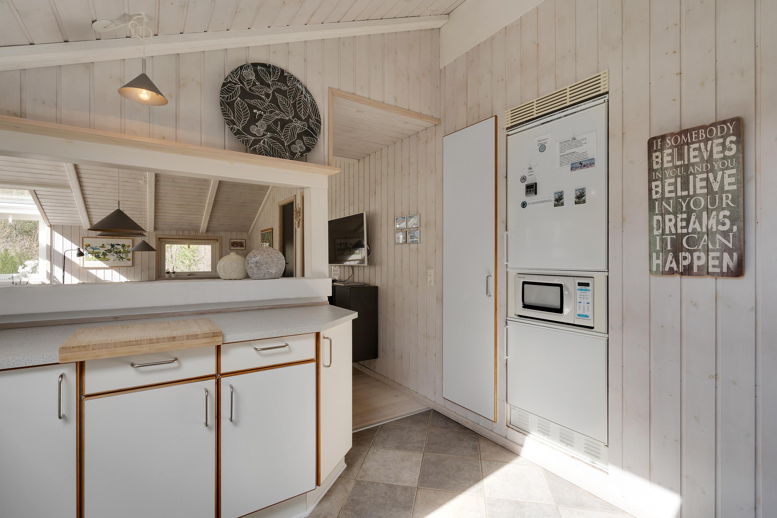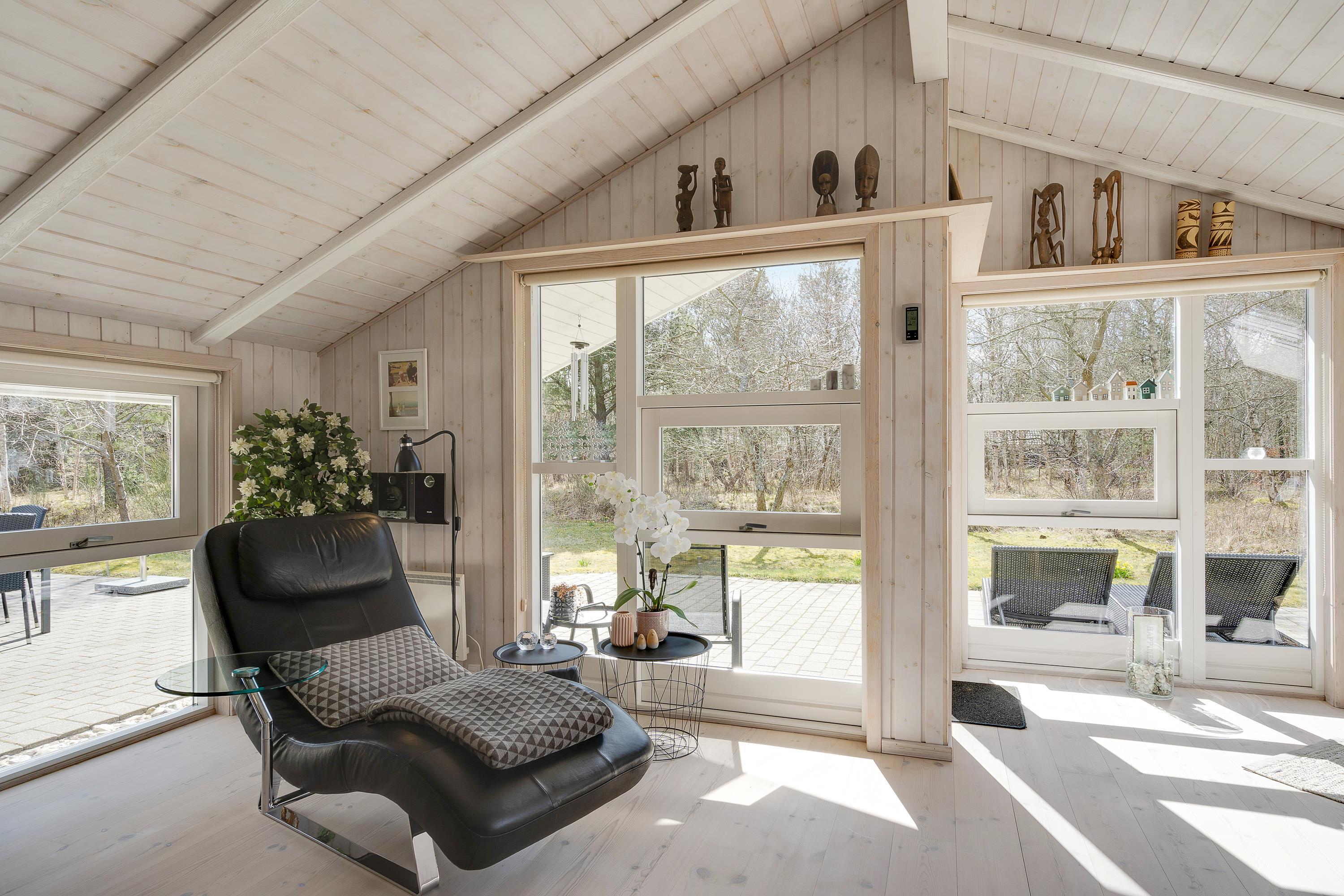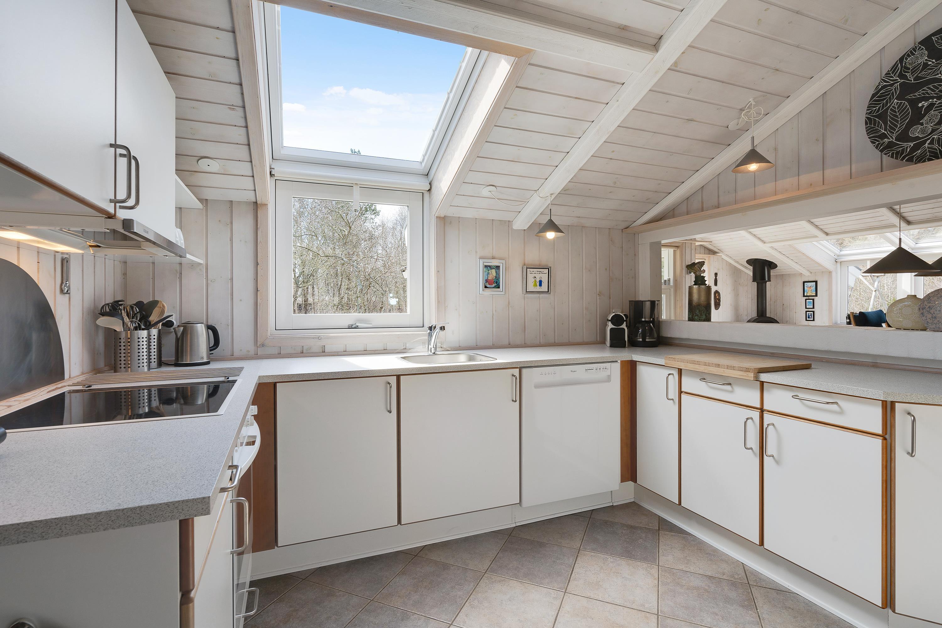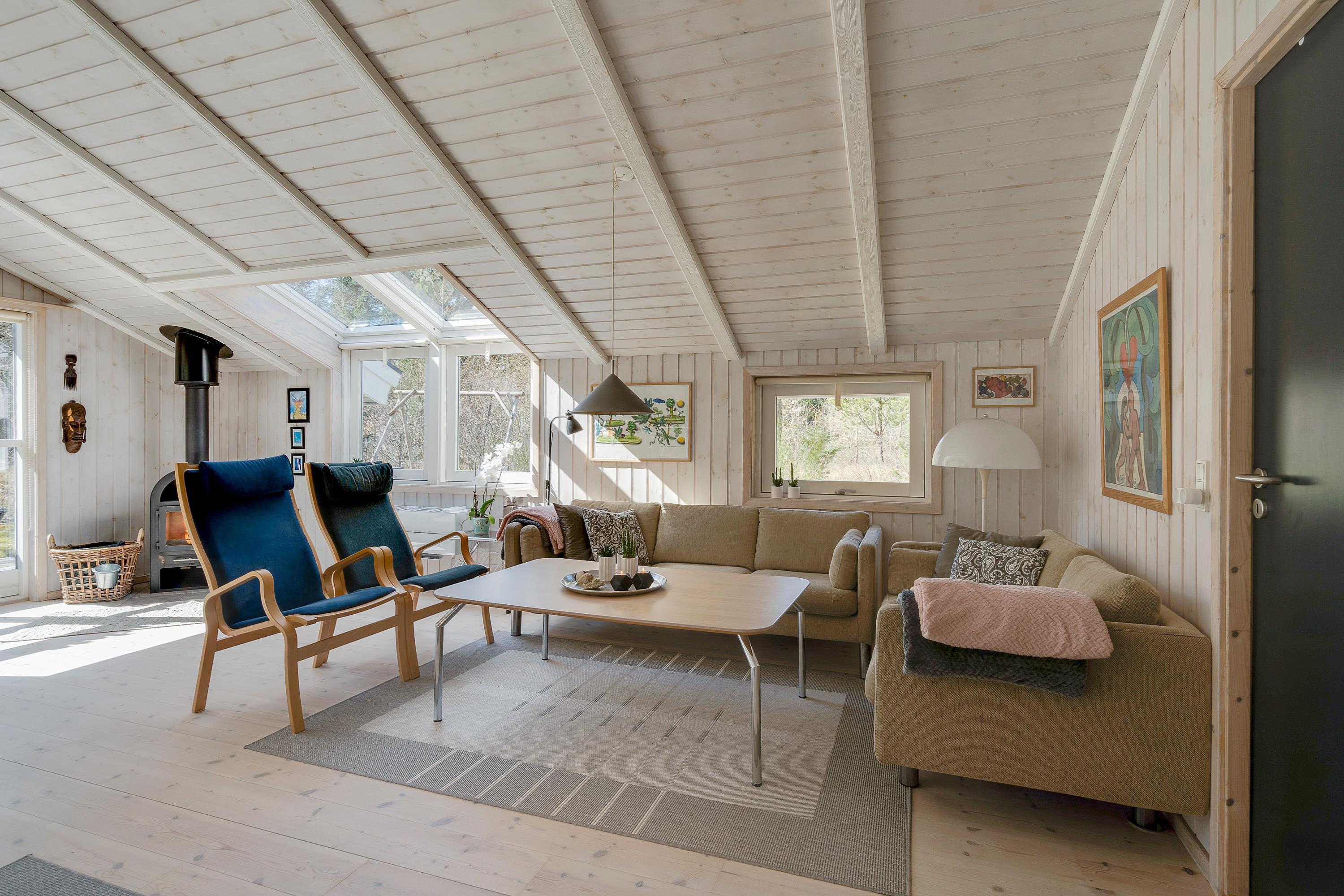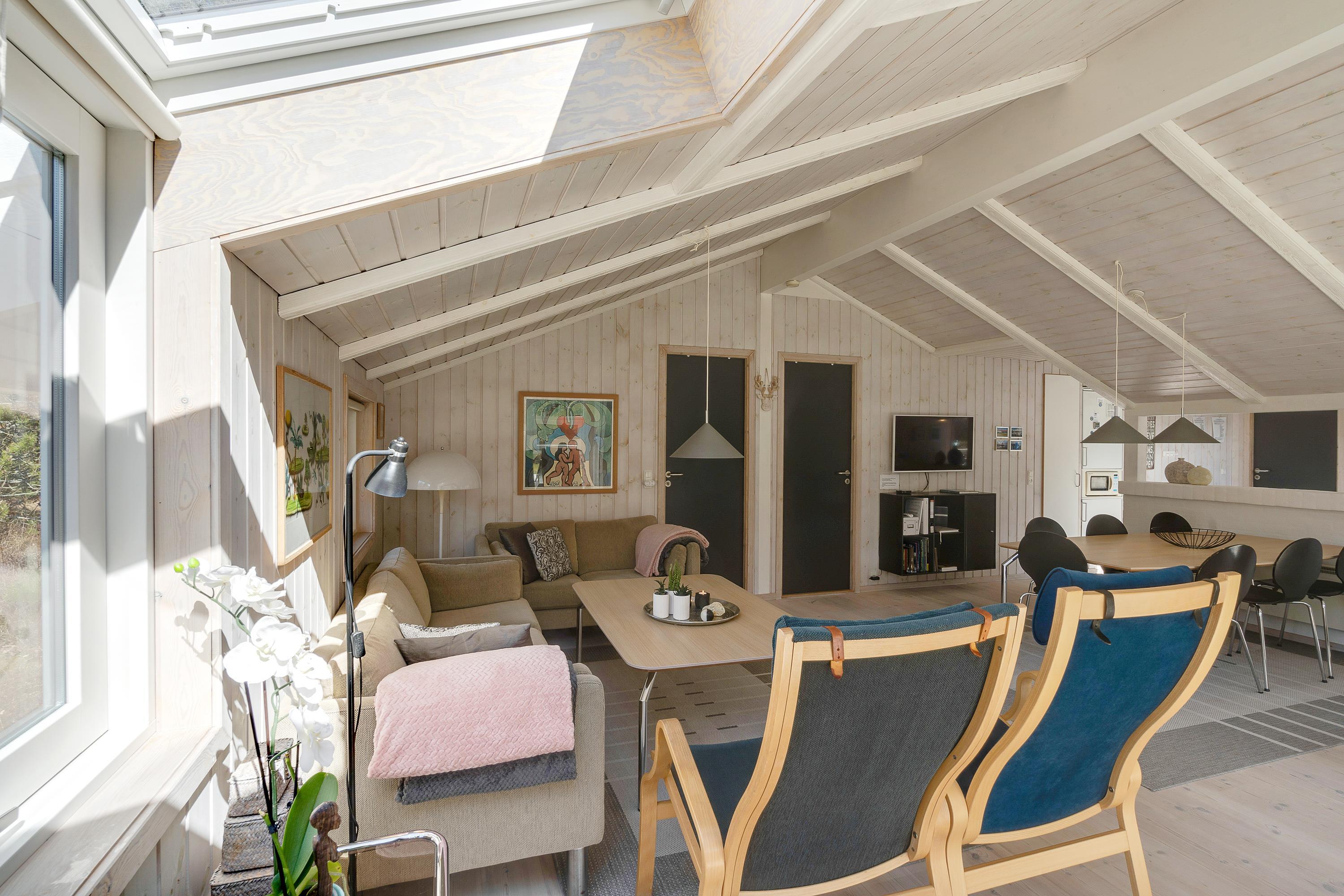 I dette skønne sommerhus kommer sommerhusatmosfæren rigtigt til sin ret med de skrånende lofter og behagelige møbler. Hjertet af huset er den indbydende opholds- og spisestue, hvor I kan nyde de fleste af døgnets timer sammen - hvad enten det er med lækre måltider, sjove brætspil eller en god film i skæret af den knitrende brændeovn. Mangler I en bog til ferien, findes der et lille 'bibliotek' med danske, tyske og engelske bøger.