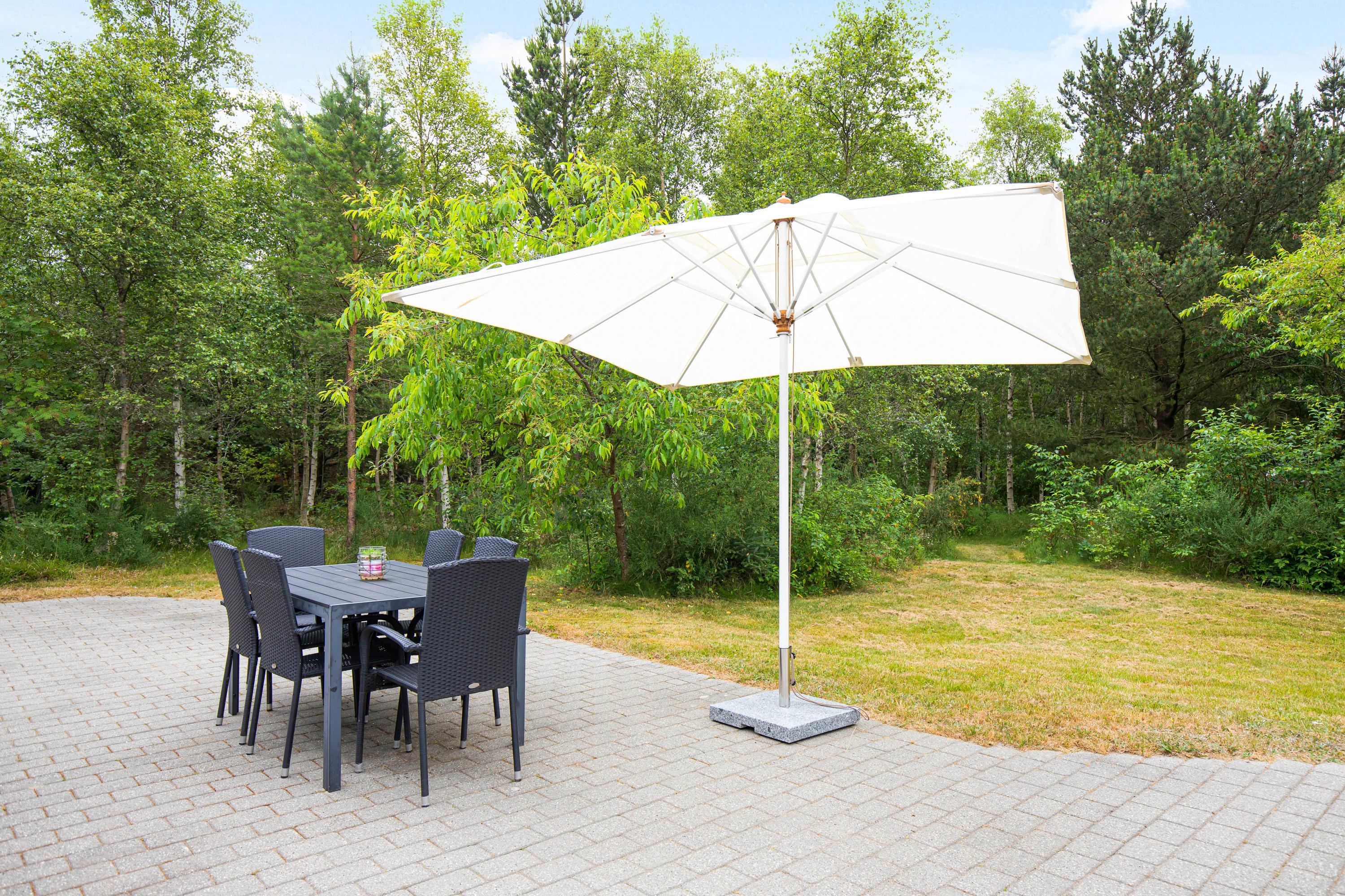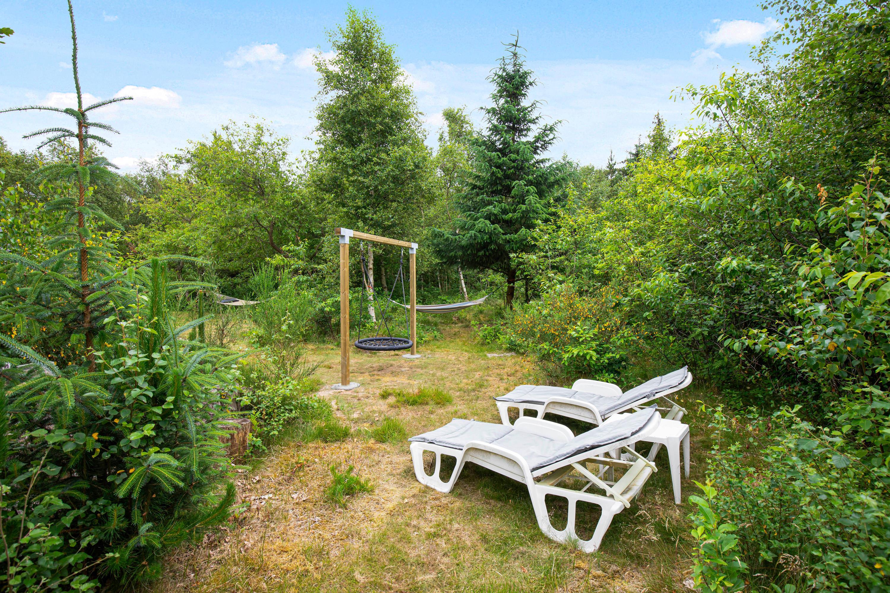 Helt særligt ved dette feriehus er bestemt placeringen omgivet af træer og fuglesang midt i naturen. Her får I både en åben og overdækket terrasse, hvor hele familien uforstyrret kan nyde morgenkaffen eller yndlingsbogen. Terrassen er udstyret med en grill, så aftensmaden kan tilberedes og nydes i den friske luft. I kan her gøre brug af fem solvogne, en sansegynge og to hængekøjer i træernes skygge. I den store grønne have er der både gynge og sandkasse, så børnene kan boltre sig i den friske luft og få brugt en masse energi. Fra 1. april til 31. oktober står en udebruser med koldt vand til rådighed.
