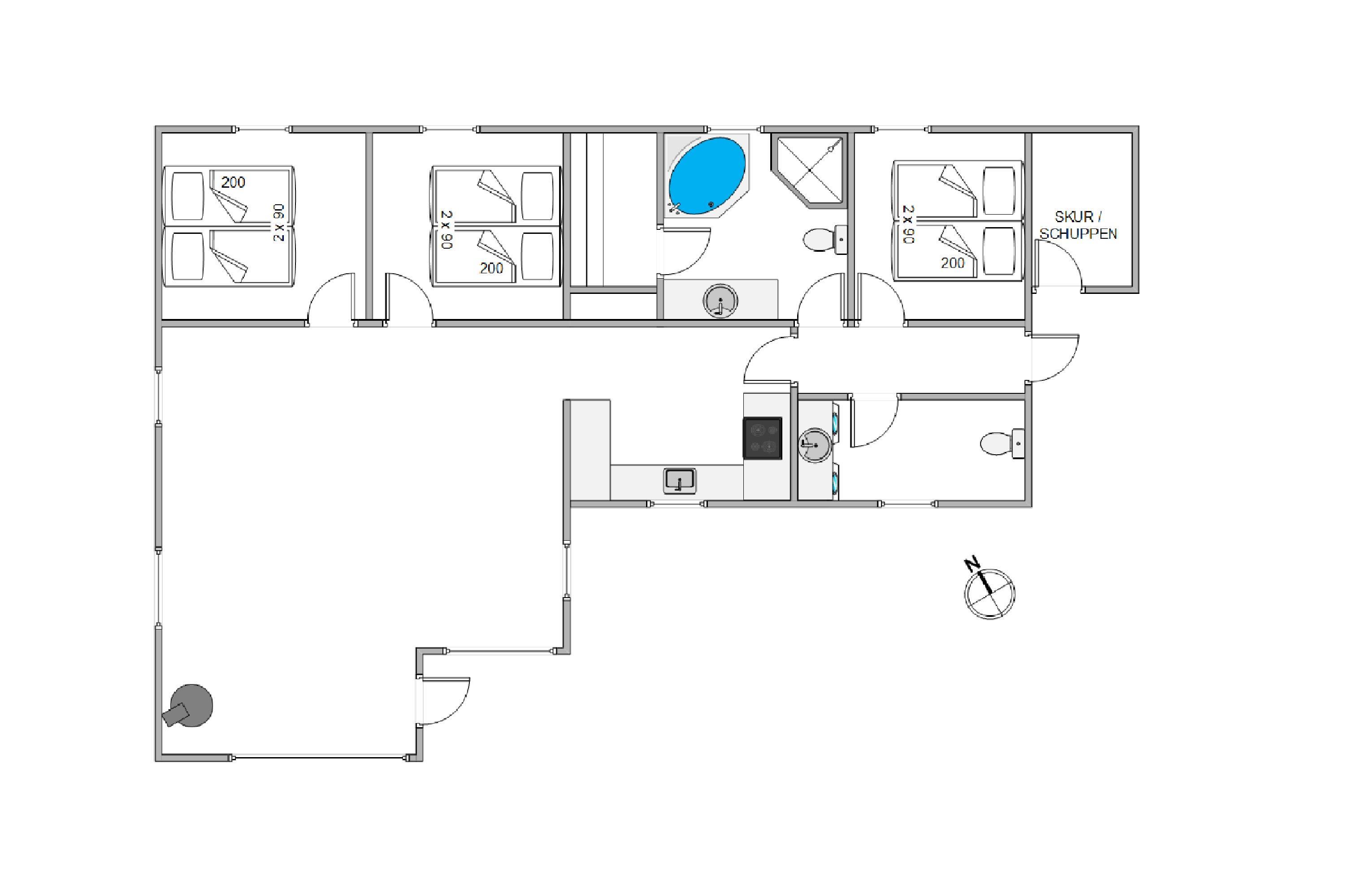 I sommerhusets store badeværelse venter det sprudlende spabad og den varme sauna på jer. Her kan I tilbringe mange hyggelige timer sammen. Det ekstra gæstetoilet sørger også for at lette travlheden på badeværelset om morgenen. I det ene badeværelse er der tillige pusleplads til de mindste.