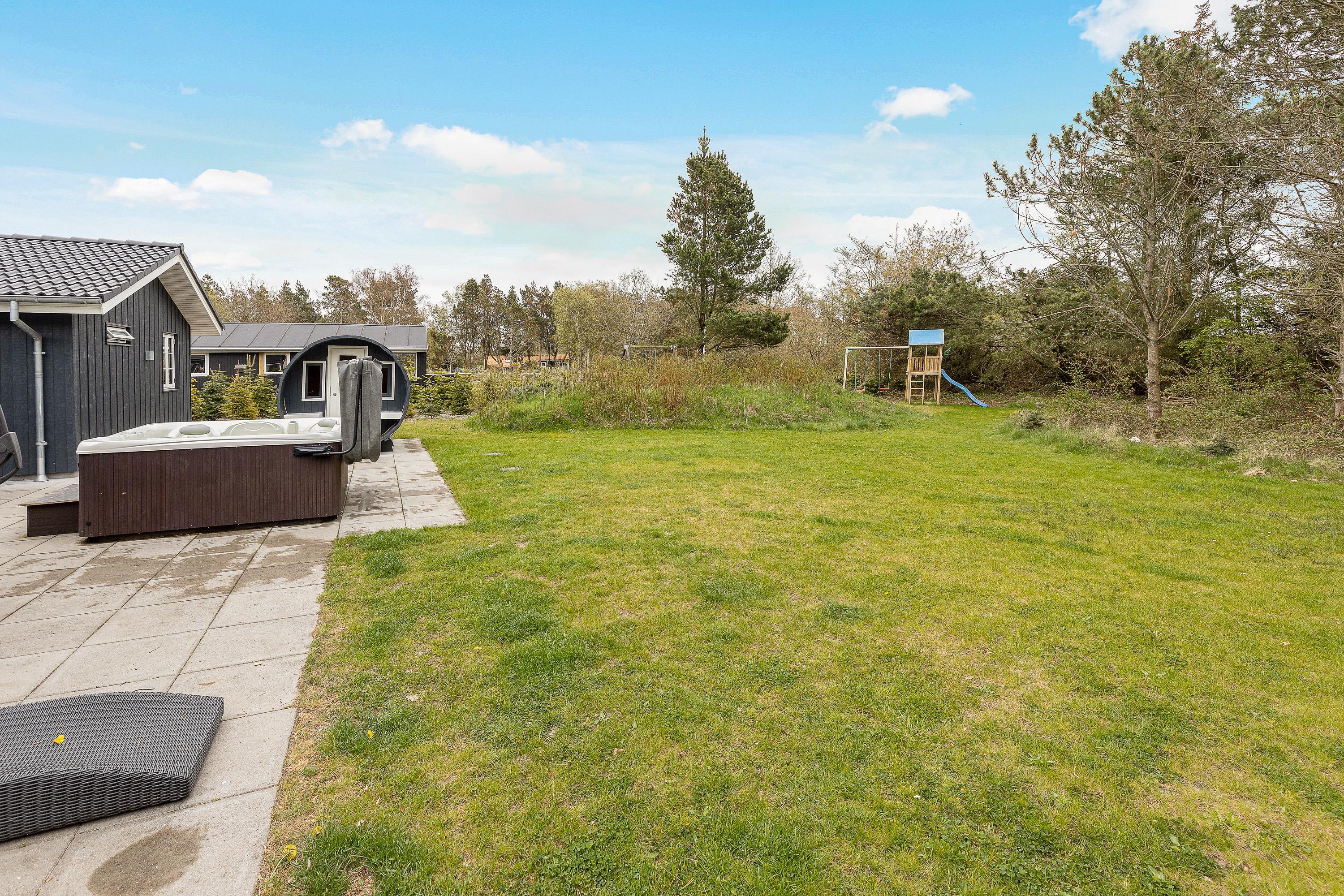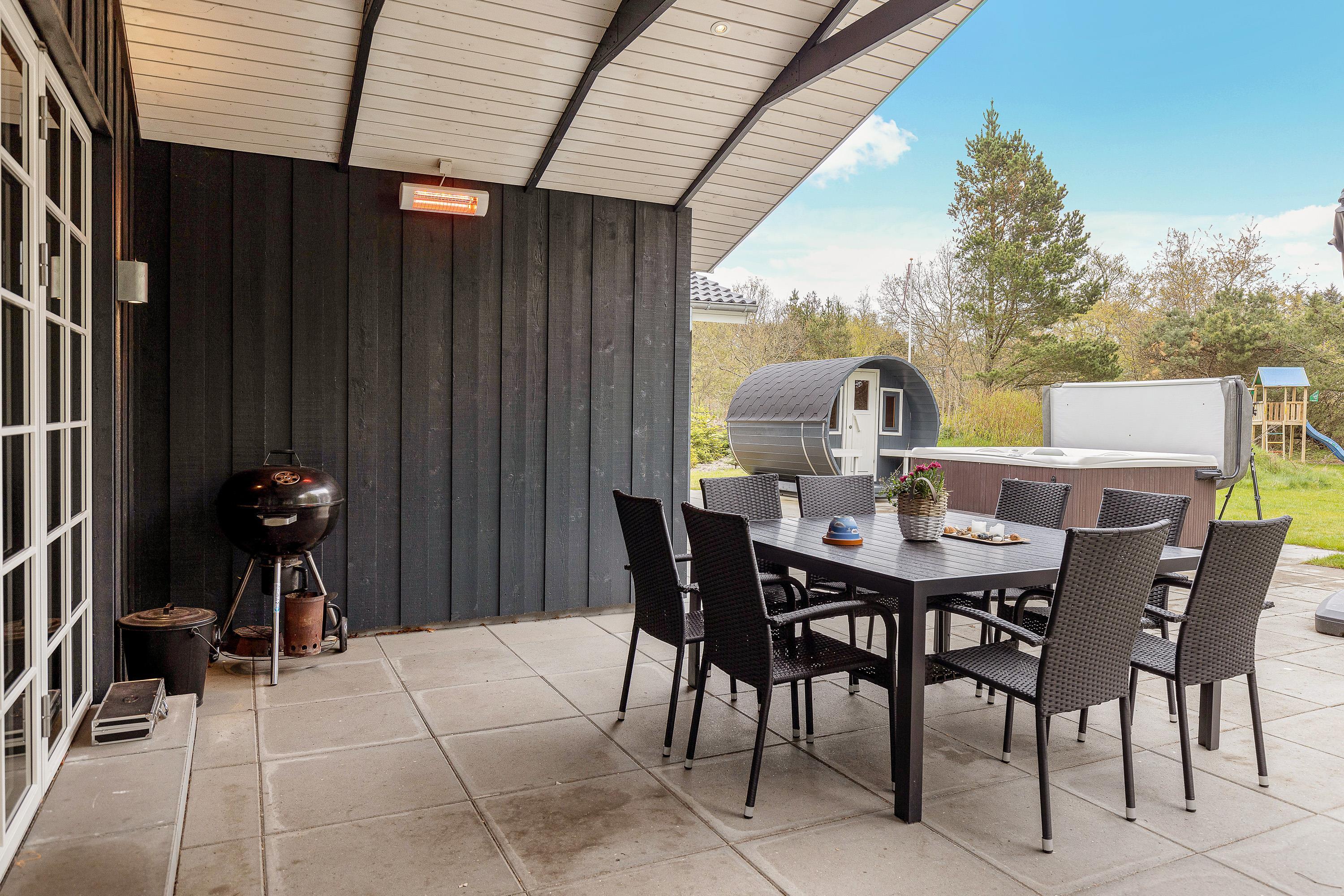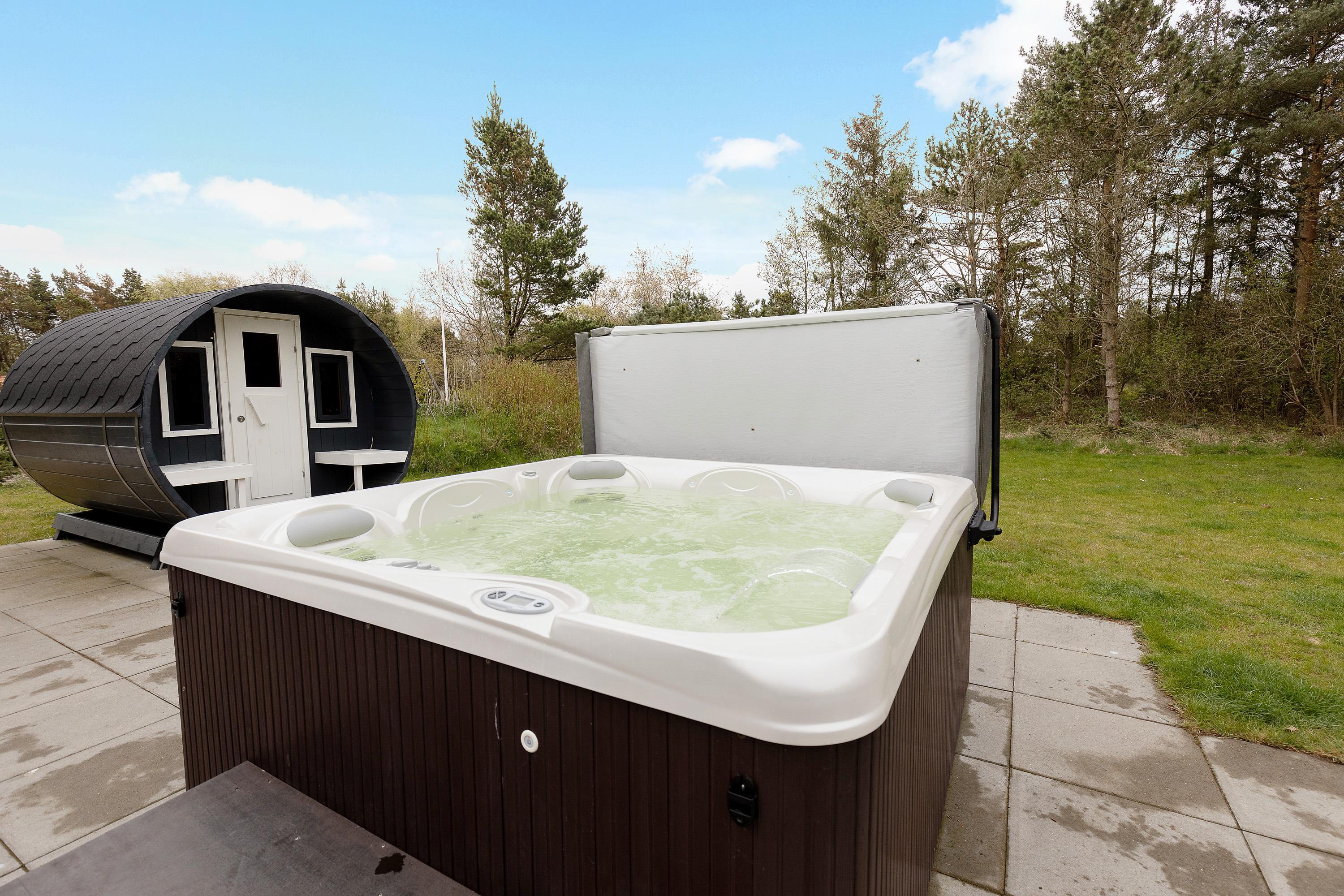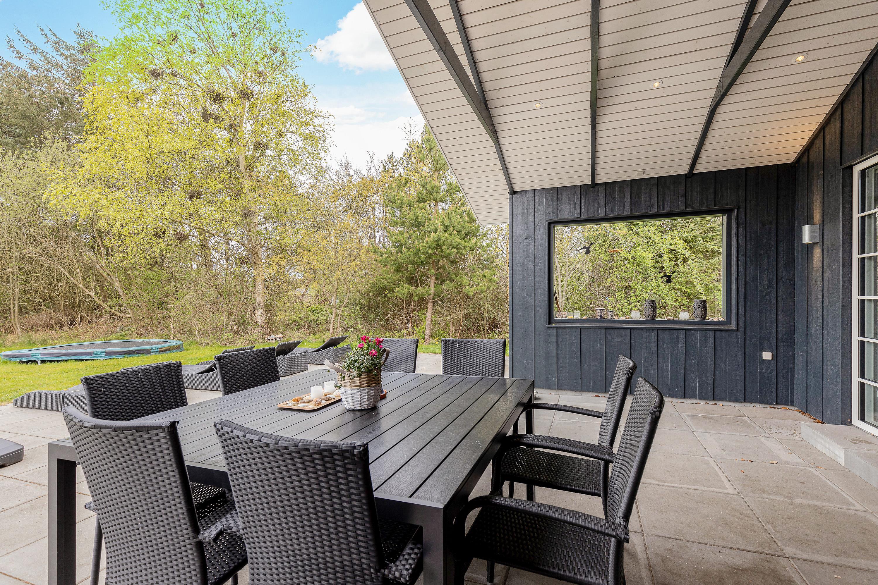 Den store, delvist overdækkede og terrasse gemmer på endnu flere feriehighlights. Ud over at være udstyret med masser af gode havemøbler, liggestole og en grill, står her også et stort, udendørs spabad, hvor I kan nyde nogle skønne wellness-stunder under åben himmel. I forlængelse af terrassen finder I desuden den lækre saunahytte, legeredskaber til børnene og trampolin.