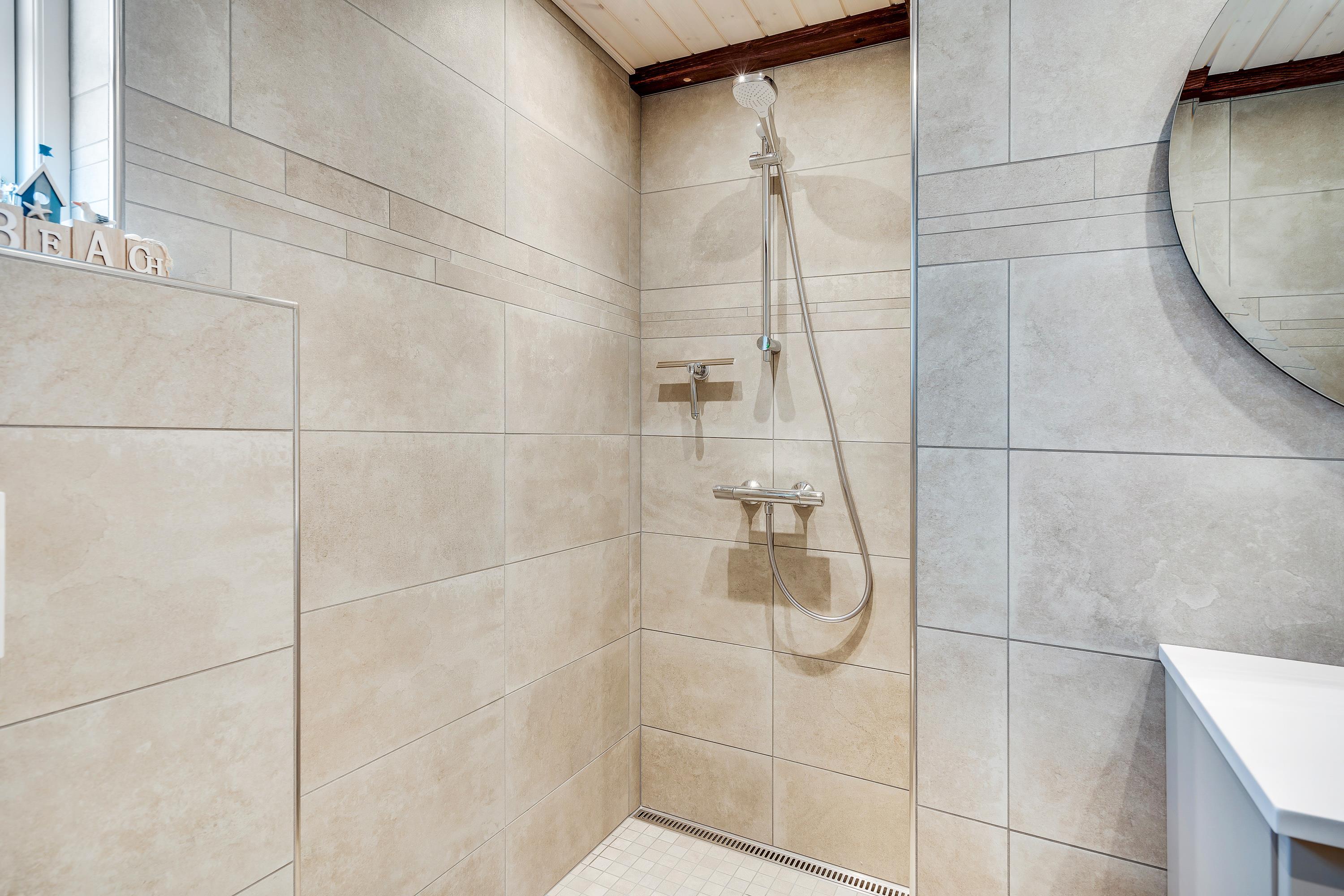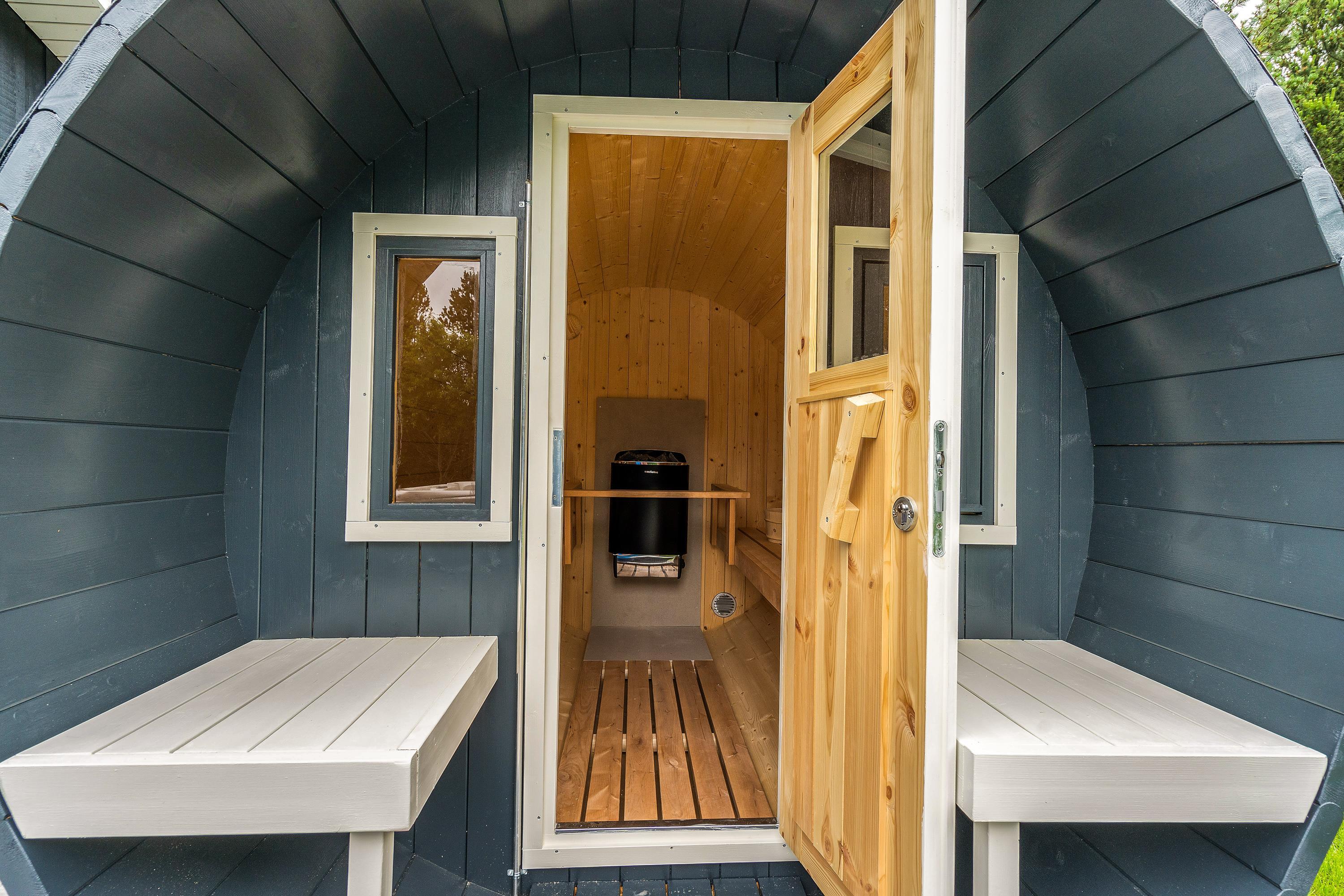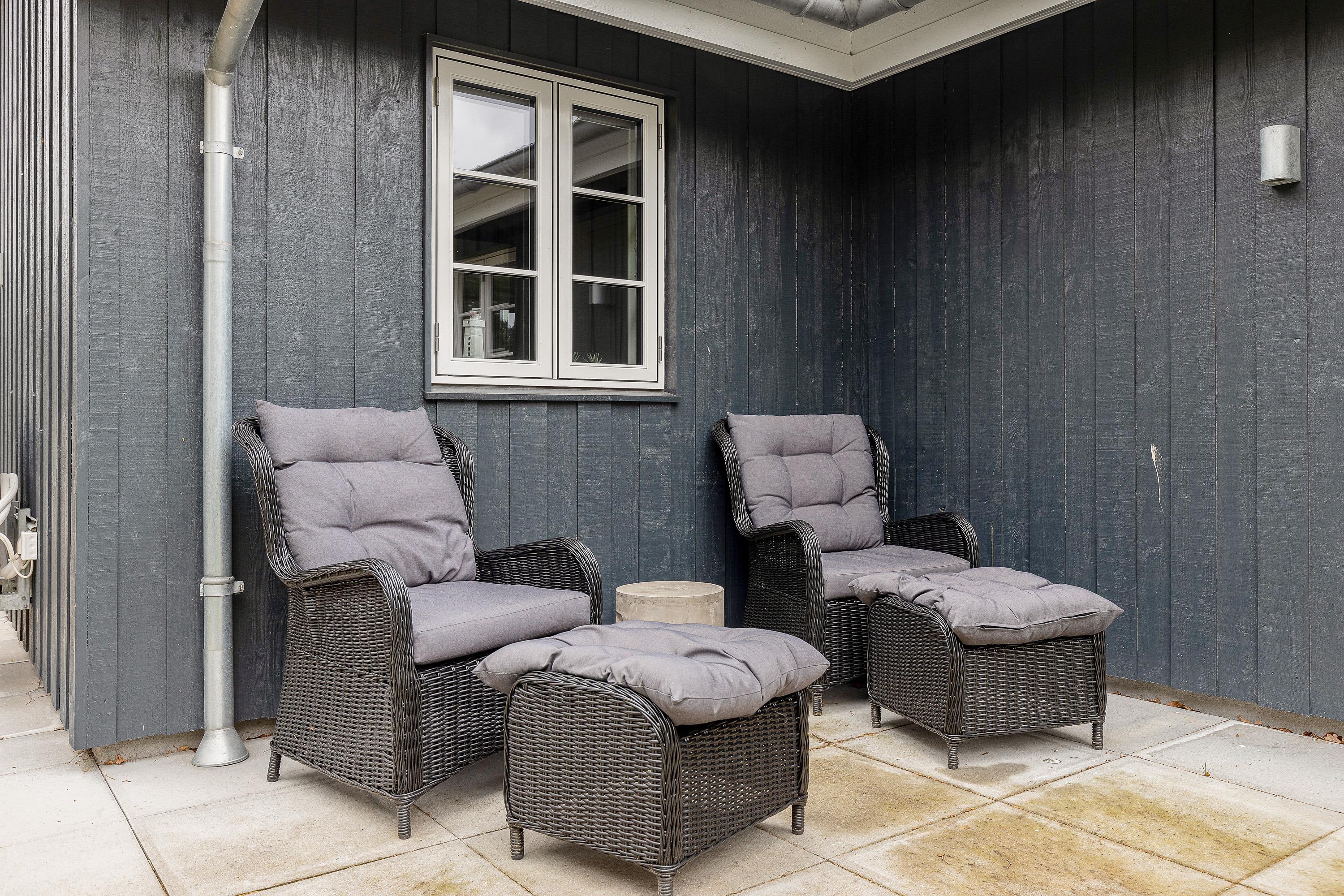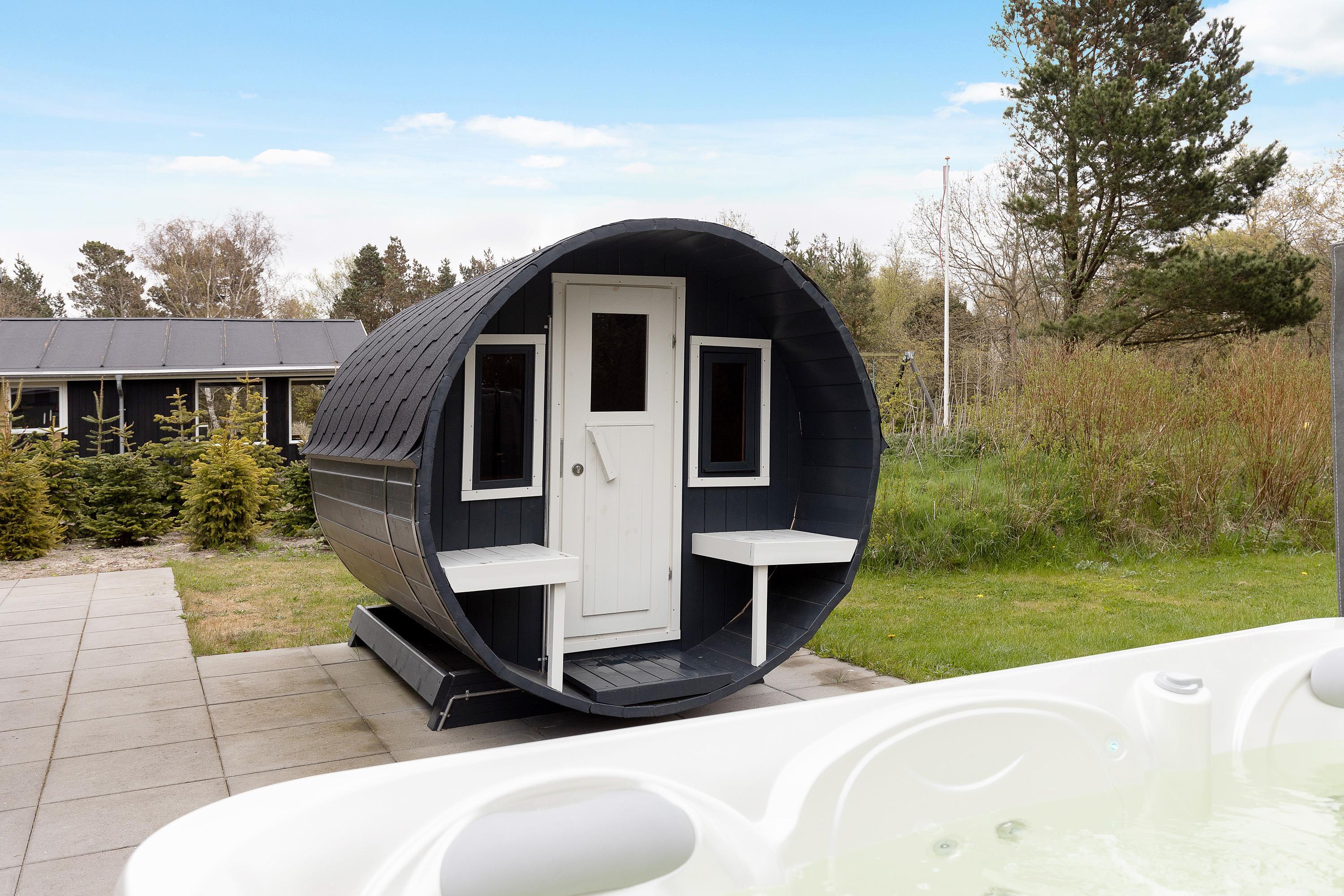 Den store, delvist overdækkede og terrasse gemmer på endnu flere feriehighlights. Ud over at være udstyret med masser af gode havemøbler, liggestole og en grill, står her også et stort, udendørs spabad, hvor I kan nyde nogle skønne wellness-stunder under åben himmel. I forlængelse af terrassen finder I desuden den lækre saunahytte, legeredskaber til børnene og trampolin.