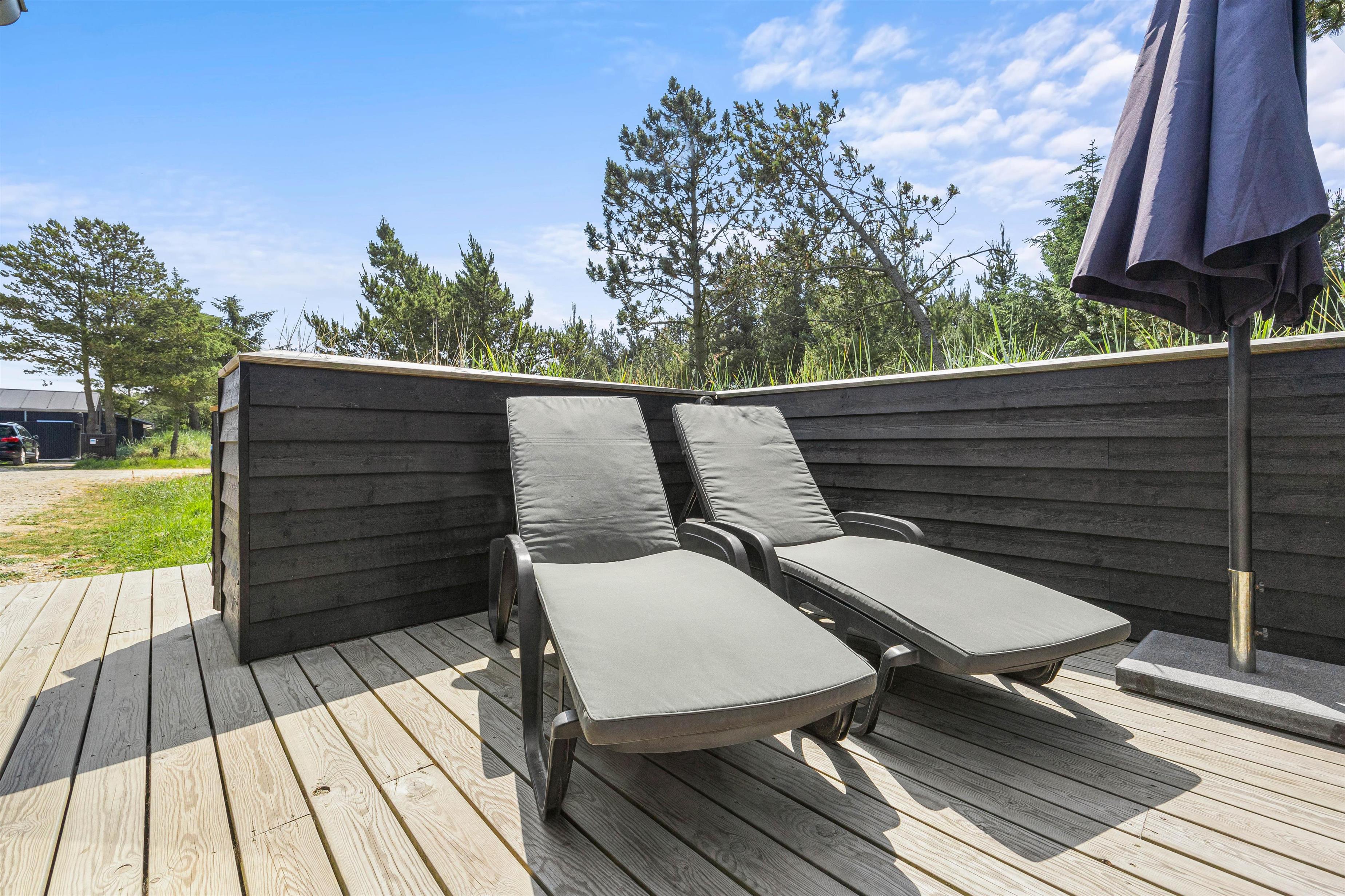 Der skal selvfølgelige ikke mangle noget, når I vil rykke ferien udendørs og nyde det gode vejr. Der findes også en stor åben terrasse mod syd med liggestole, havemøbler og en grill klar til jer, så I kan få mest muligt ud af de solrige feriedage – helt fra morgenstunden og til sent ud på aftenen.
