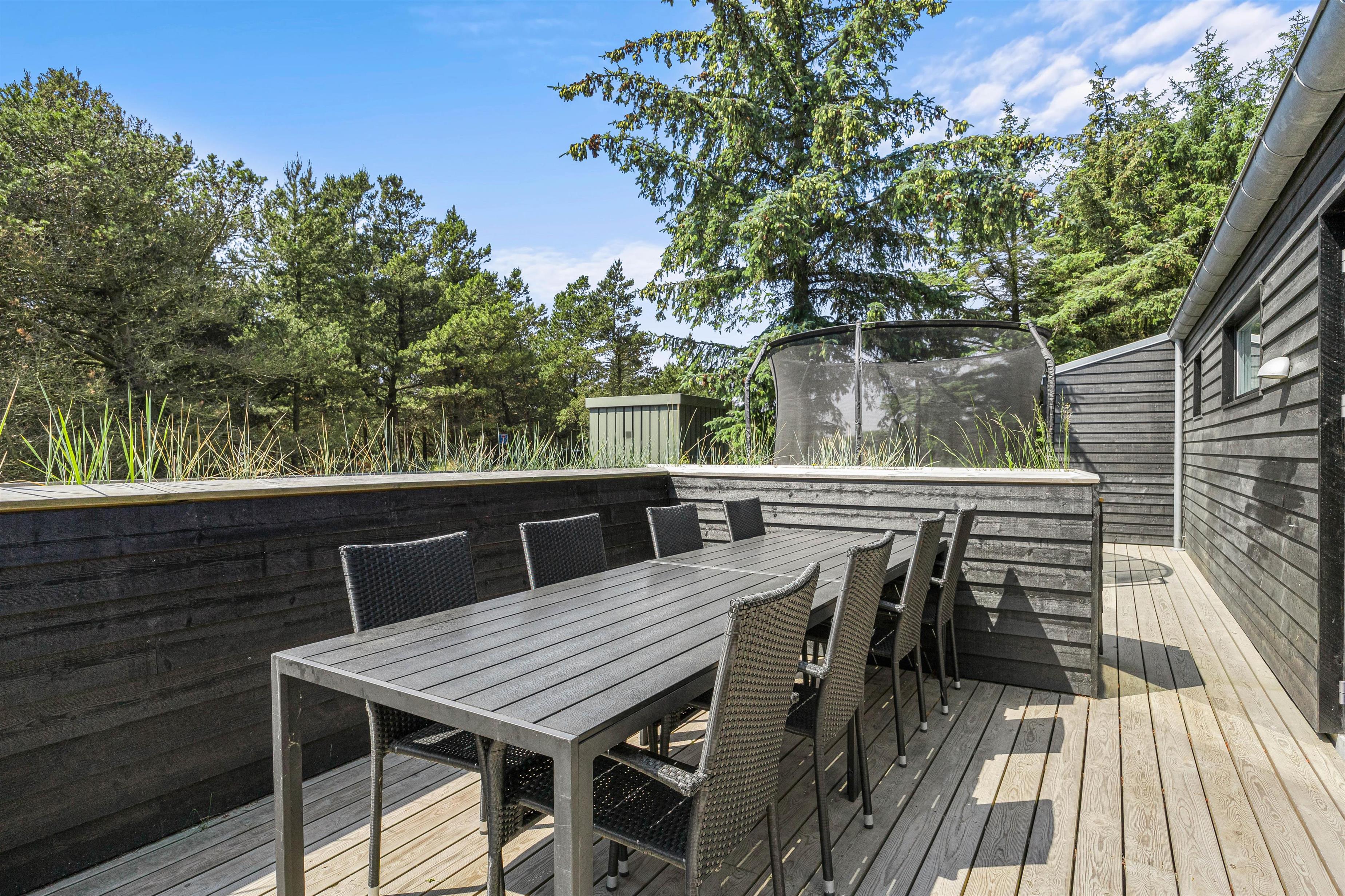 Sommerhuset har også et helt fantastisk udeområde. Her er en stor, overdækket terrasse, der er aflukket med plankeværk – helt perfekt, hvis der er børn og hunde med på ferien. Til børnene er der også en sandkasse og en trampolin i haven, som de kan lege i og have det sjovt.