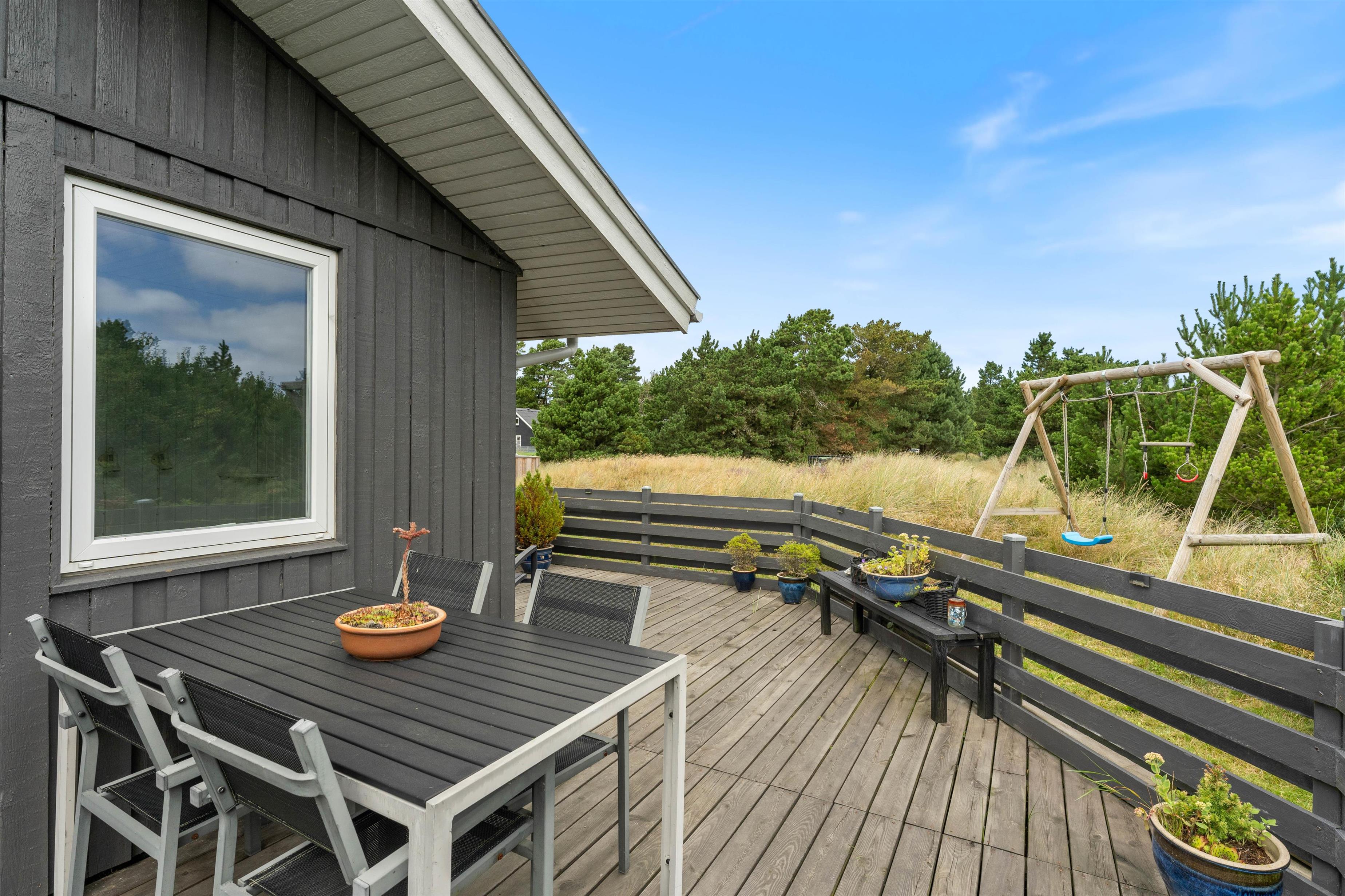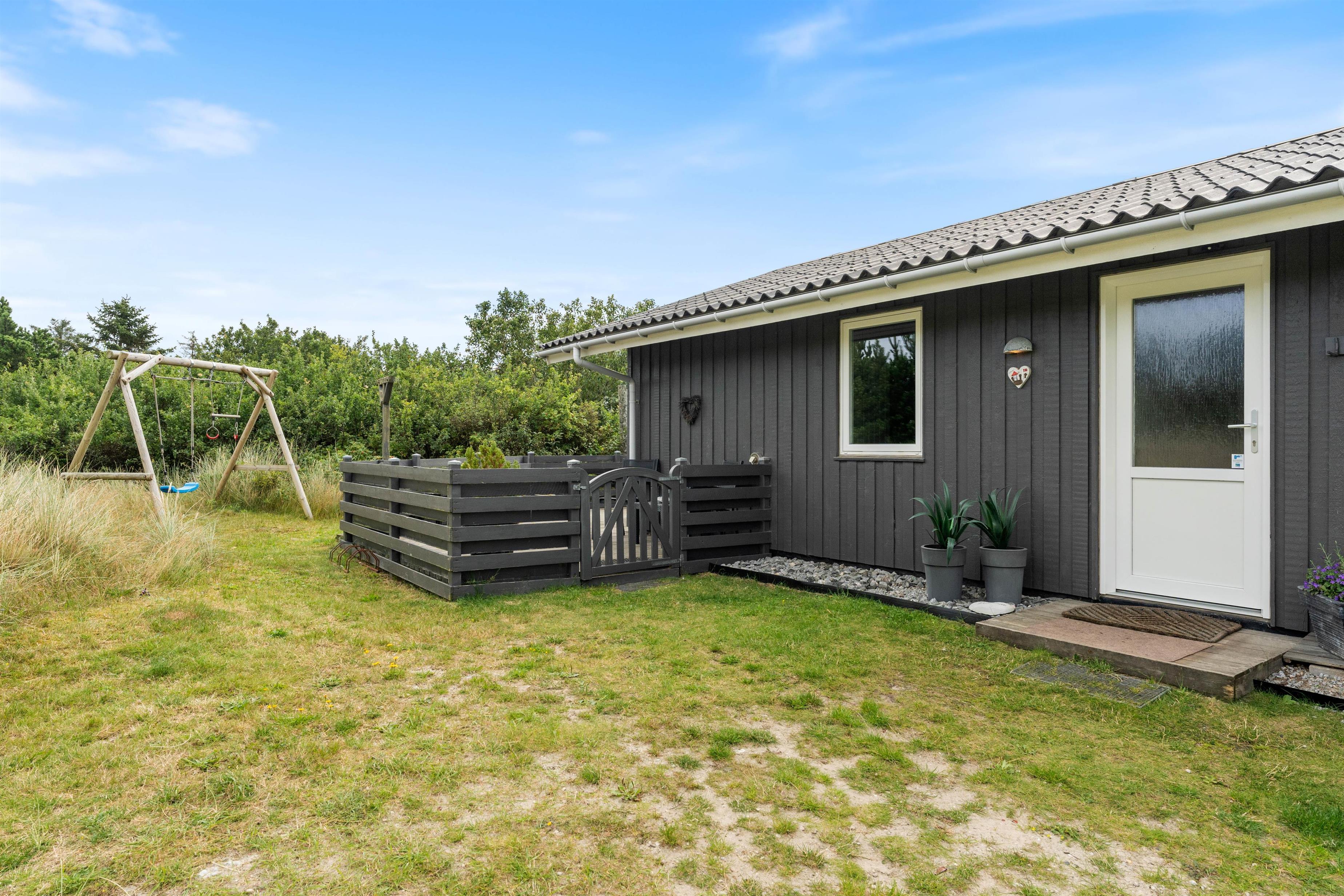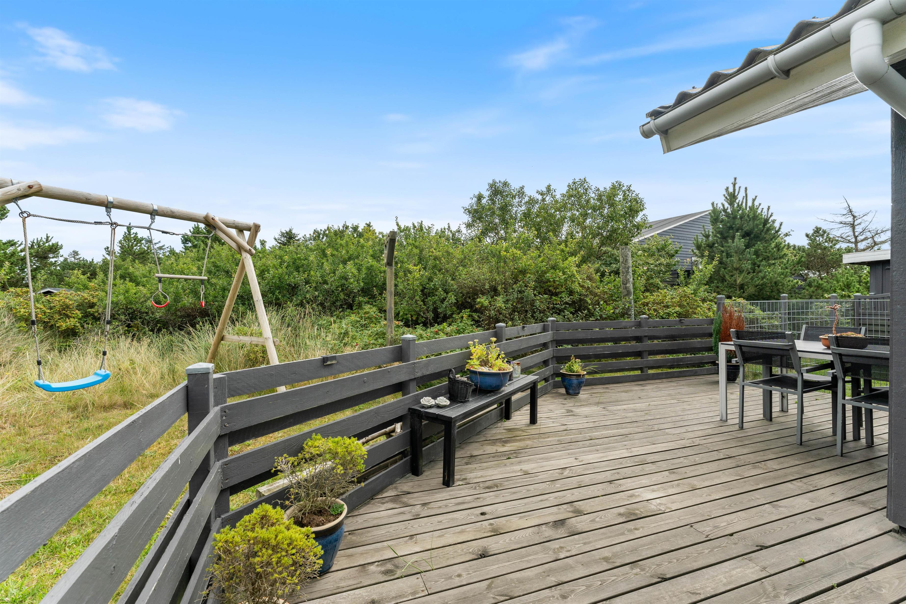 Den 1520 m² store lynggrund i klitlandskabet er nærmest indbegrebet af sommerhusferie på vestkysten, og den friske havluft giver røde kinder og en helt unik atmosfære, som ikke findes andre steder. Her er der også rigtig god plads til jeres hunde, som rigtigt kan boldtre sig uden I behøver bekymre jer. I kan roligt slippe hundene løs i det indhegnede område, børnene kan blive godt underholdt på gynge- og klatrestativet, og imens kan I rigtig nyde feriefreden og den velindrettede terrasse i skønne omgivelser.