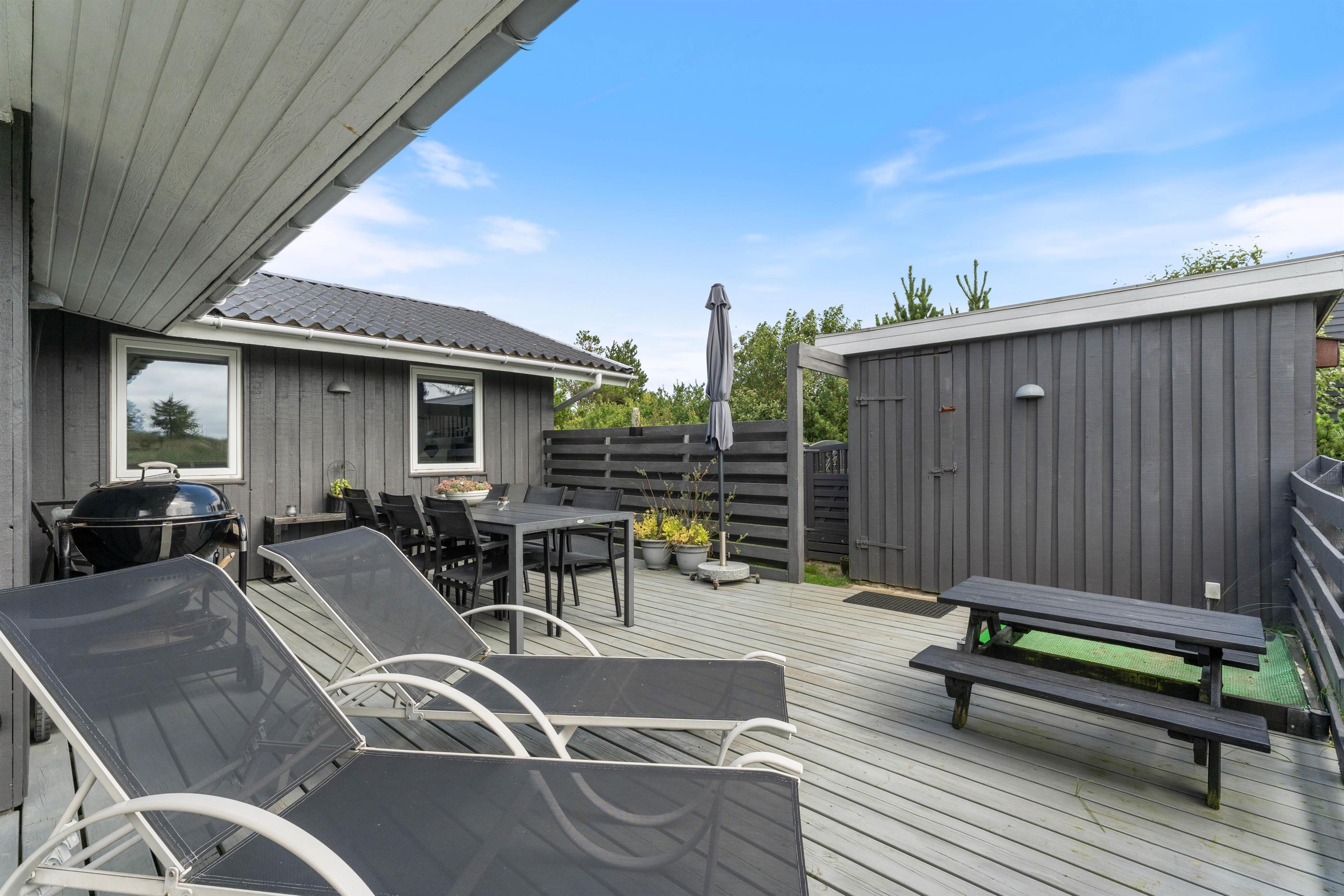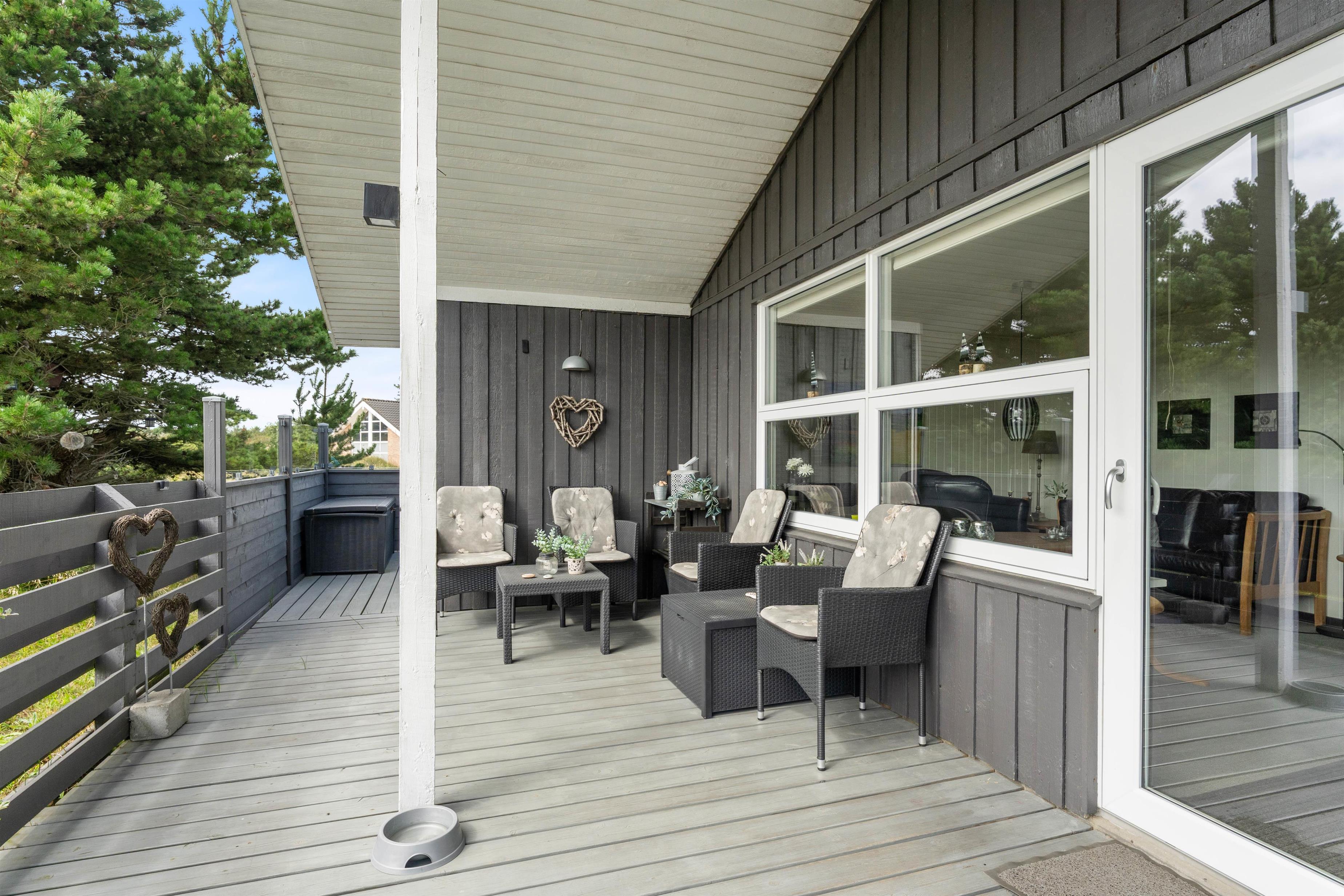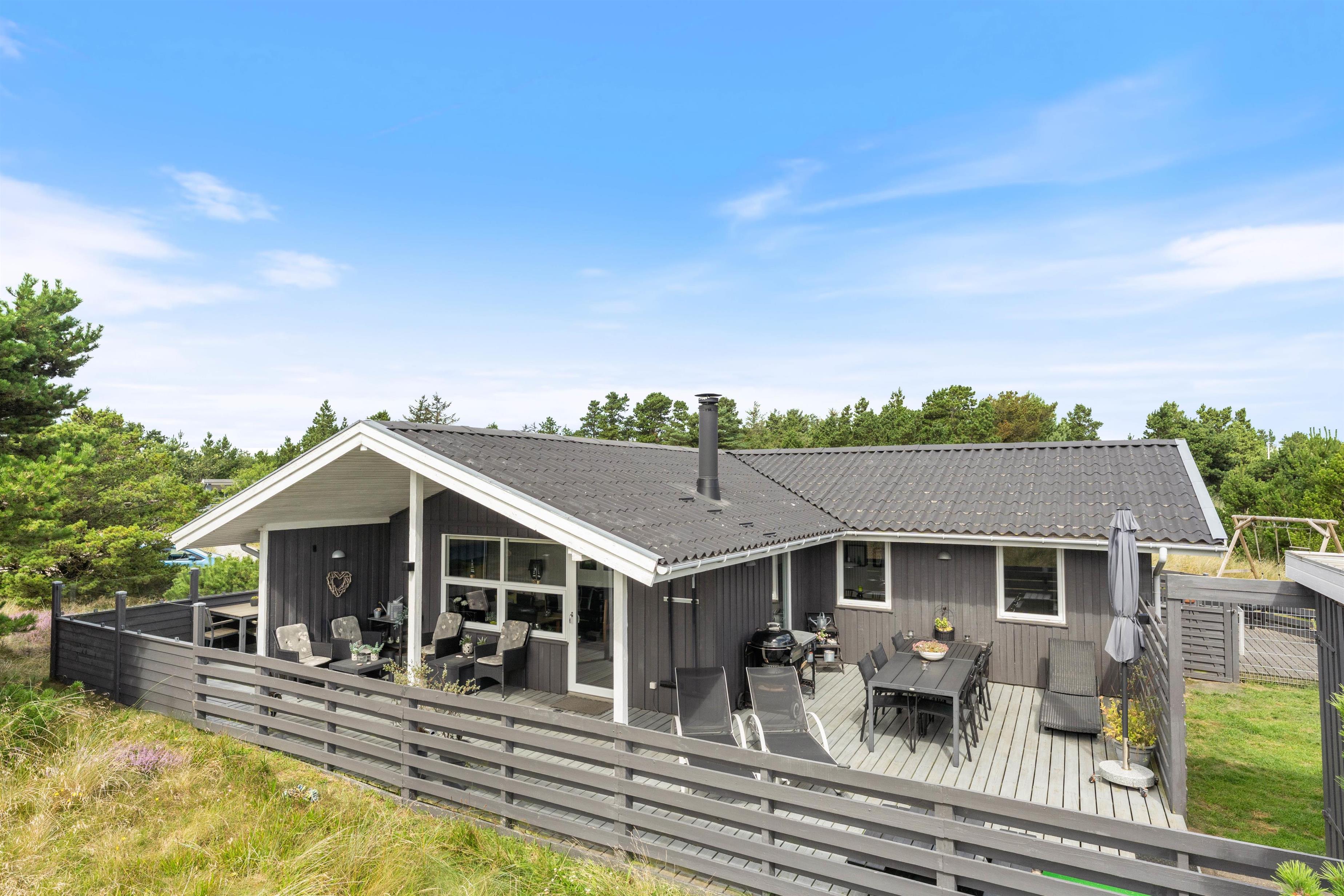 Den 1520 m² store lynggrund i klitlandskabet er nærmest indbegrebet af sommerhusferie på vestkysten, og den friske havluft giver røde kinder og en helt unik atmosfære, som ikke findes andre steder. Her er der også rigtig god plads til jeres hunde, som rigtigt kan boldtre sig uden I behøver bekymre jer. I kan roligt slippe hundene løs i det indhegnede område, børnene kan blive godt underholdt på gynge- og klatrestativet, og imens kan I rigtig nyde feriefreden og den velindrettede terrasse i skønne omgivelser.