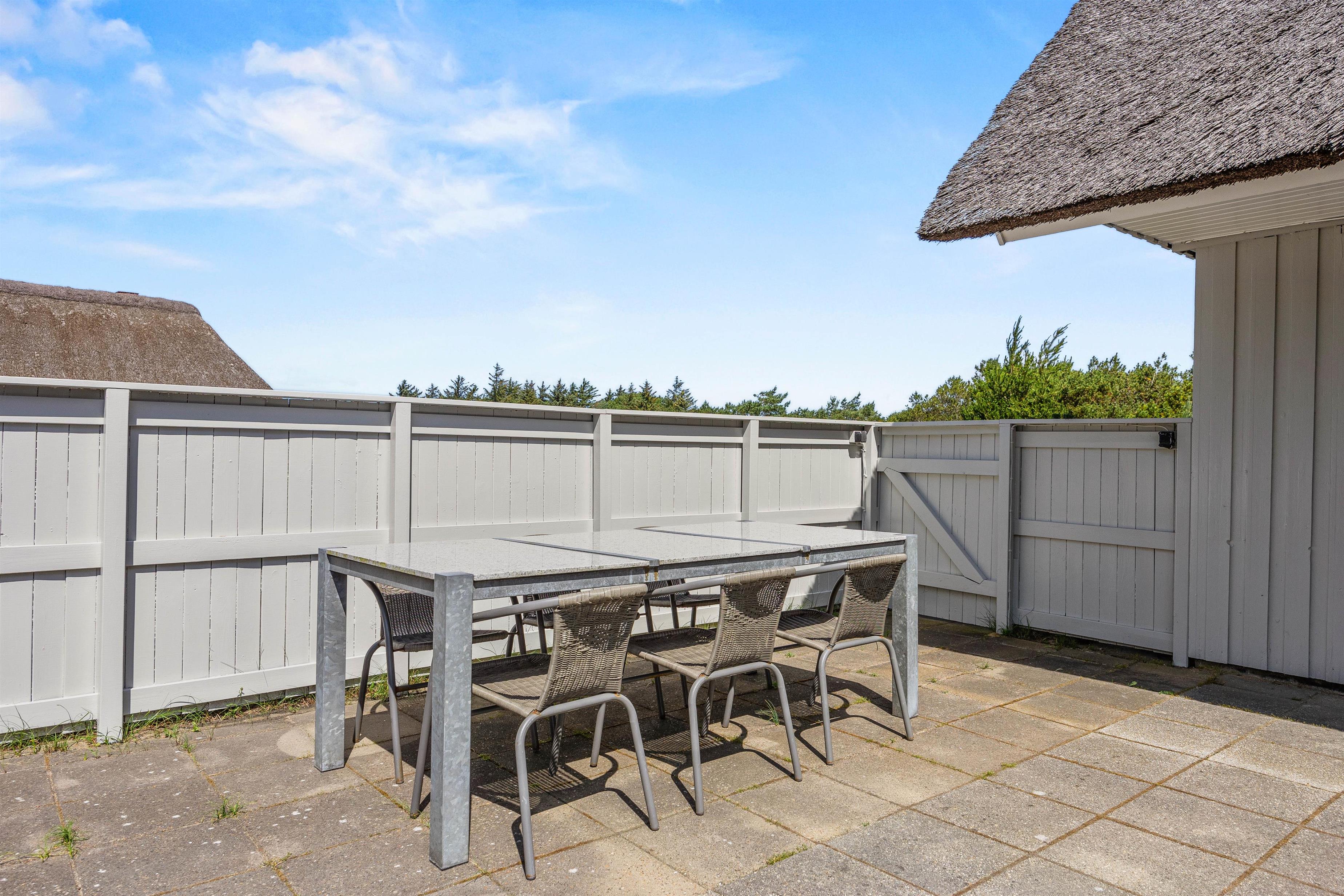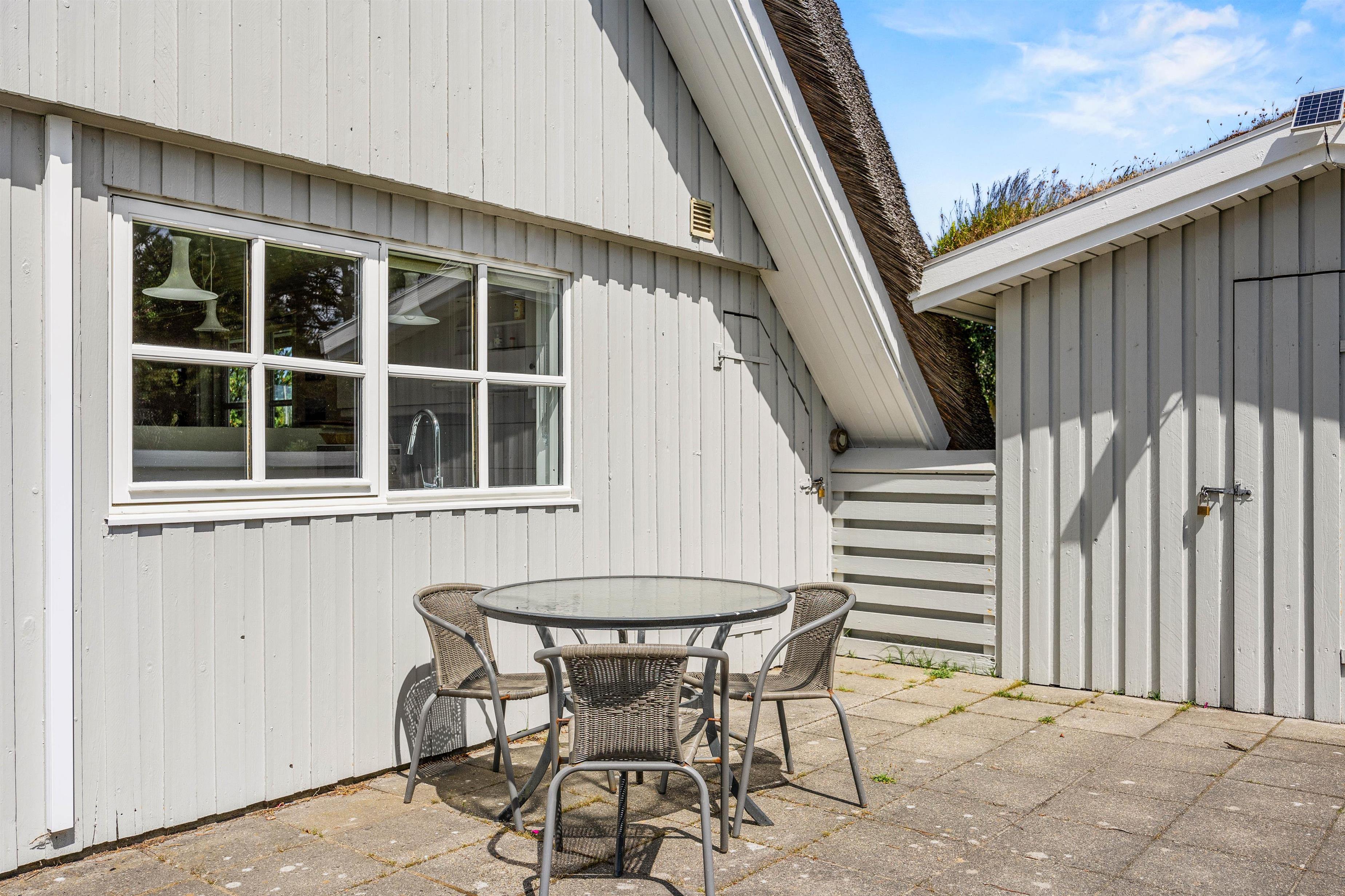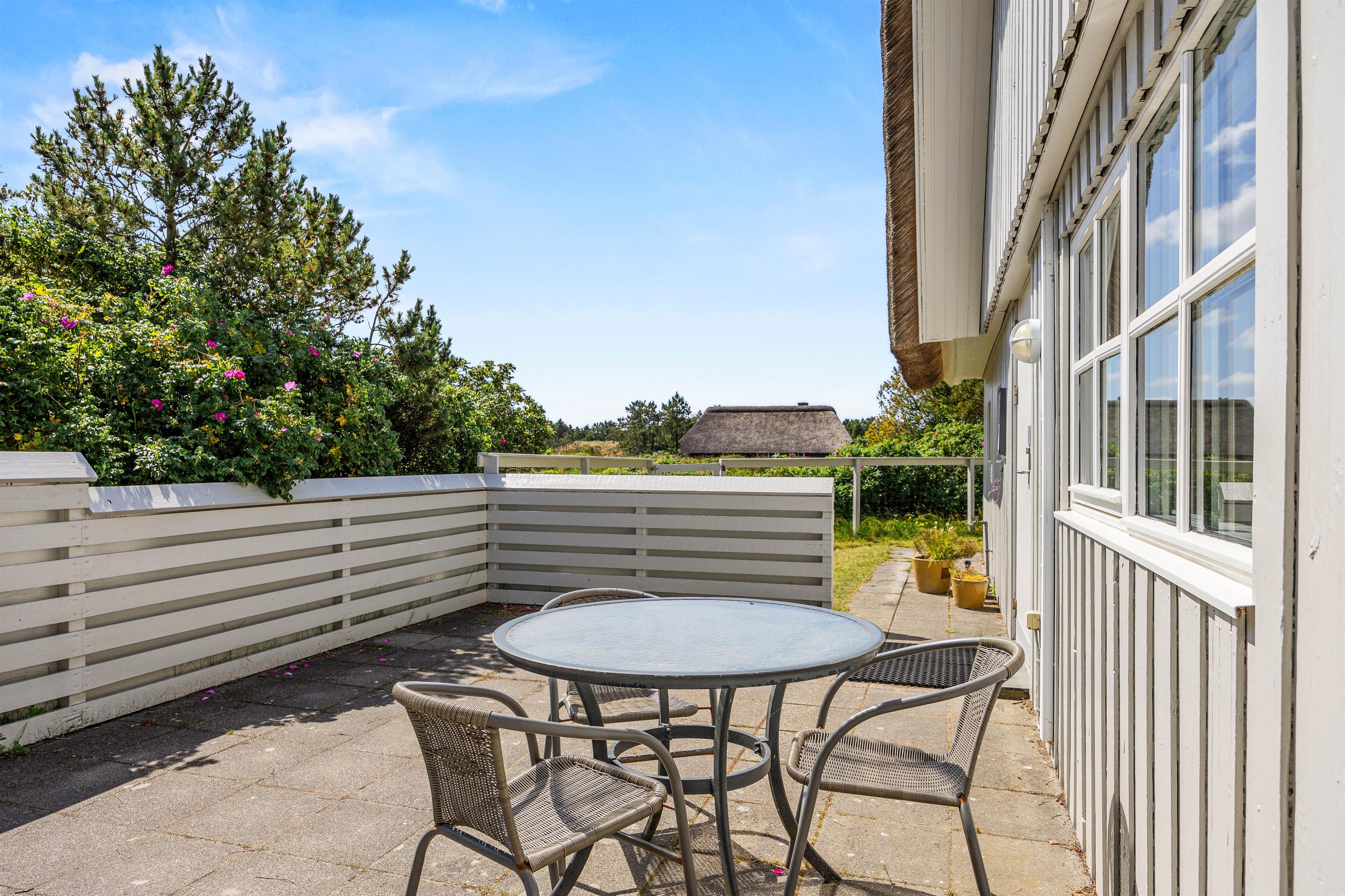 Fra sommerhuset kan I træde ud på terrassen, der er lukket – dermed vil I også kunne have jeres hund med ude på terrassen. På terrassen kan I nyde de solrige feriedage, og her står der havemøbler og liggestole klar til jer, så I kan sætte jer godt til rette på en god plads i solens stråler.