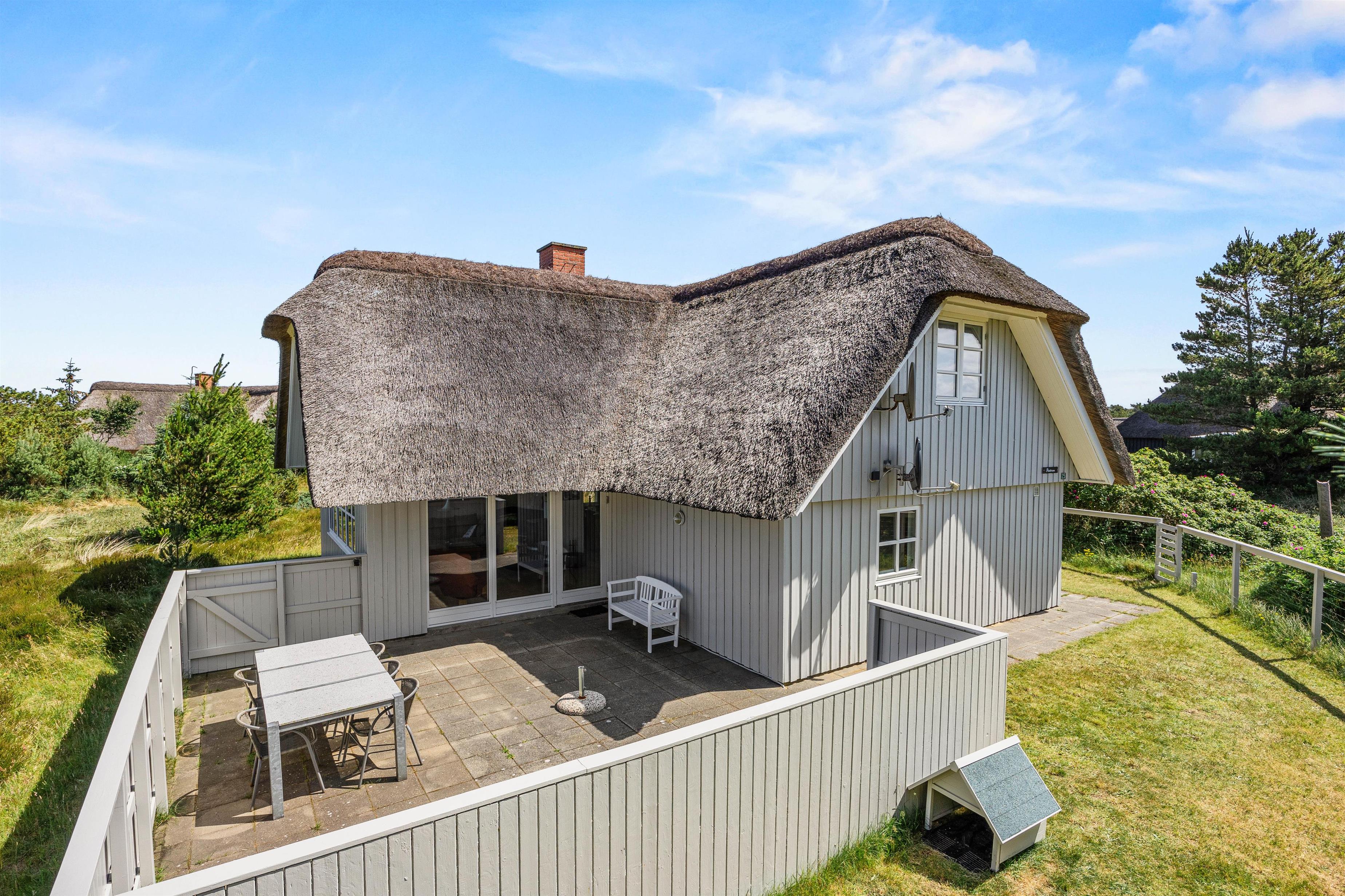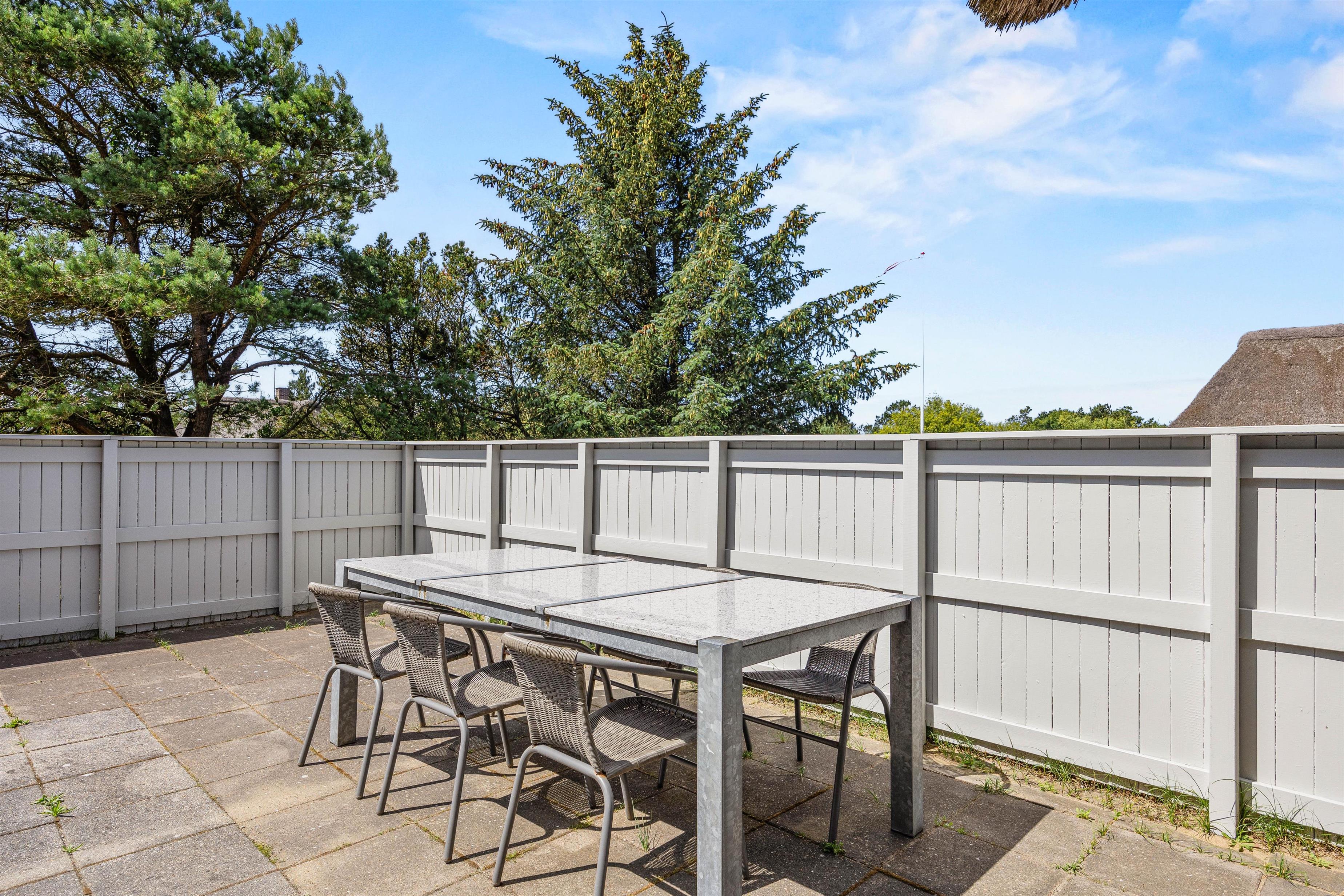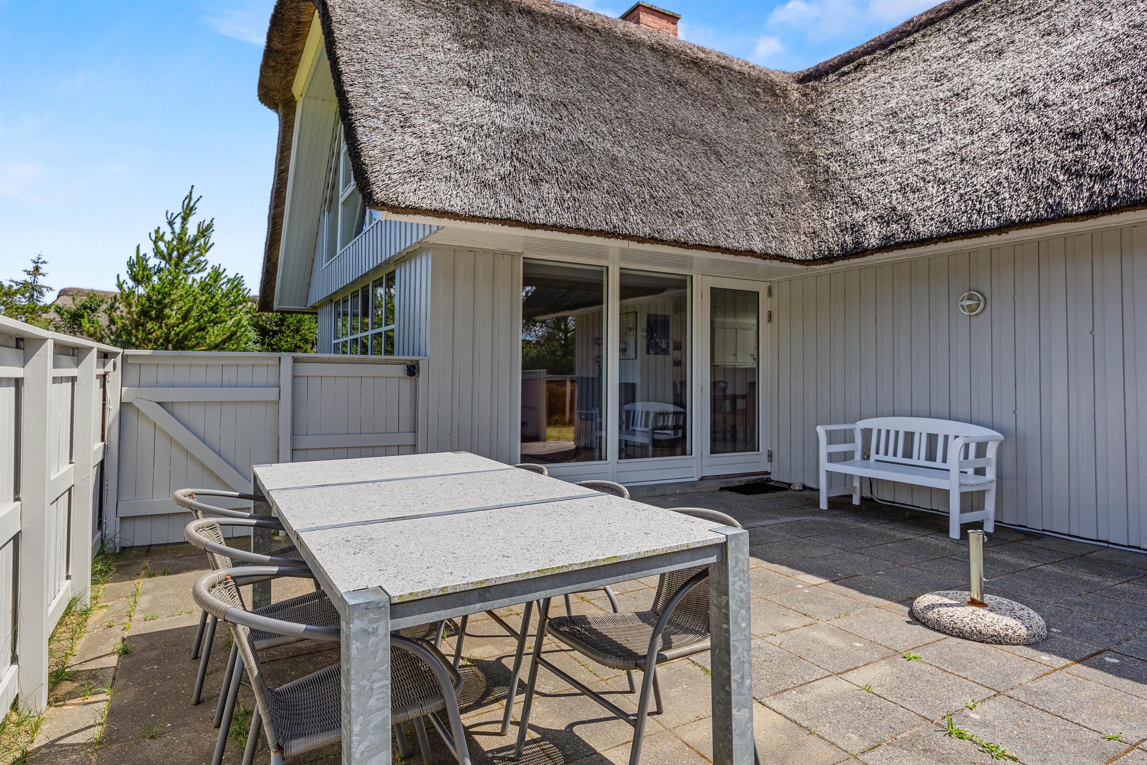 Fra sommerhuset kan I træde ud på terrassen, der er lukket – dermed vil I også kunne have jeres hund med ude på terrassen. På terrassen kan I nyde de solrige feriedage, og her står der havemøbler og liggestole klar til jer, så I kan sætte jer godt til rette på en god plads i solens stråler.